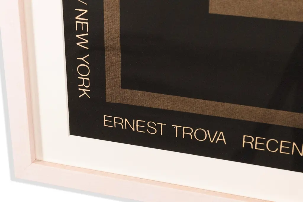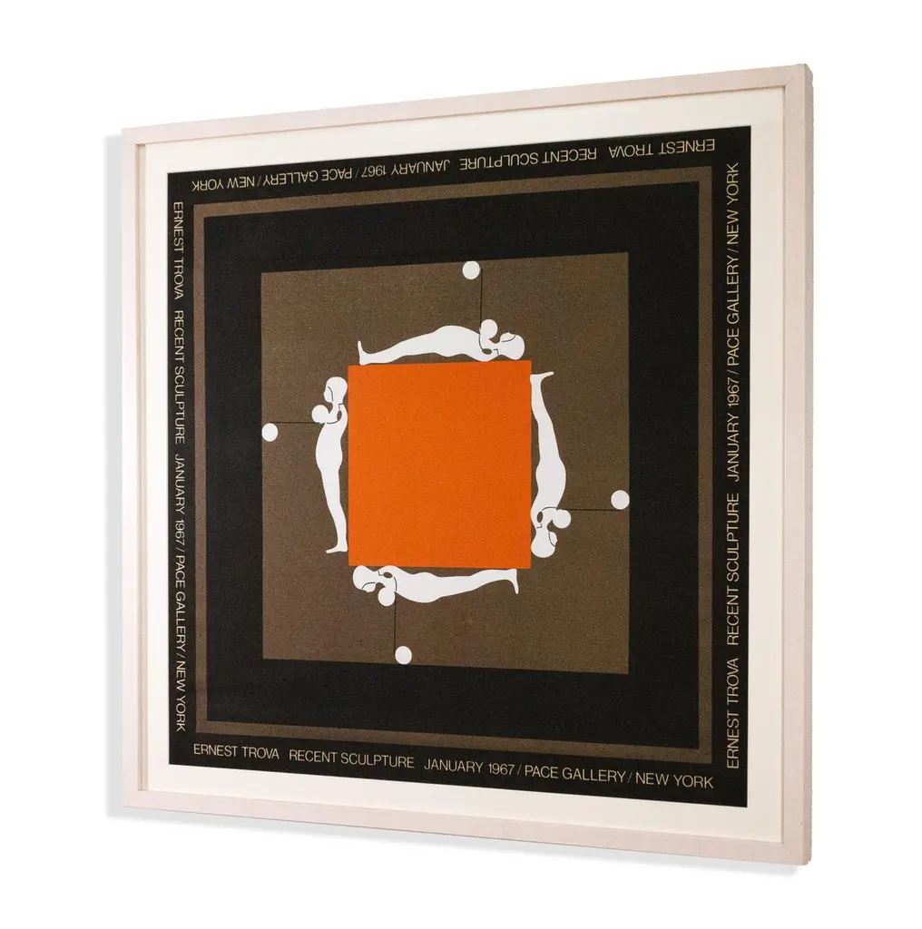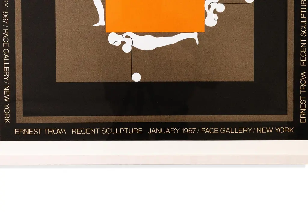 A modern lithographic poster featuring Ernest Trova at Pace Gallery New York in 1967. Published by Pace Editions. Ernest Tino Trova was a self-trained American surrealist and pop art painter and sculptor. Best known for his signature image and figure series, The Falling Man, Trova considered his entire output a single work in progress. From a private collection. Dimensions: 29"h x 29"w x 1.5"d (framed). In very good vintage condition.