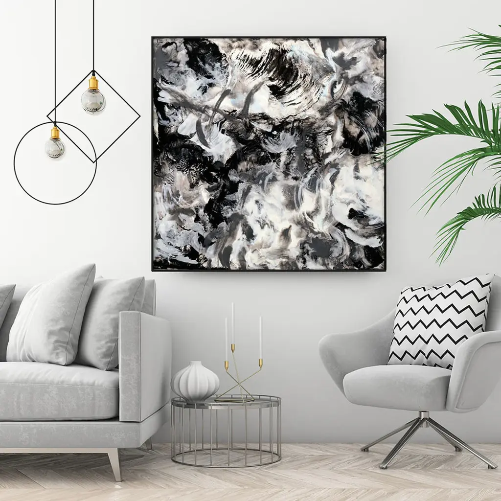 Your ready to hang artwork is printed on canvas then stretched and mounted to a 2-inch thick - hand stained black wood frame. Arrives at your door complete with an easy to use self-leveling hangking kit.