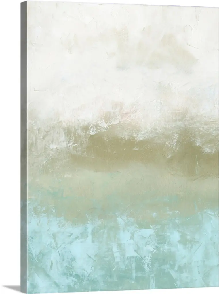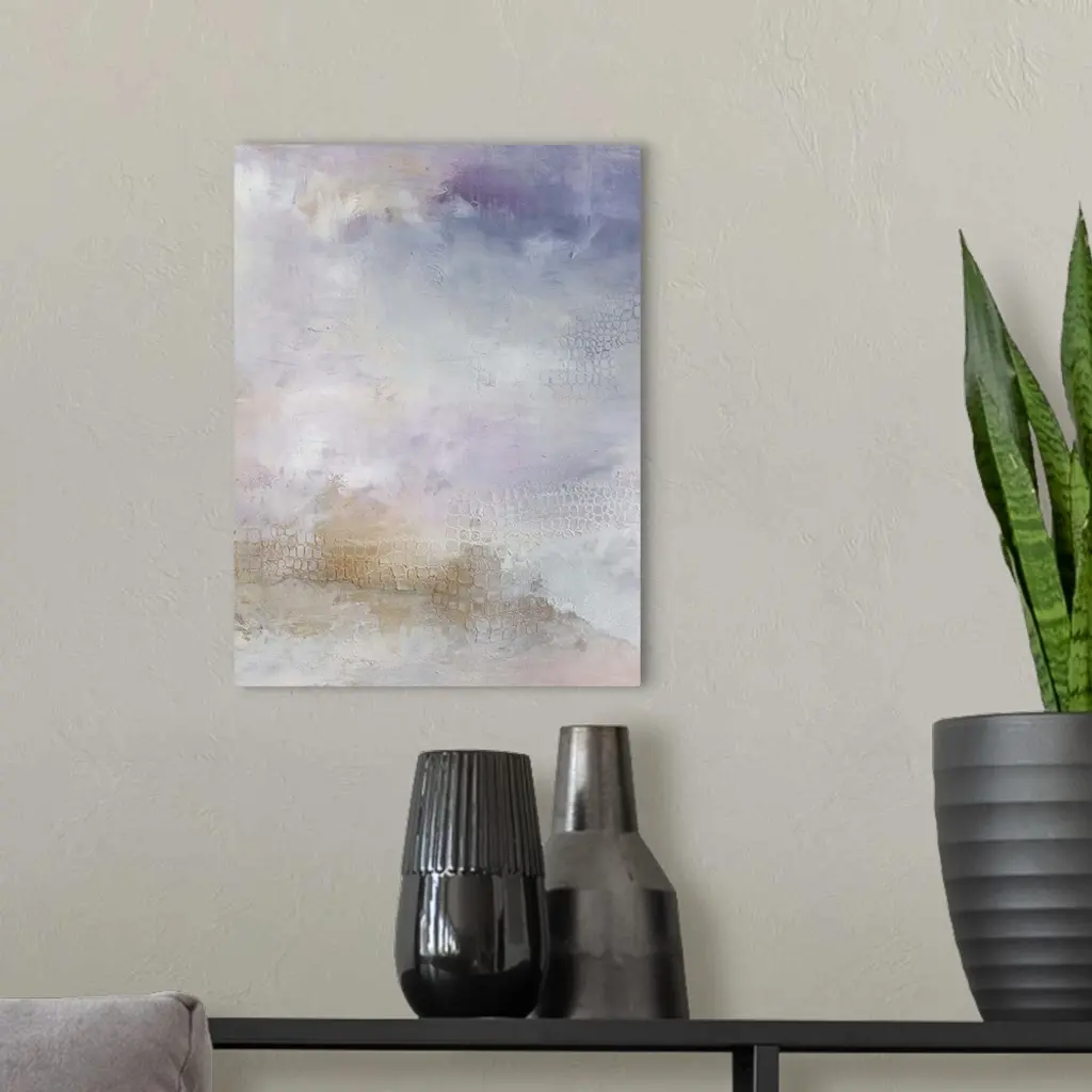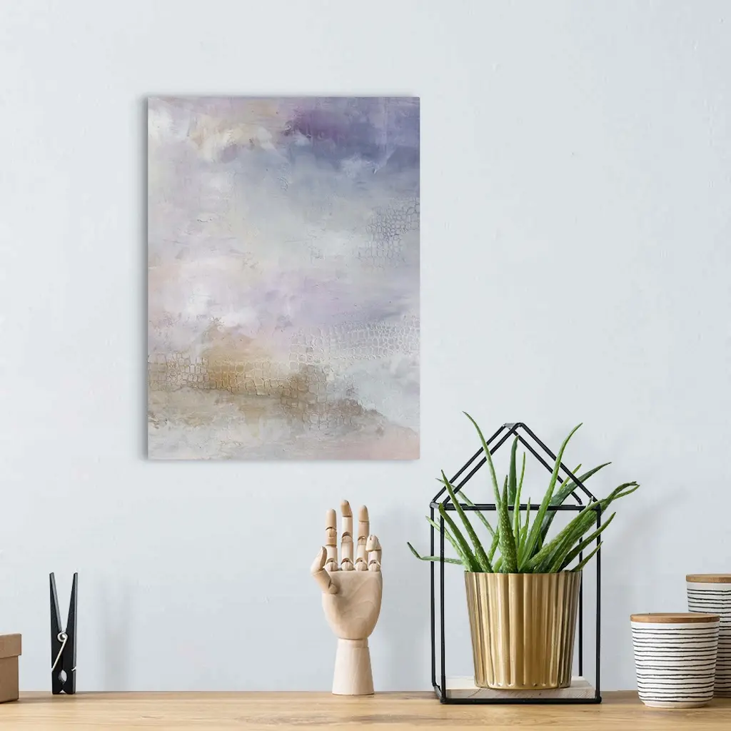 Contemporary abstract artwork in pastel white and purple tones, resembling an evening sky.