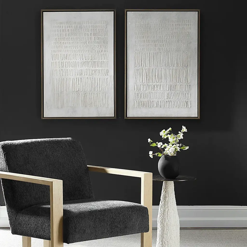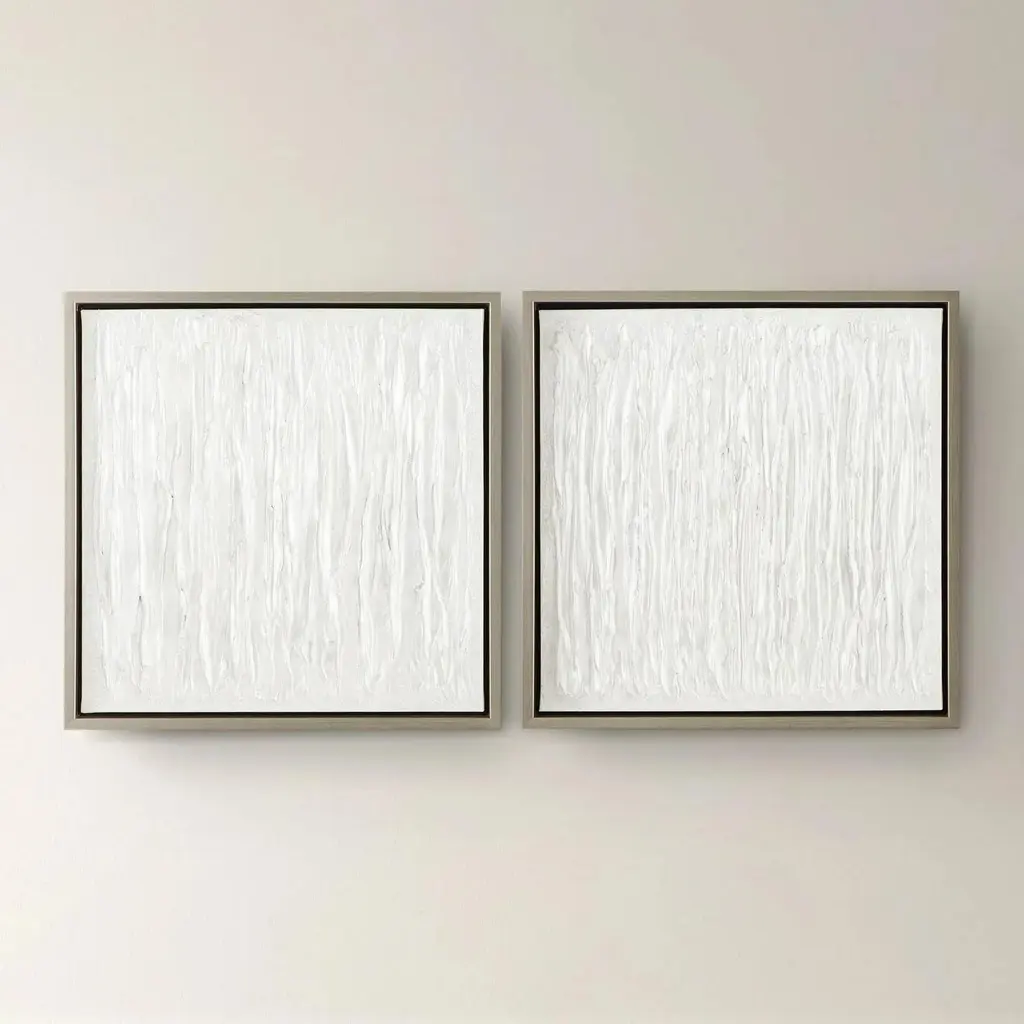 Elevate your space with Esda framed canvases, a sophisticated pair of abstract giclees featuring a refined tone-on-tone color palette with raised hand embellishment. Each piece is beautifully finished in gallery style frame with a warm driftwood stain, adding modern elegance to any room. Artwork by Vanna Lam.