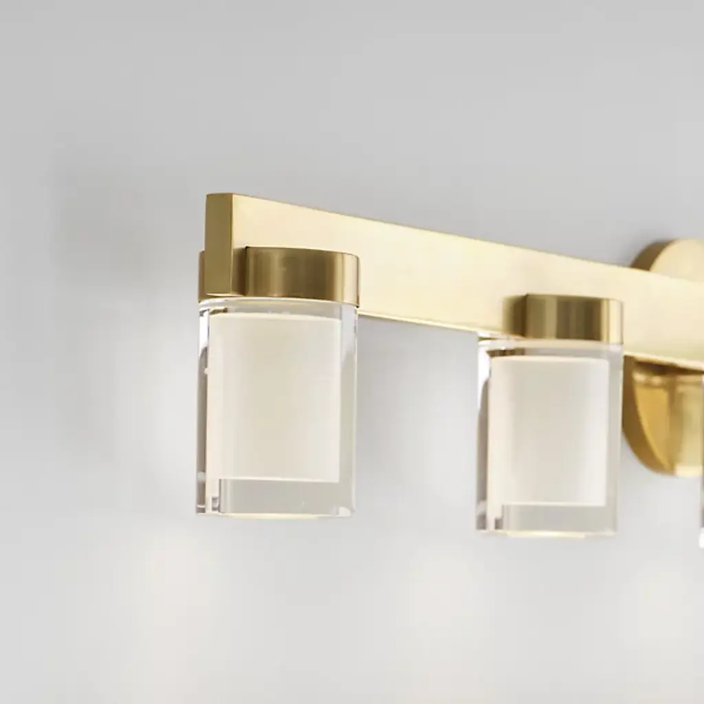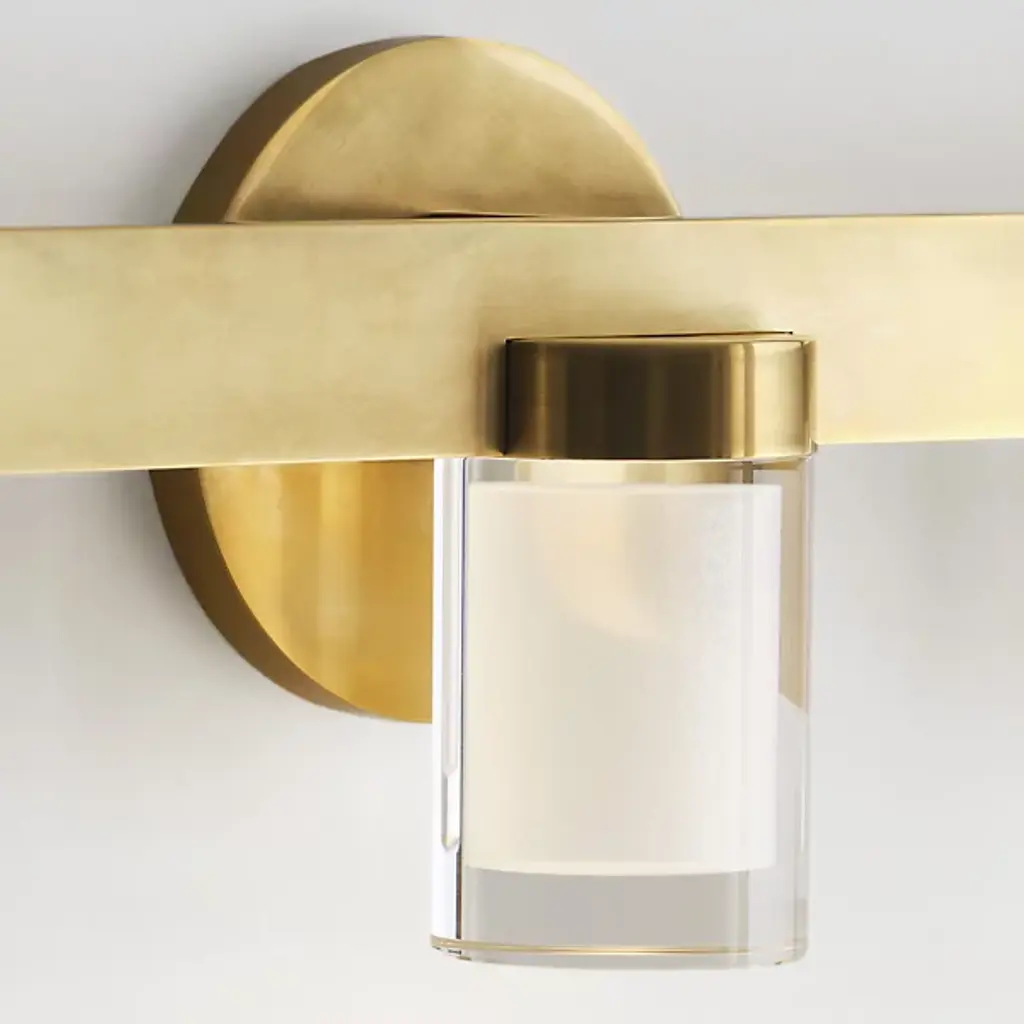 Meet the Esfera LED Vanity Light from Visual Comfort Modern, a testament to elemental materials and spatial symmetries. Designed by Kelly Wearstler, this fixture is a modern representation of cylindrical multi-dimensional prisms seamlessly merging with linear metal detailing. The simple, retro form is secured by a circular wall plate, with the integration of LED lamping within crystal cylinders extending from a horizontal bar that dispenses a gorgeous glow around it. The fixture is at once visually textured and straightforward, offering ADA-compliant and damp-listed functionality, creating a harmonious blend of mid-century modern and contemporary style, delivering refined form and potent function with its sophisticated design.