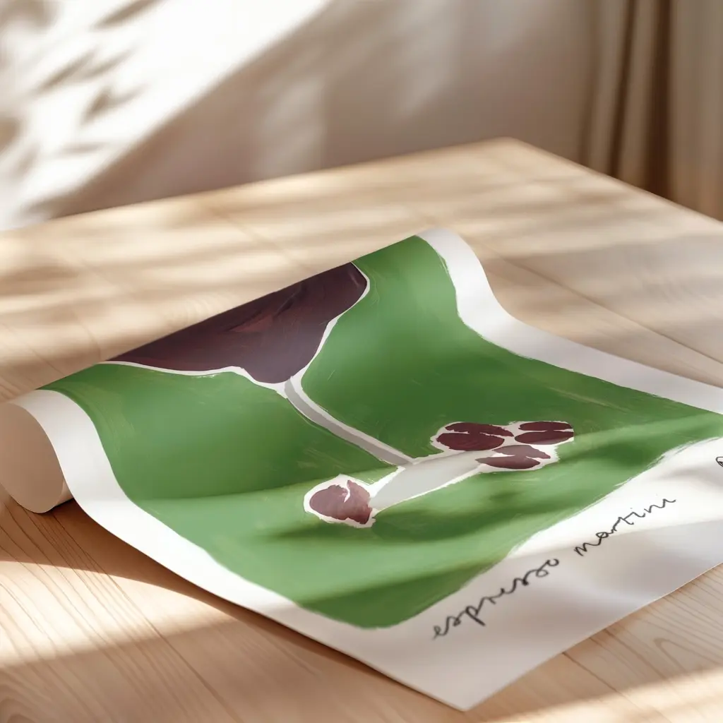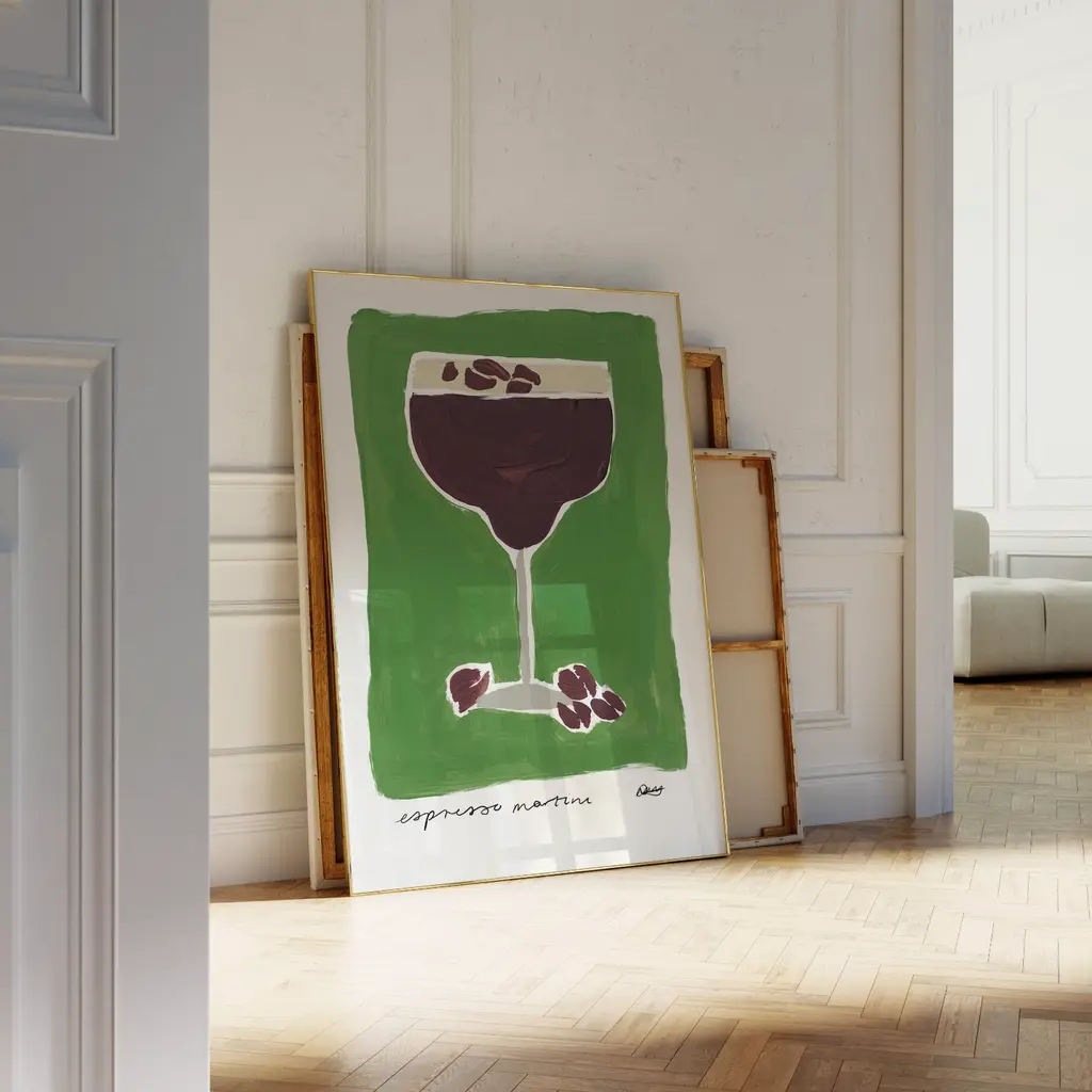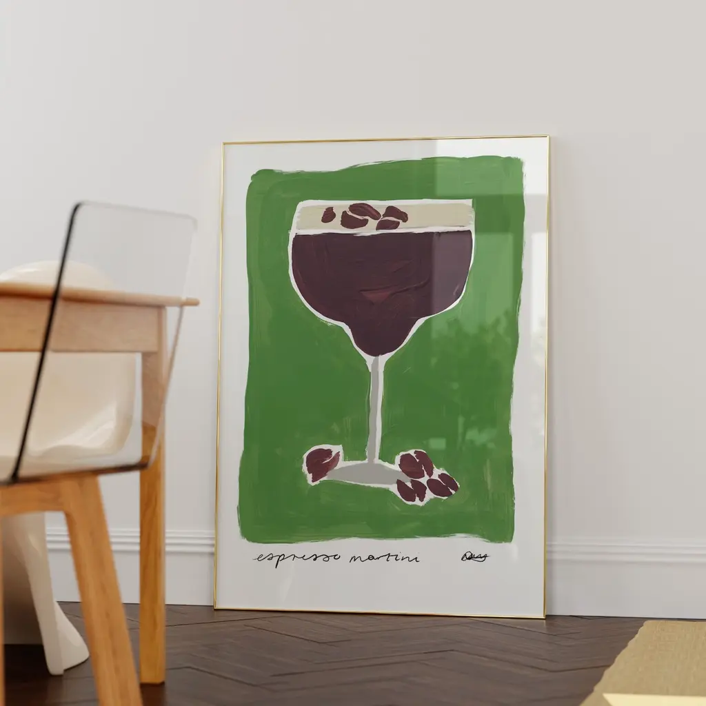 Espresso Martini Green Hand Painted Art Print - A3Hand painted by Natalie and made into a beautiful print, this print is a perfect addition to any home decor. Smooth fine art 230 gsm matte card. Printed with vivid colour and detail. Sold without a frame.