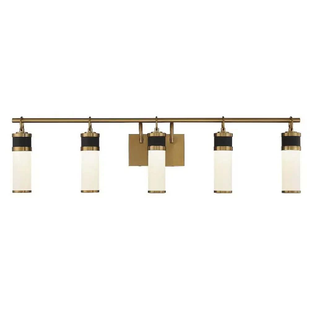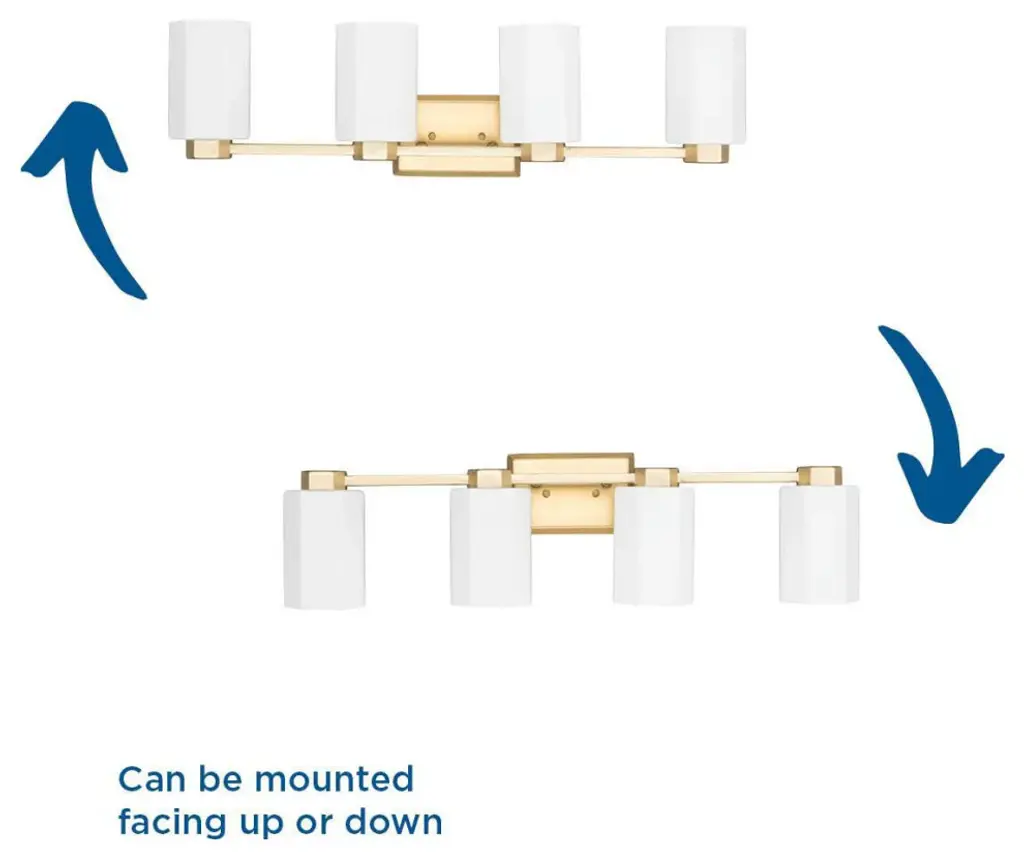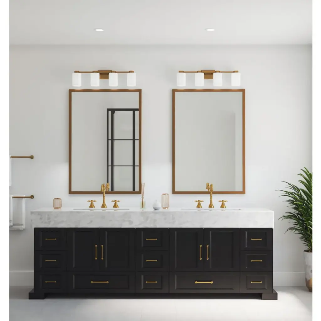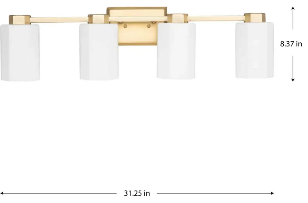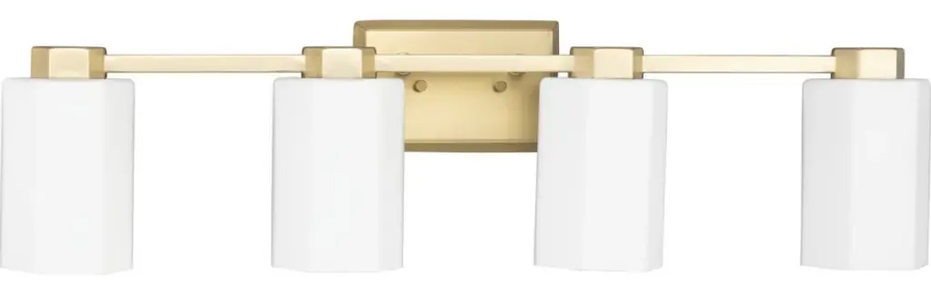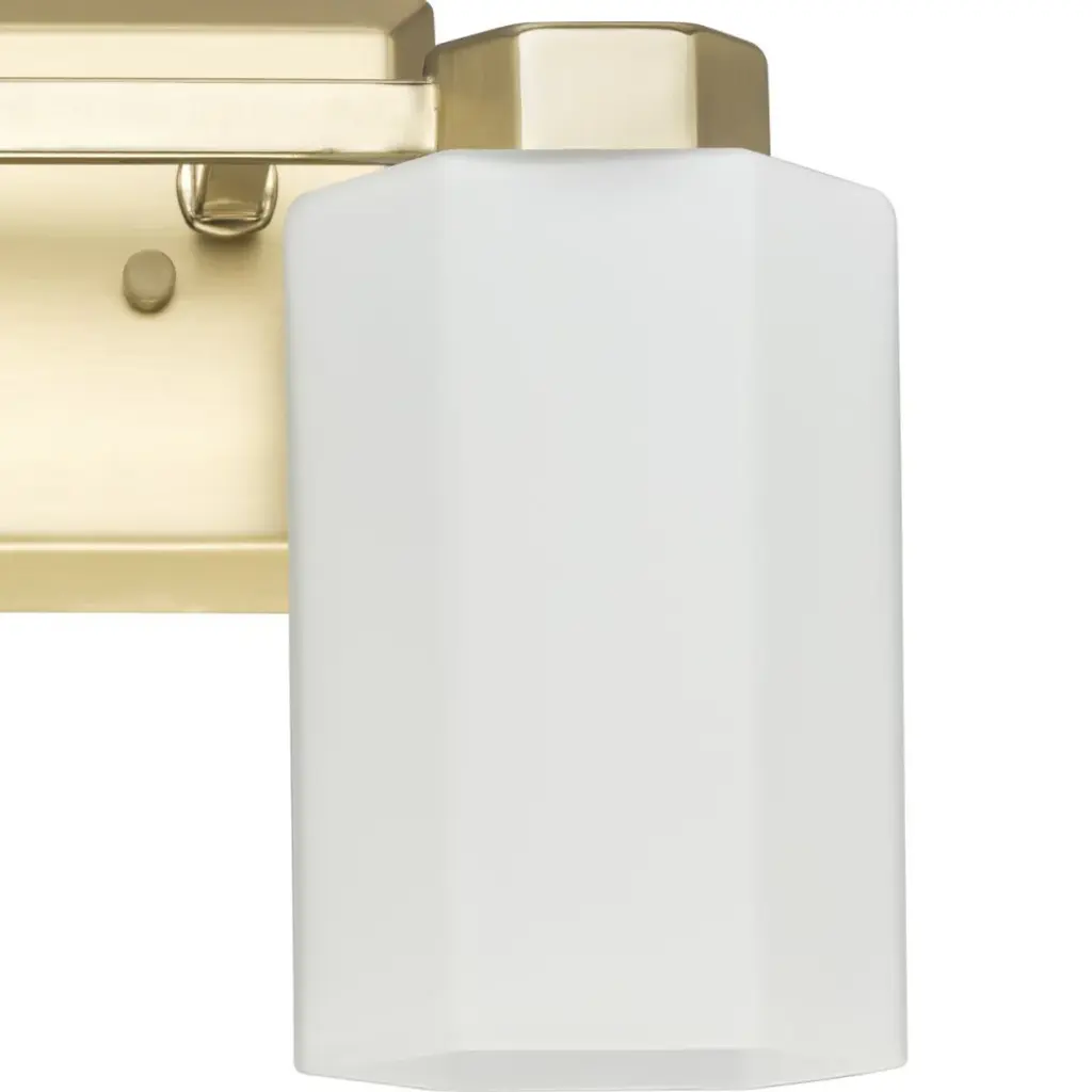 The Estrada Four-Light Vanity Light features a hexagonal motif, one of the most beautiful patterns that occurs frequently in nature. This classic shape is experiencing a revival in popularity as it is both timeless and modern at the same time. Faceted opal glass shades are fitted atop matching metal bases finished in elegant Brushed Gold.