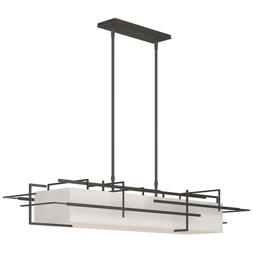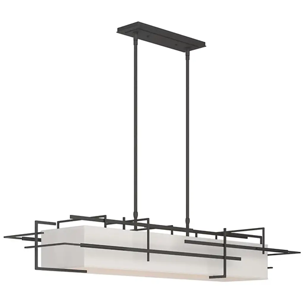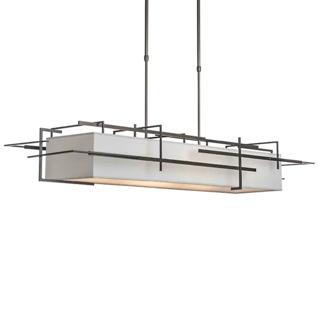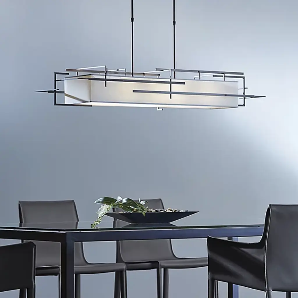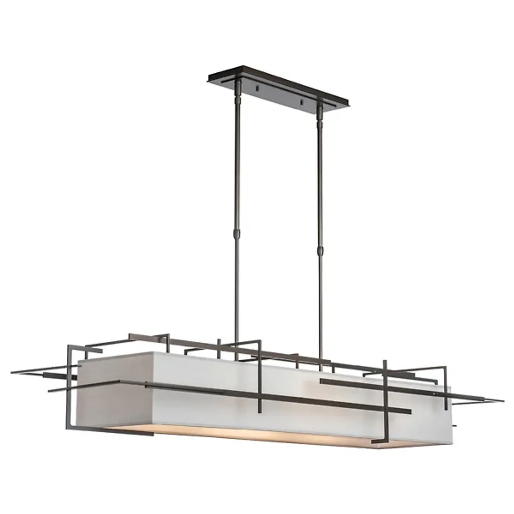 With all the striking beauty of an abstract art piece, the Etch Linear Suspension from Hubbardton Forge instantly enhances interiors. A stepped, rectangular canopy suspends twin downrods to uphold the box-shaped shade. Sharp and slender bands of steel form a chaotic yet supportive frame to surround the fabric shade and add a contemporary edge. Its lamping emits a warm light that is delicately filtered through the shade and into its environment to offer a soothing wash of ambient light.