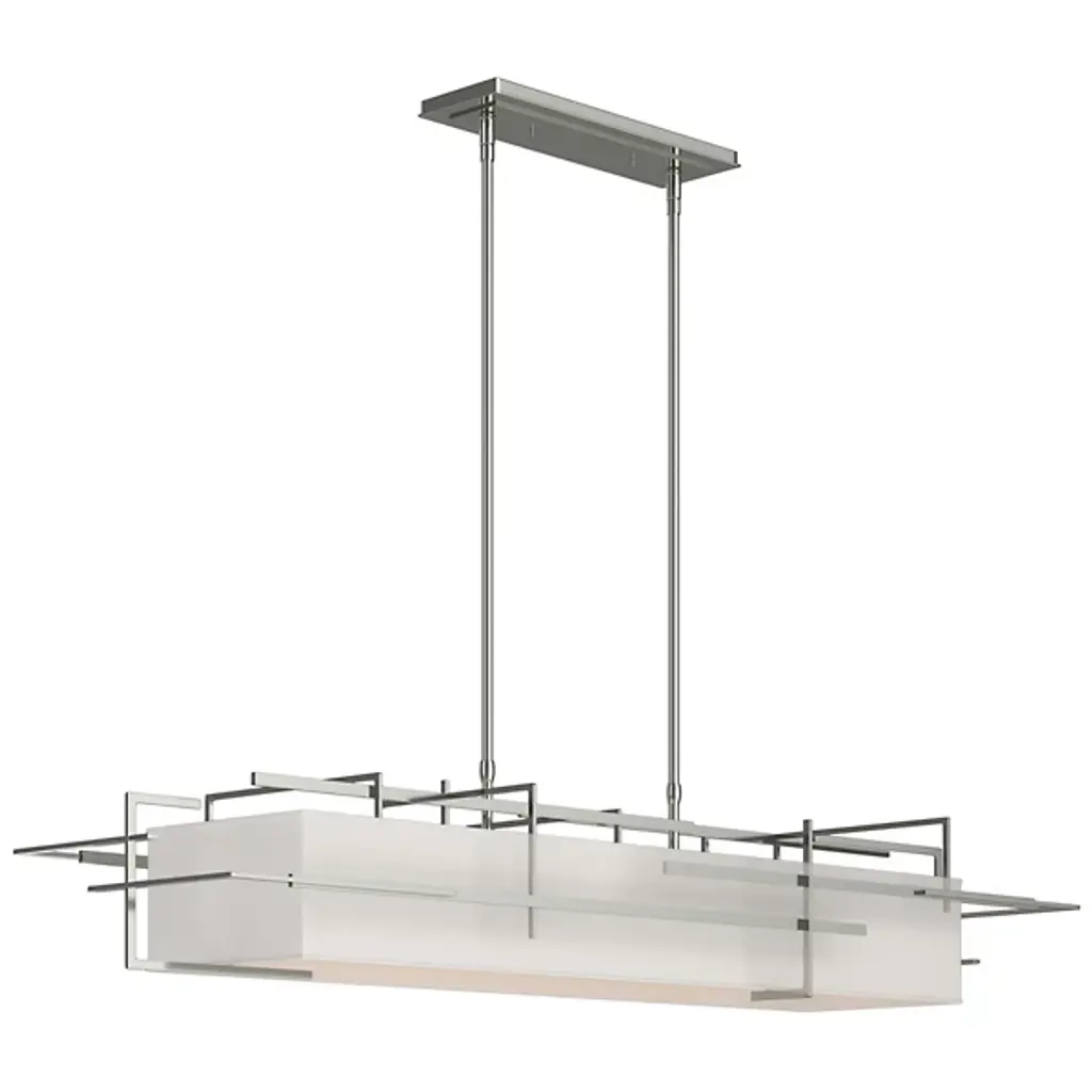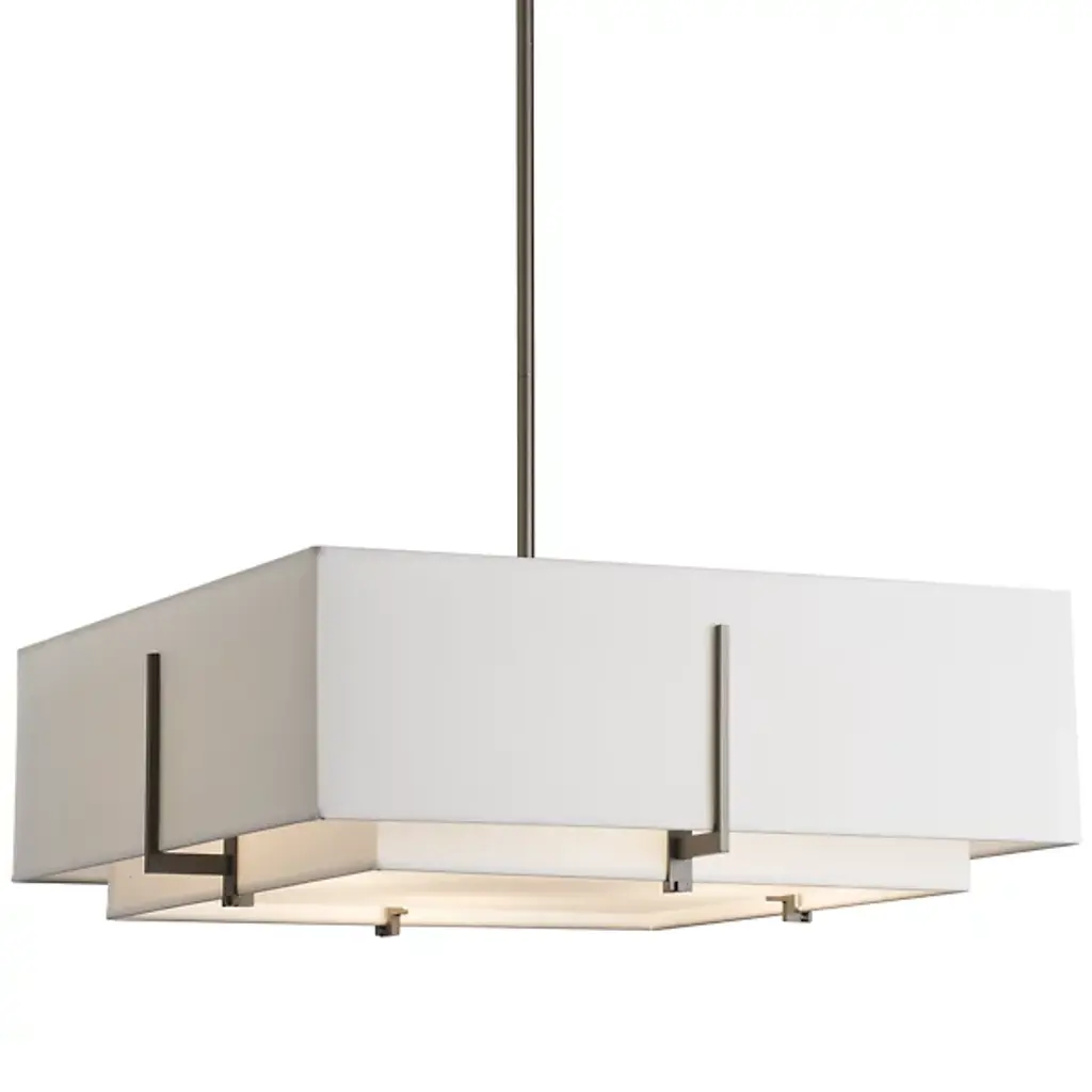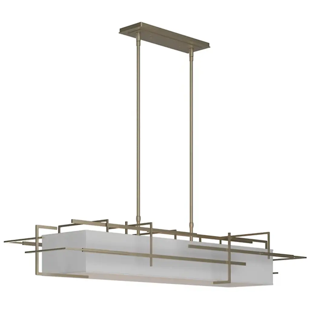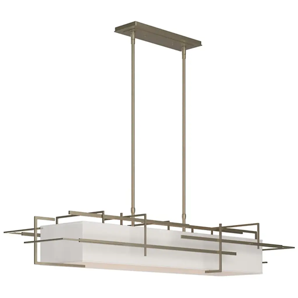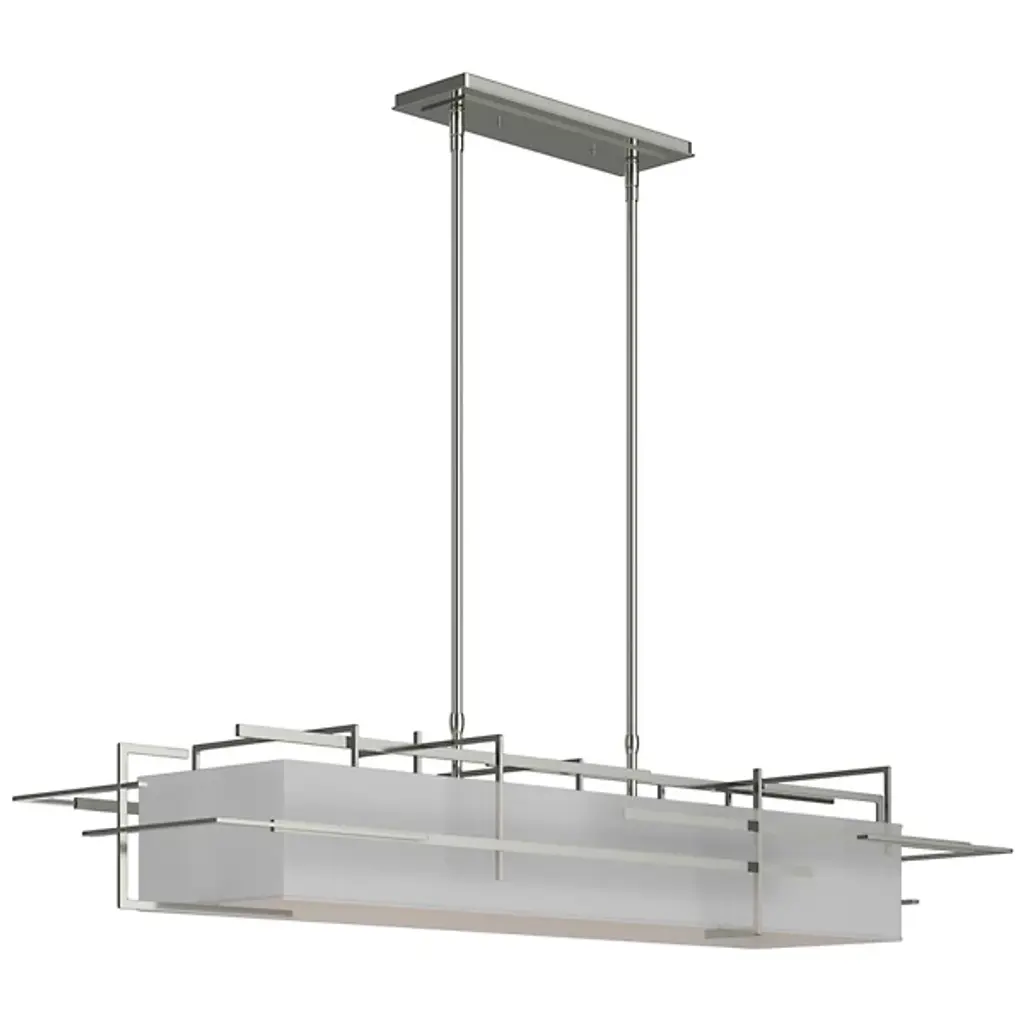 With all the striking beauty of an abstract art piece, the Etch Linear Suspension from Hubbardton Forge instantly enhances interiors. A stepped, rectangular canopy suspends twin downrods to uphold the box-shaped shade. Sharp and slender bands of steel form a chaotic yet supportive frame to surround the fabric shade and add a contemporary edge. Its lamping emits a warm light that is delicately filtered through the shade and into its environment to offer a soothing wash of ambient light.