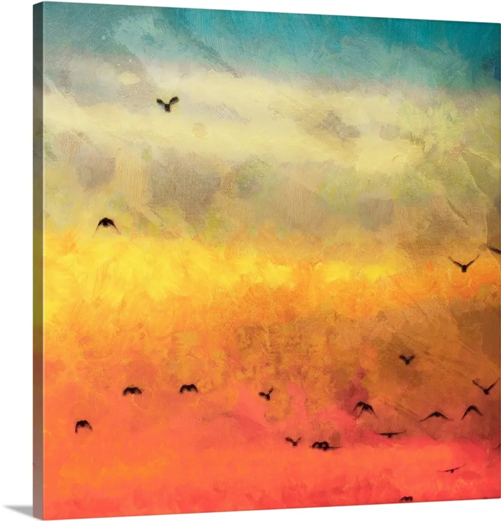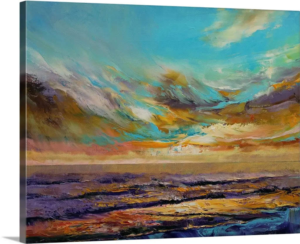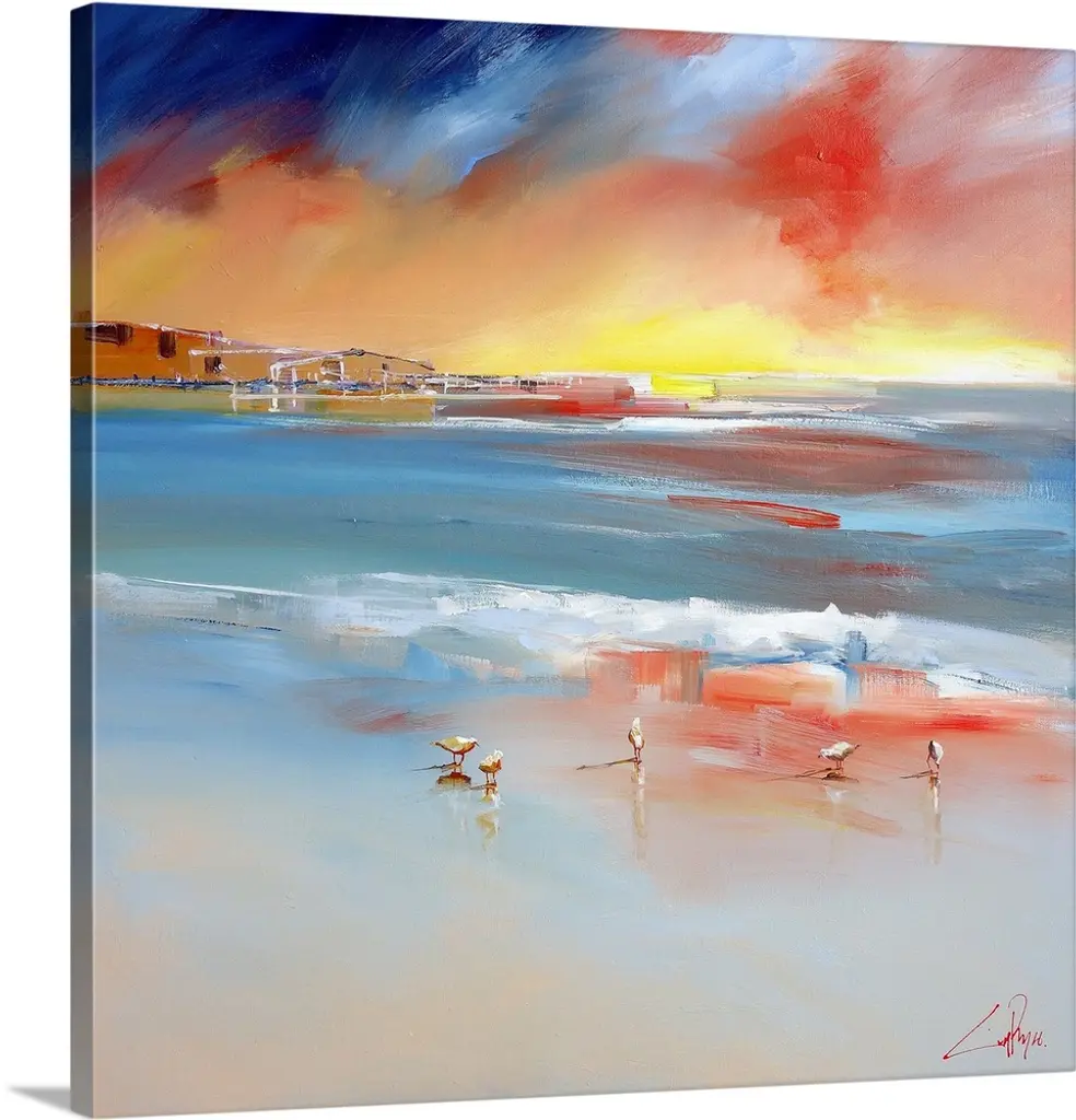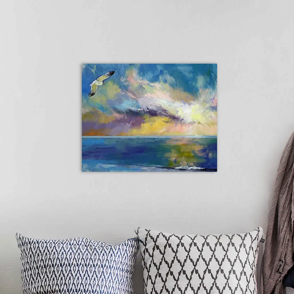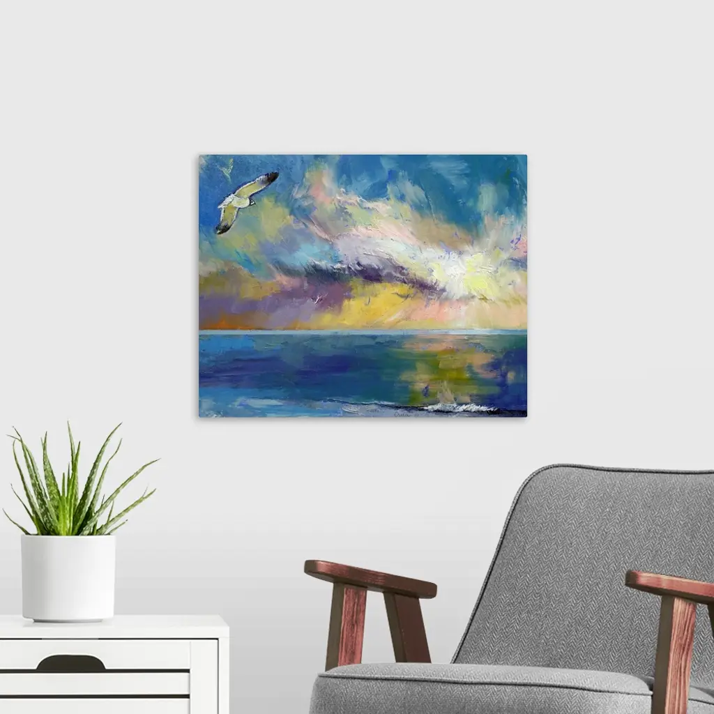 Giclee print of an oil painting depicting a seagull flying through a colorful sky reflecting in the water.