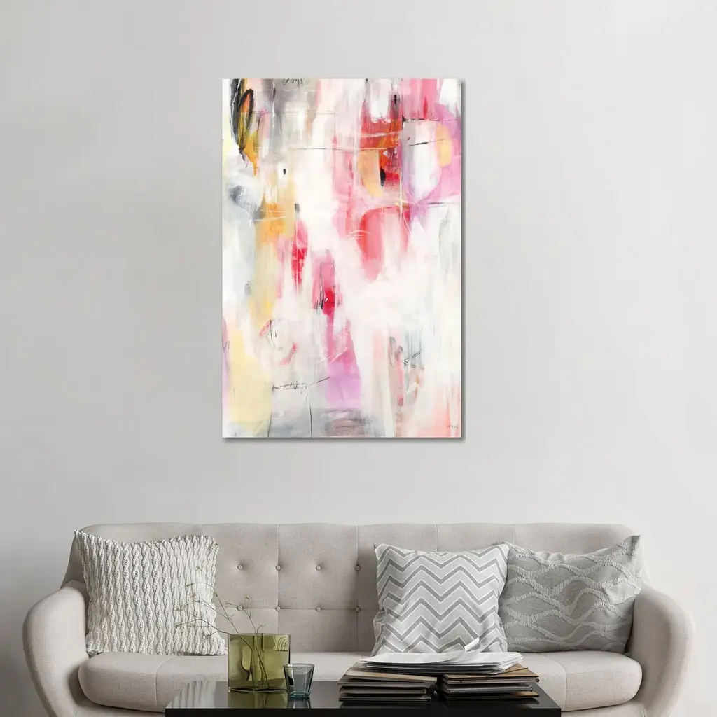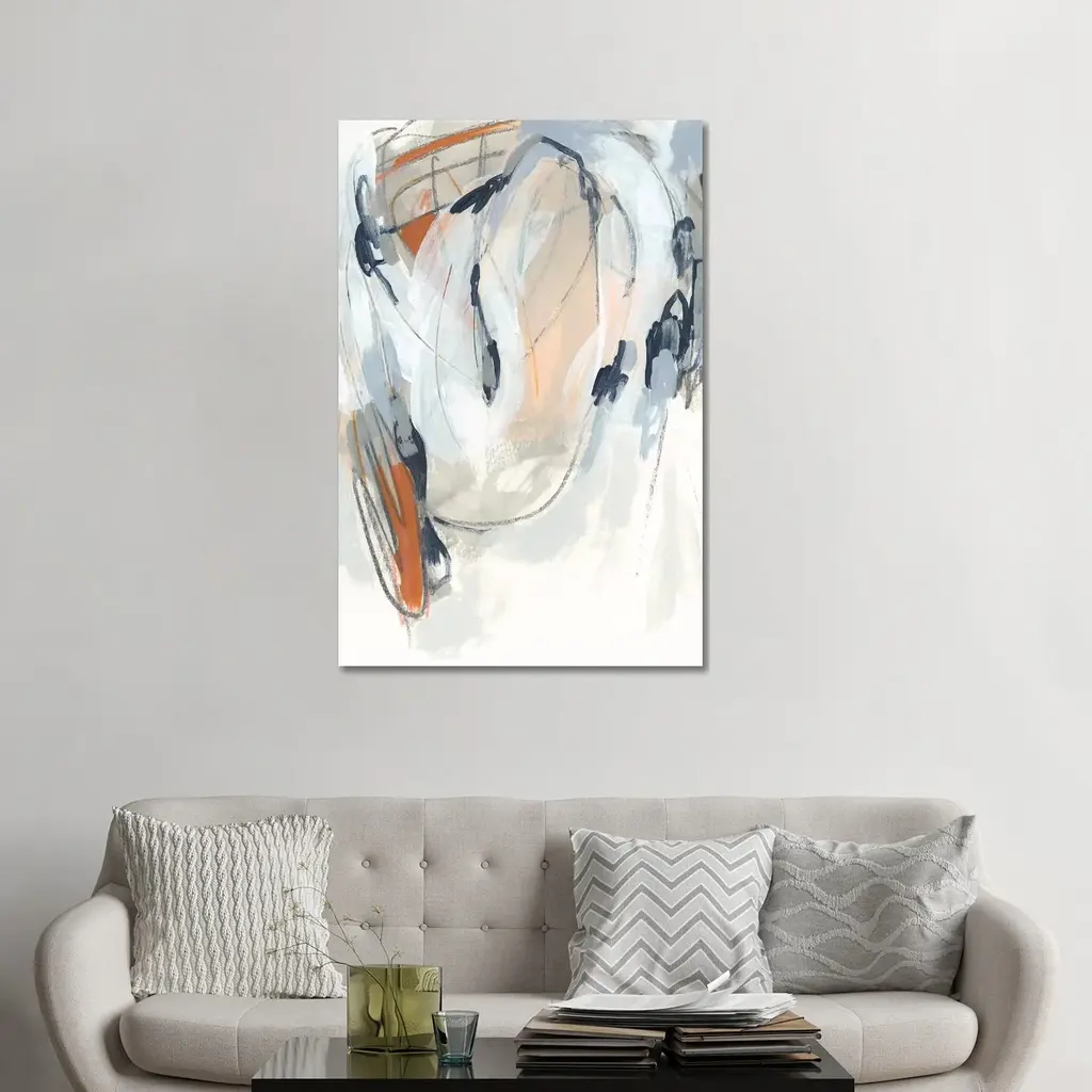 This artwork is a striking addition with its abstract design in neutral white and grey with noticeable pops of color. Available in smaller or larger sizes, it easily scales as a main focus above the sofa or as an accent piece in a bedroom or office. Additional sizes are available. Please contact support@alicelanehome.com for more information.
