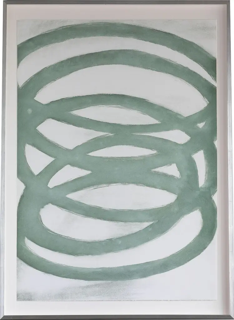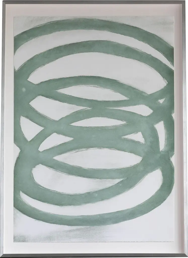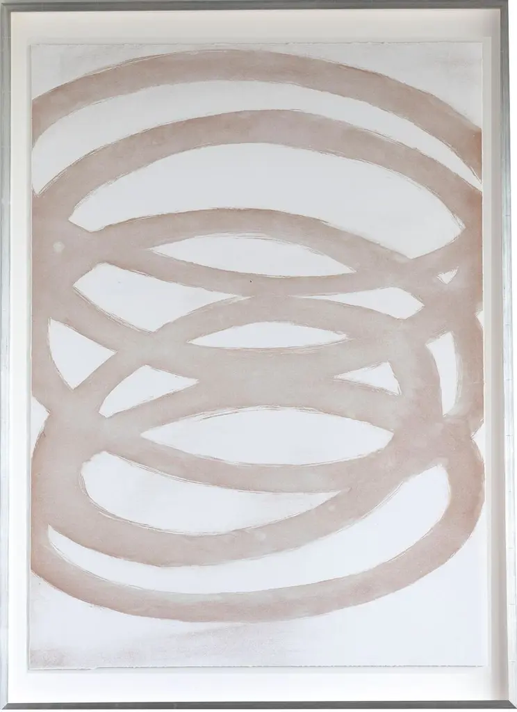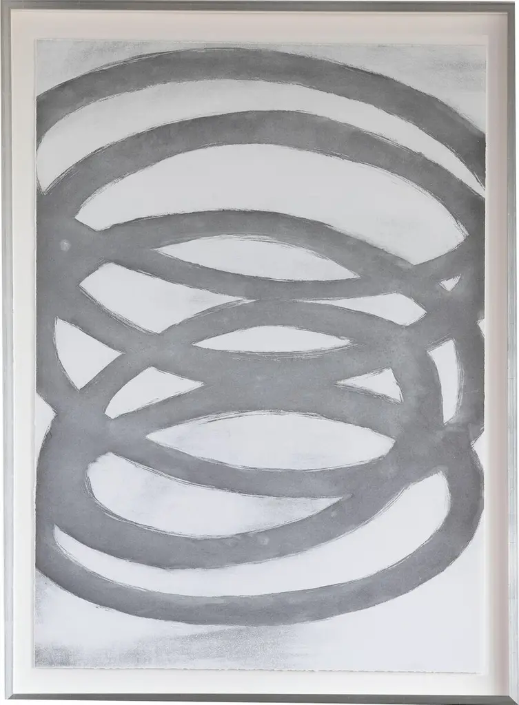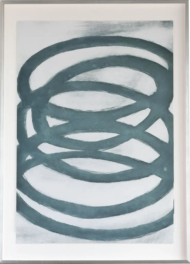 The interlocking ovals are almost reminiscent of cartoon drawings of cyclones, yet the ultimate effect is one of serenity. Printed on heavy cotton rag paper, this print arrives framed and ready to hang.