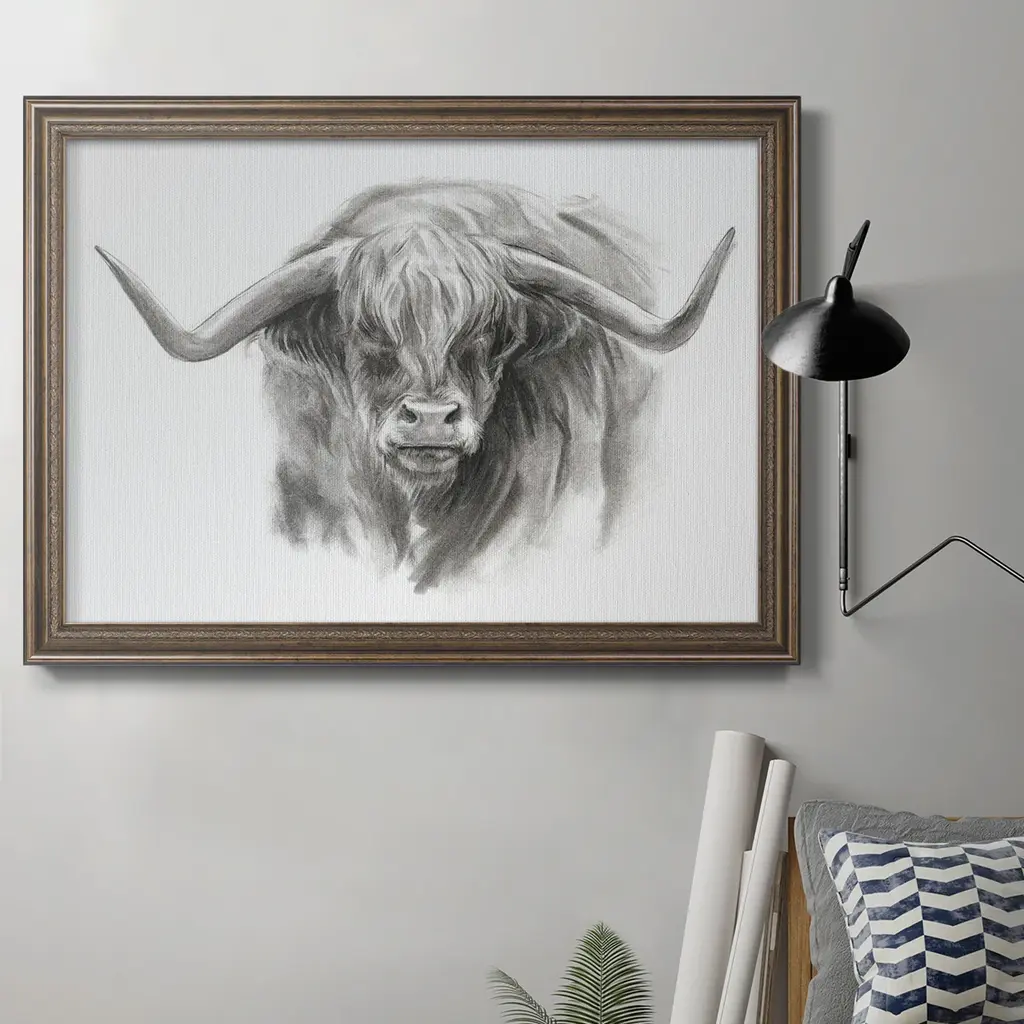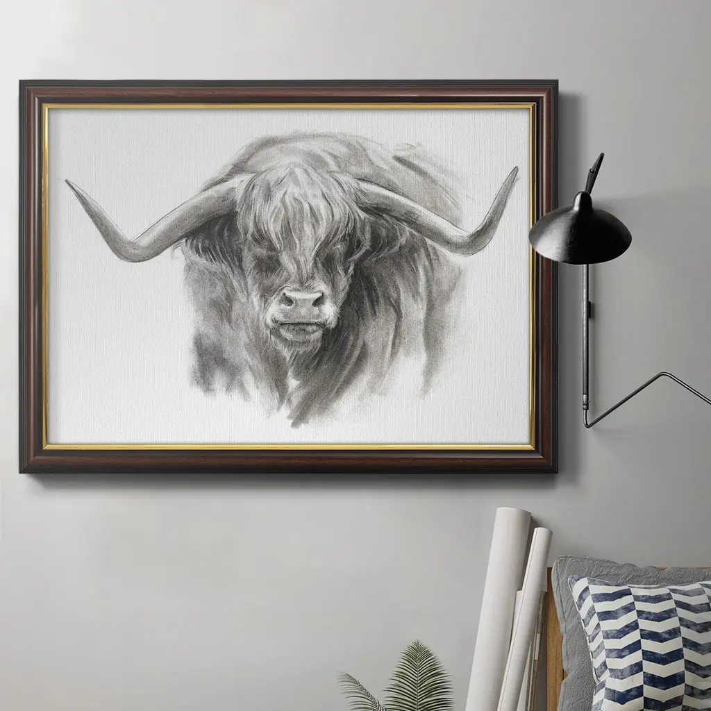 Longhorn Steer Sketch I by Ethan Harper is a high quality piece of framed artwork. The finished size of this piece is 21.25" X 21.25". It has a Black Petite Decorative frame, is single matted and finished with high quality Acrylic Plexiglass.