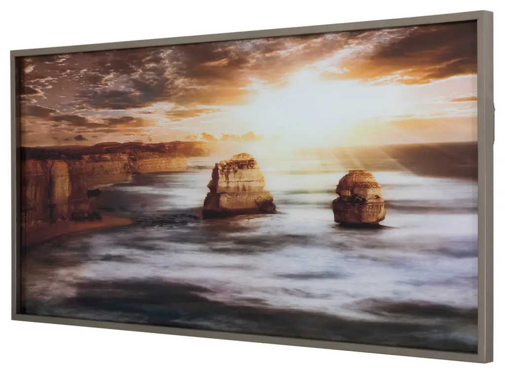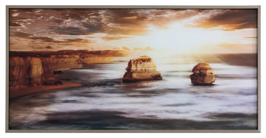 Clouds break way to allow the radiance of the sun on the misty gray sea. High cliffs border the unusually calm waters as if they''re protecting this divine scene. This glass art piece, surrounded by a champagne frame brings tranquility to any room.