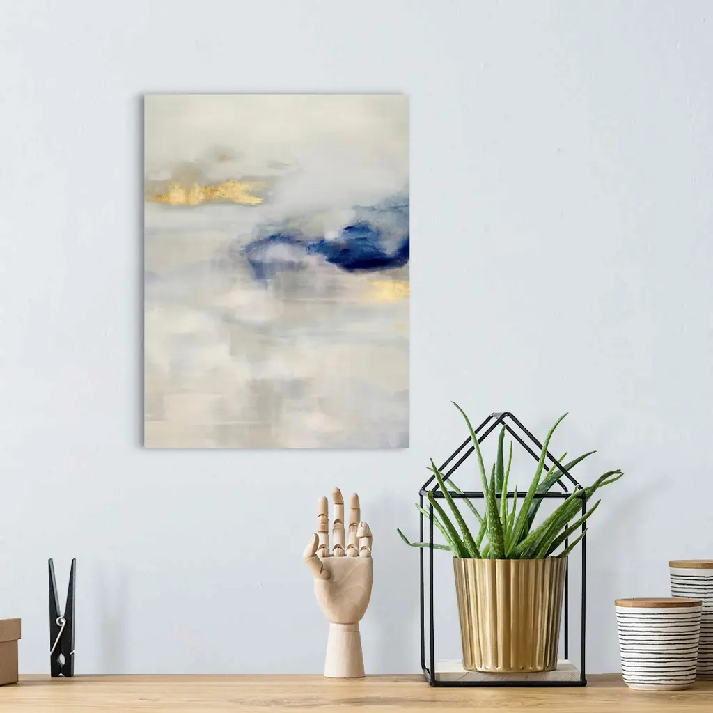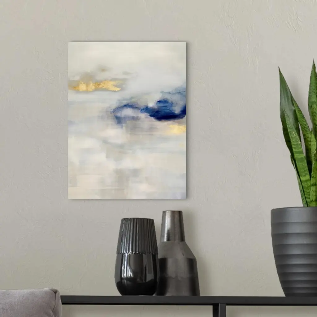 Contemporary abstract artwork in muted blue and white tones with gold colored brush accents.