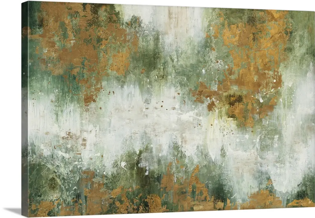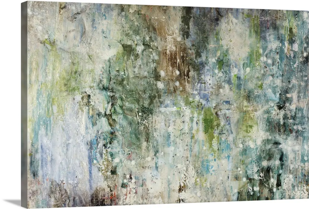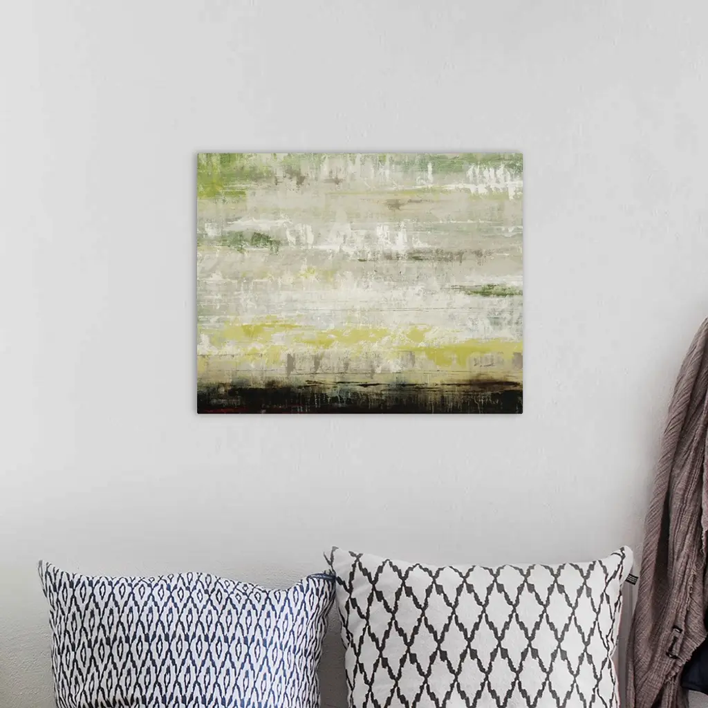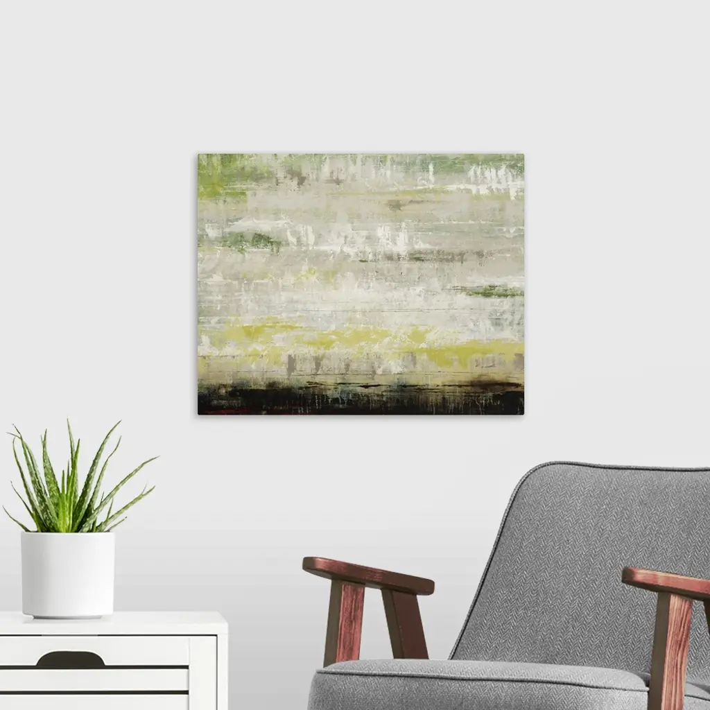 Abstract painting of horizontal stripes of varying colors that are overlapping with a sponge painted texture.