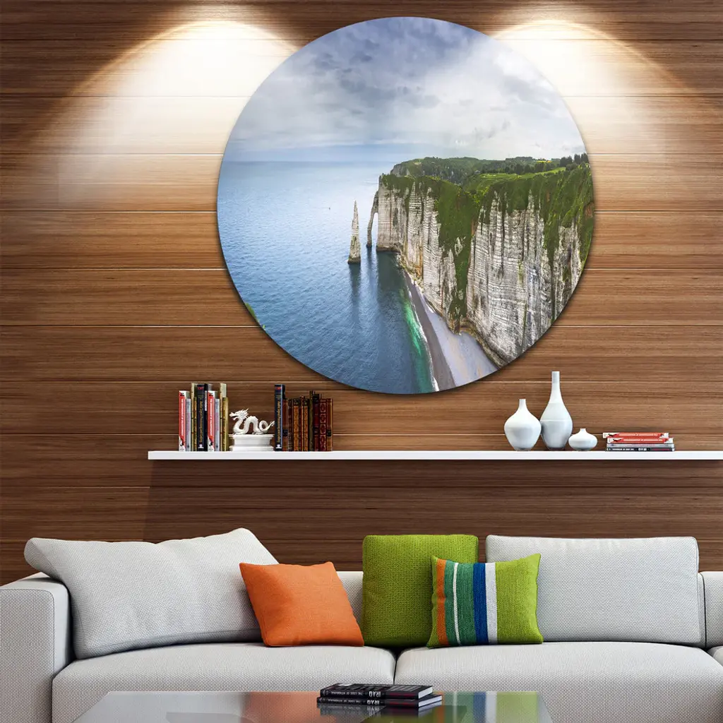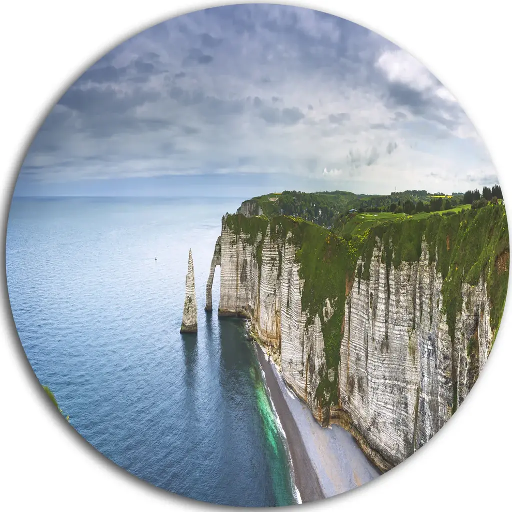 Bring Contemporary Abstraction to your home with this large Circle Metal wall art. This Etretat Aval Cliff and Rocks Metal Artwork makes it the focal point of any room or office. - White Gloss Coating ensures colors are extra vibrant with light reflection.- Aluminum grade Sheet Metal with 1 inch mounting frame on the back giving the illusion that the artwork is floating on the wall..- Mounting Brackets are included along with instructions.- High Quality Digital images are created directly into a glossy aluminum panel producing a stunning and captivating print into the glossy finish of the metal.- Water, Fire and Scratch resistant HD Aluminum panels.- Looks better than any photo paper and guaranteed to last at least 20 years- Easy to clean with a microfiber cloth. Colors are far superior to regular Canvas Art. - Easy to Hang