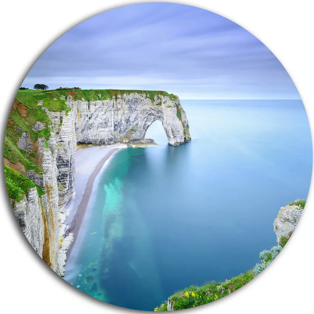 Bring Contemporary Abstraction to your home with this large Circle Metal wall art. This Etretat Aval Cliff and Rocks Normandy Metal Artwork makes it the focal point of any room or office. - White Gloss Coating ensures colors are extra vibrant with light reflection.- Aluminum grade Sheet Metal with 1 inch mounting frame on the back giving the illusion that the artwork is floating on the wall..- Mounting Brackets are included along with instructions.- High Quality Digital images are created directly into a glossy aluminum panel producing a stunning and captivating print into the glossy finish of the metal.- Water, Fire and Scratch resistant HD Aluminum panels.- Looks better than any photo paper and guaranteed to last at least 20 years- Easy to clean with a microfiber cloth. Colors are far superior to regular Canvas Art. - Easy to Hang