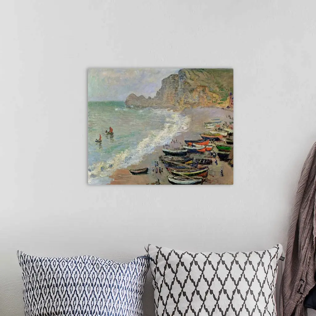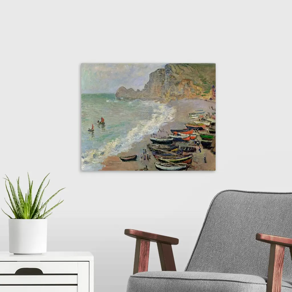 Classical oil painting on canvas of a lot of boats resting on a beach and two floating in the ocean.