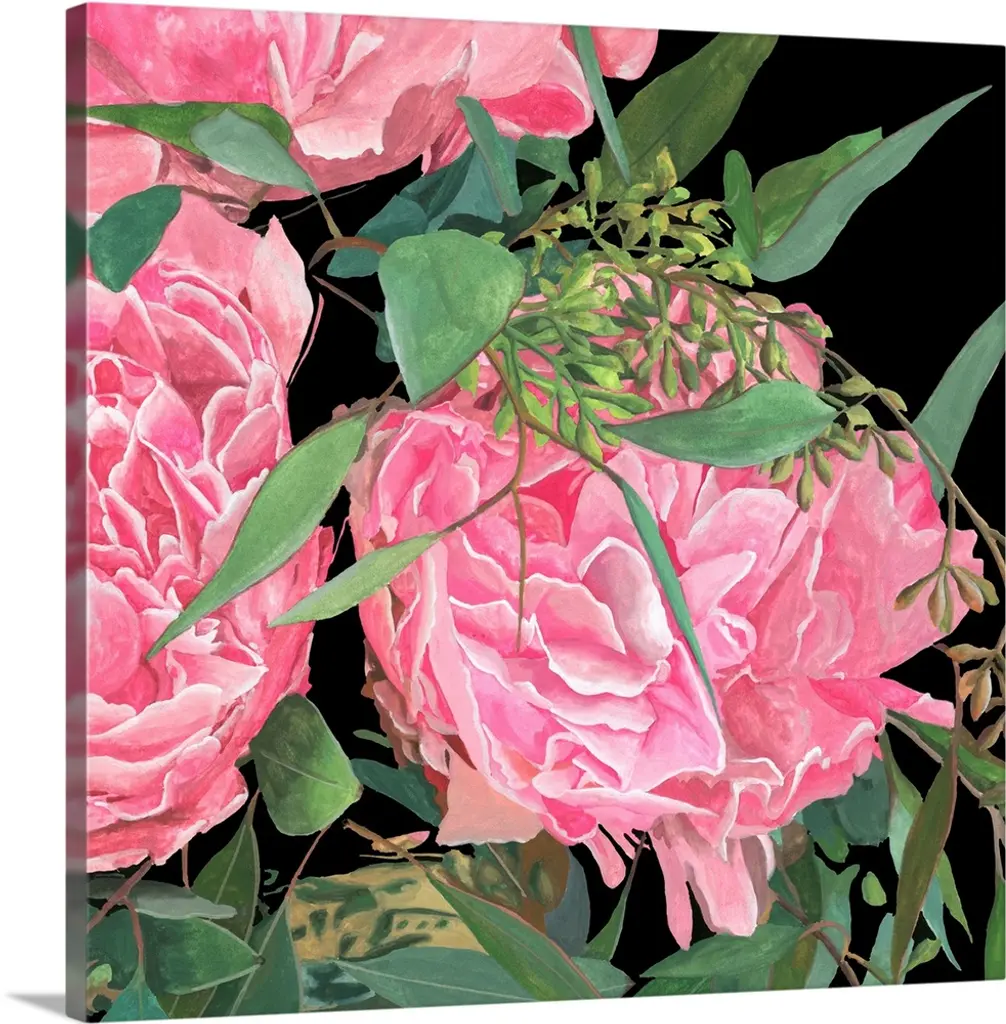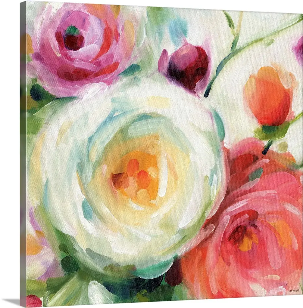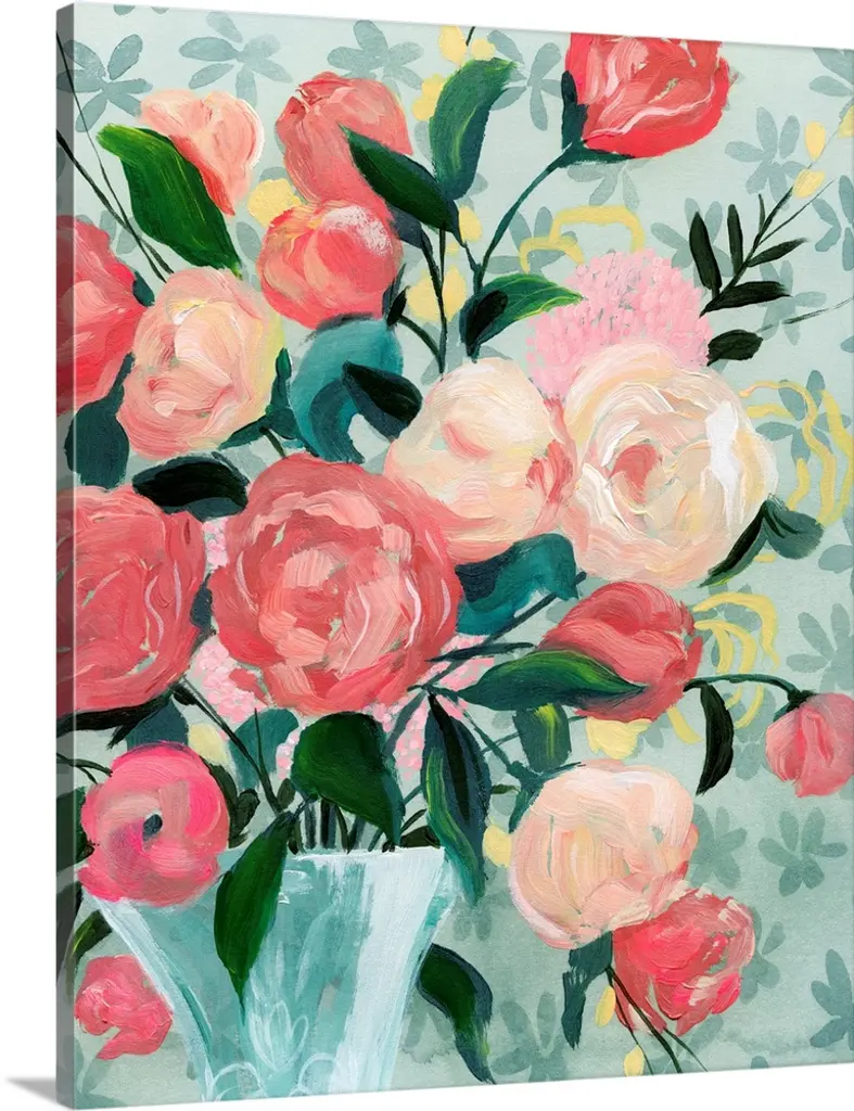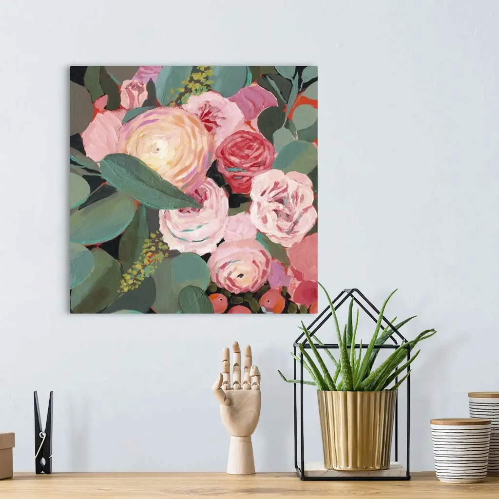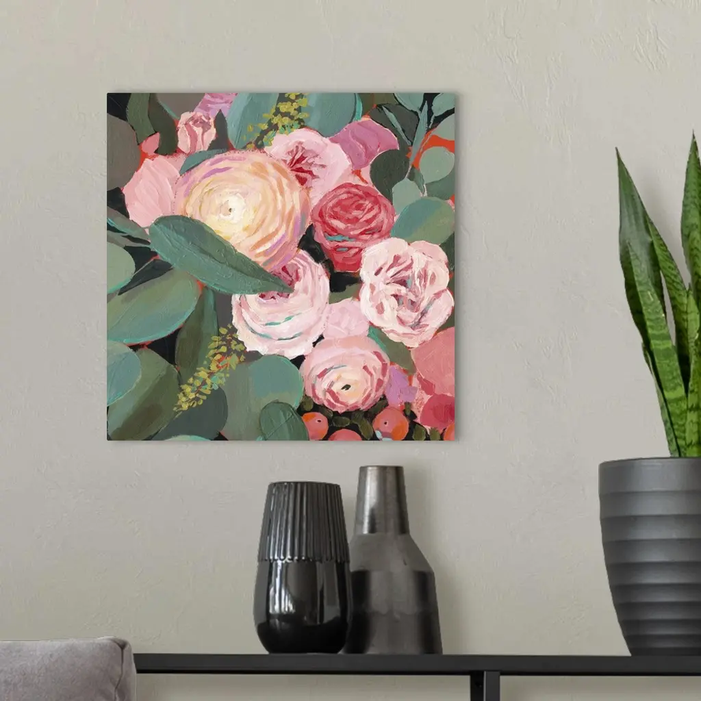 This whimsical artwork features an abundance of flowers in romantic hues of red and pink that drape over the greenery.