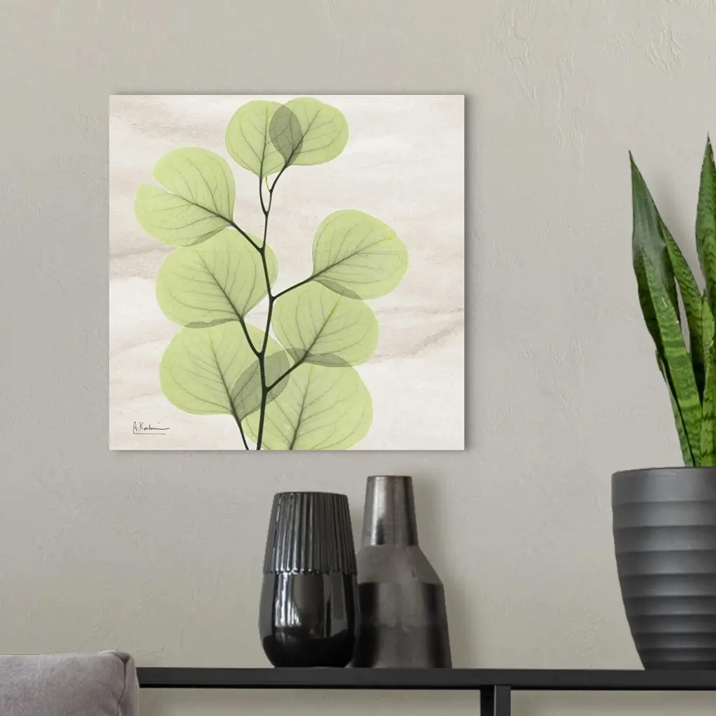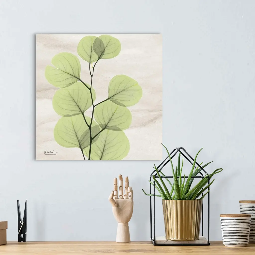 Square x-ray photograph of a eucalyptus branch with leaves on a smooth, neutral background.