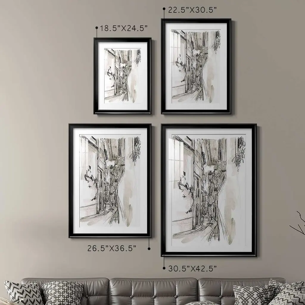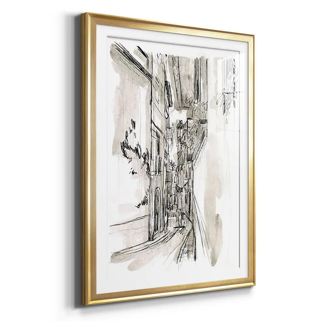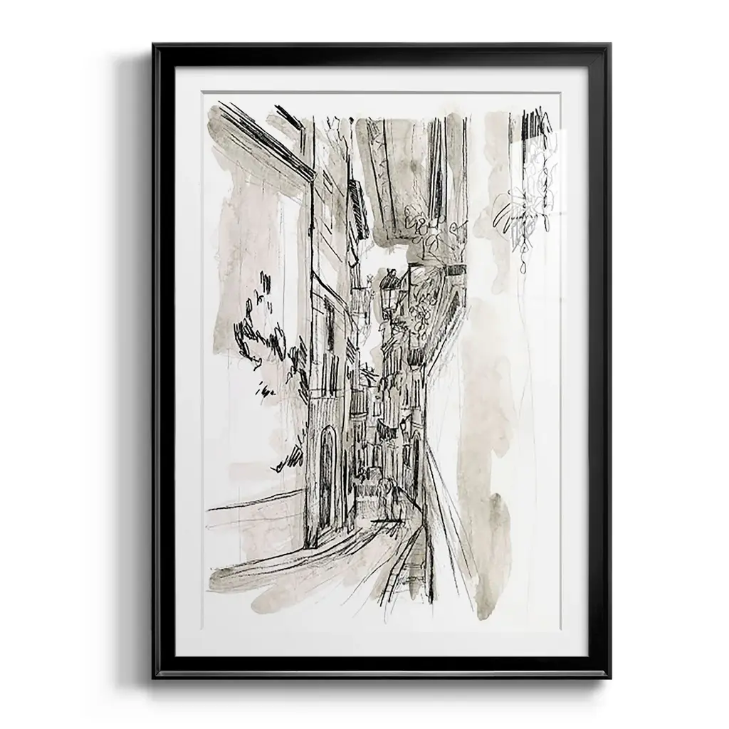 Europe Street Sketches I Premium Framed Print - Ready to Hang A Premium Framed Print created to last. Framed in distressed wood and available in an array of sizes and colors Featuring a beveled a solid wood stretcher bar, each piece comes ready to hand 4 SIZES AVAILABLE 30.5''X42.5'' - Overall Size 26.5'X36.5'' - Overall Size 22.5''x30.5'' - Overall Size 18.5''x24.5'' - Overall Size Each piece is made to order. Each piece comes with hanging hardware. Made in the USA Ready to Hang Giclee Paper Print Acrylic Glass Beveled Matt Board