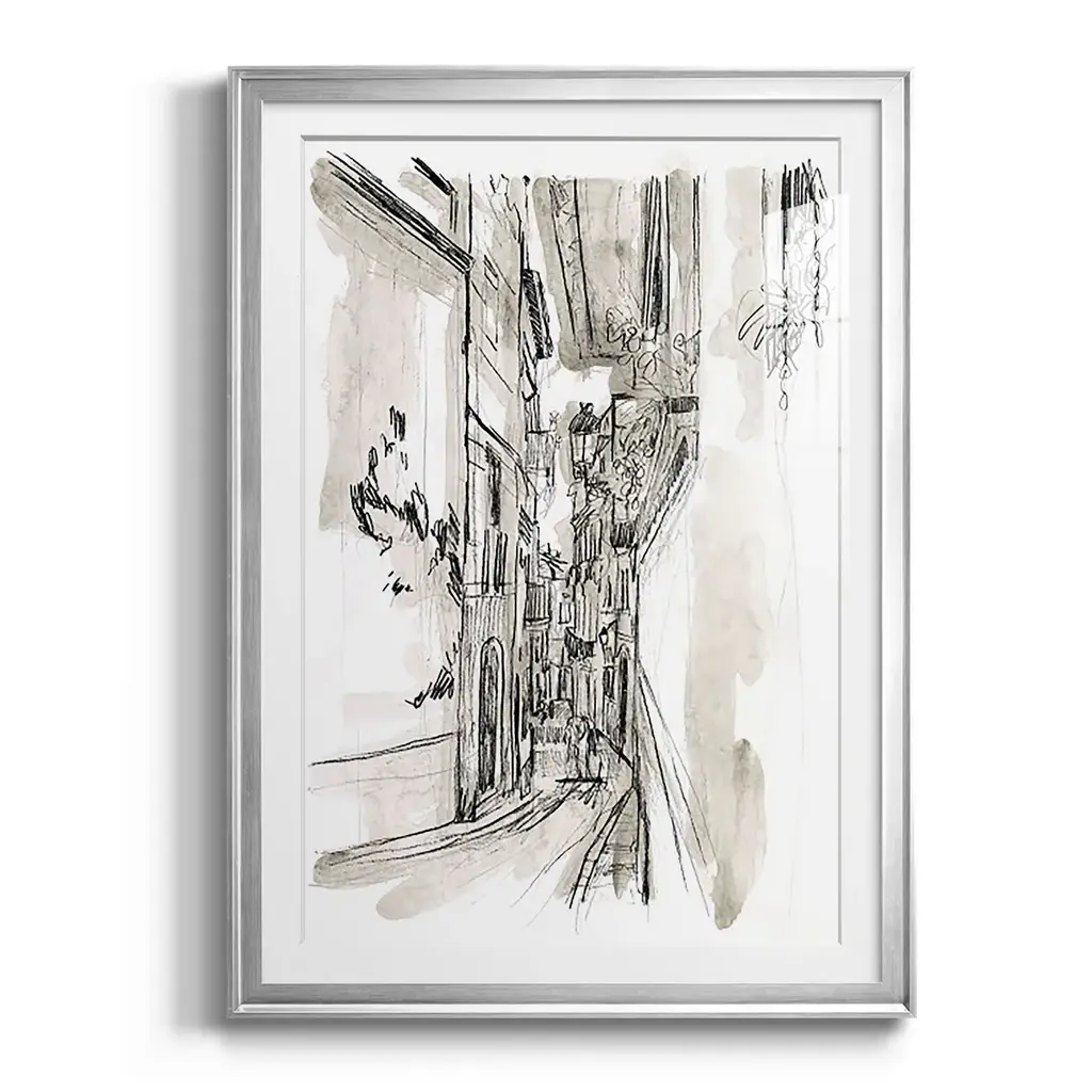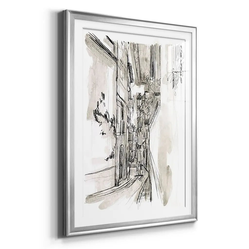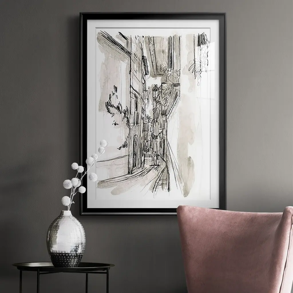 Europe Street Sketches I Premium Framed Print - Ready to Hang A Premium Framed Print created to last. Framed in distressed wood and available in an array of sizes and colors Featuring a beveled a solid wood stretcher bar, each piece comes ready to hand 4 SIZES AVAILABLE 30.5''X42.5'' - Overall Size 26.5'X36.5'' - Overall Size 22.5''x30.5'' - Overall Size 18.5''x24.5'' - Overall Size Each piece is made to order. Each piece comes with hanging hardware. Made in the USA Ready to Hang Giclee Paper Print Acrylic Glass Beveled Matt Board