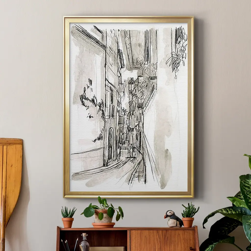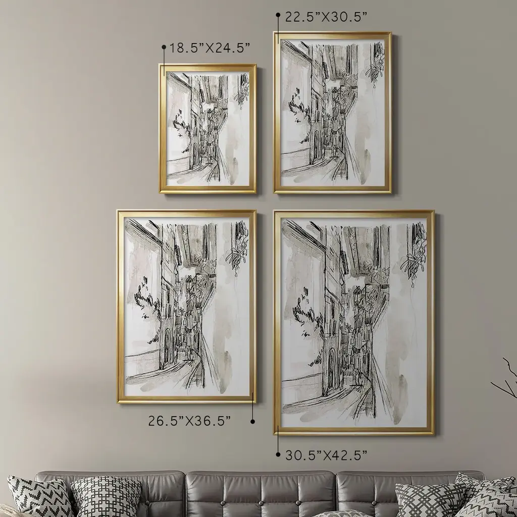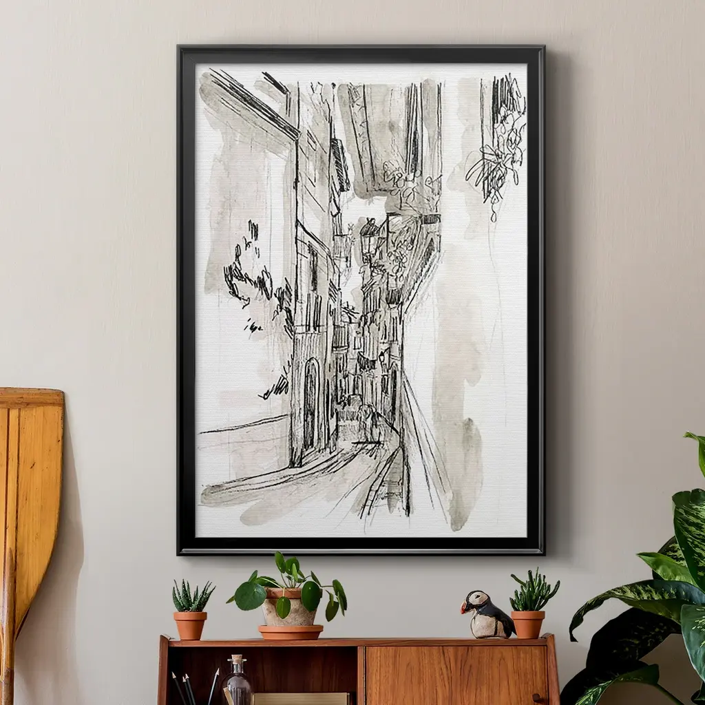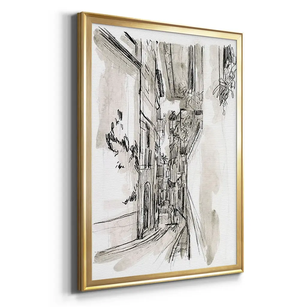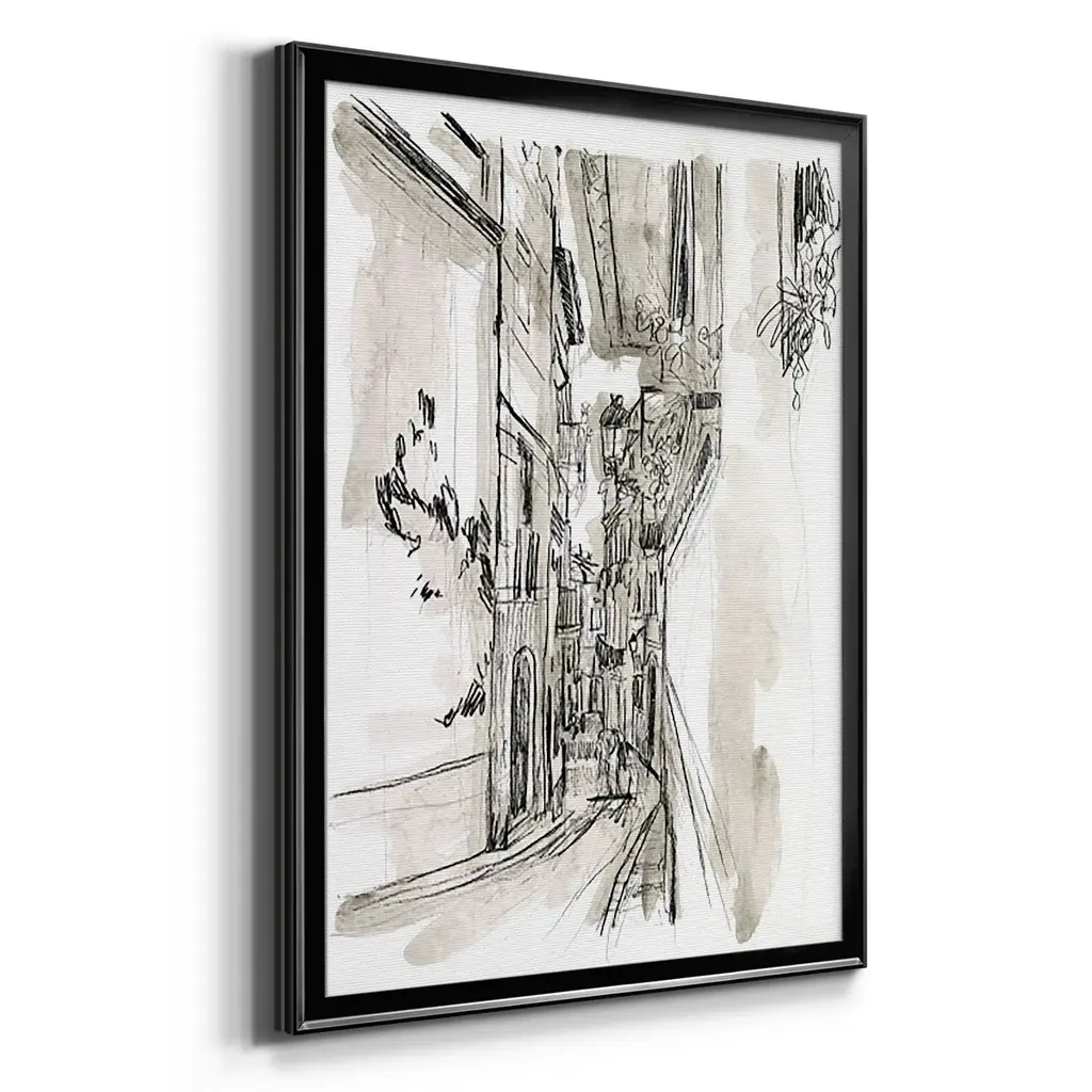 Europe Street Sketches I Premium Framed Print - Ready to Hang A Premium Framed Print created to last. Framed in distressed wood and available in an array of sizes and colors Featuring a beveled a solid wood stretcher bar, each piece comes ready to hand 4 SIZES AVAILABLE 30.5''X42.5'' - Overall Size 26.5'X36.5'' - Overall Size 22.5''x30.5'' - Overall Size 18.5''x24.5'' - Overall Size Each piece is made to order. Each piece comes with hanging hardware. Made in the USA Ready to Hang