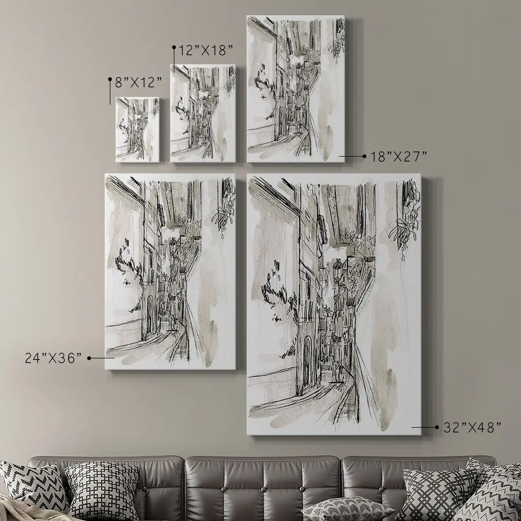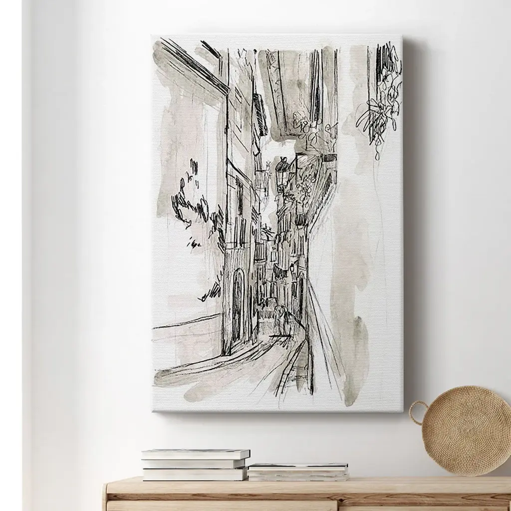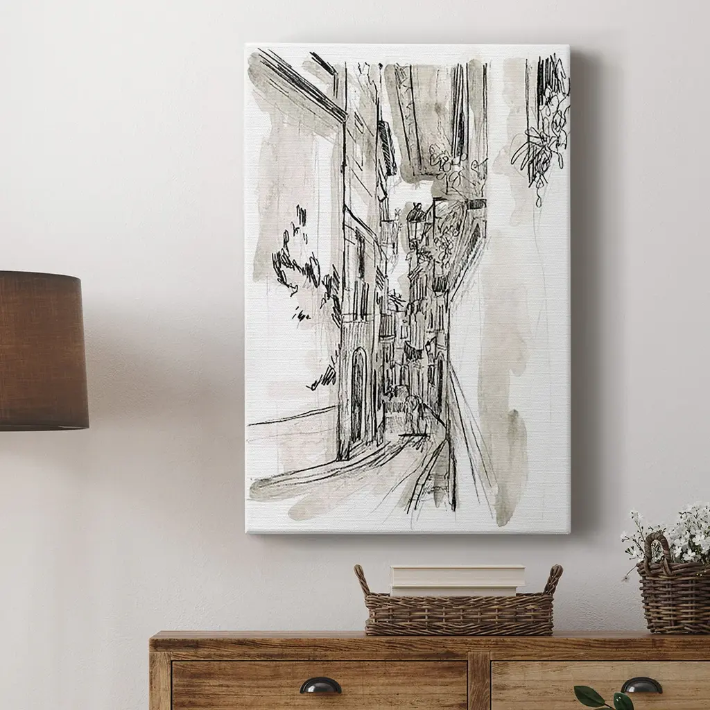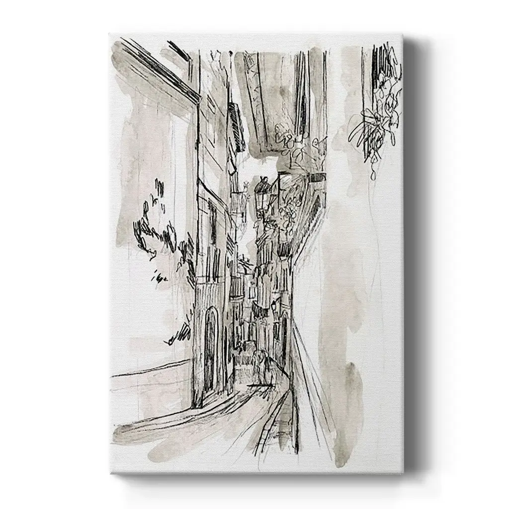 Europe Street Sketches I Premium Gallery Wrapped Canvas - Ready to Hang A premium hand stretched gallery wrapped canvas print created to last. Featuring a beveled a solid wood stretcher bar, each piece comes ready to hand 6 SIZES AVAILABLE 8''X12'' - Overall Size 12''X18'' - Overall Size 18''X27'' - Overall Size 24''x36'' - Overall Size 32''x48'' - Overall Size 40''x60'' - Overall Size Each piece is made to order. Built to Last Each piece comes ready to hang Solid wood stretcher Fade and Water resistant Made domestically