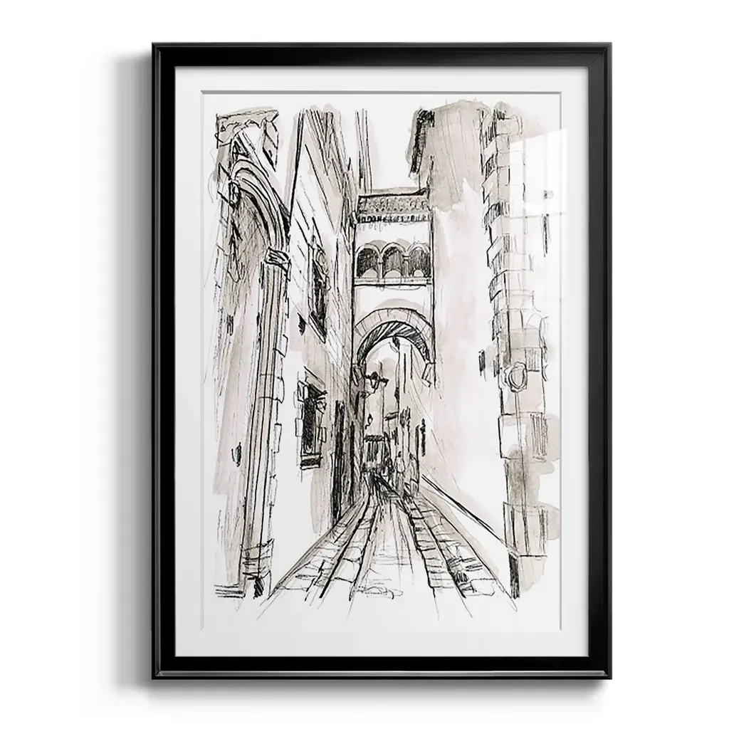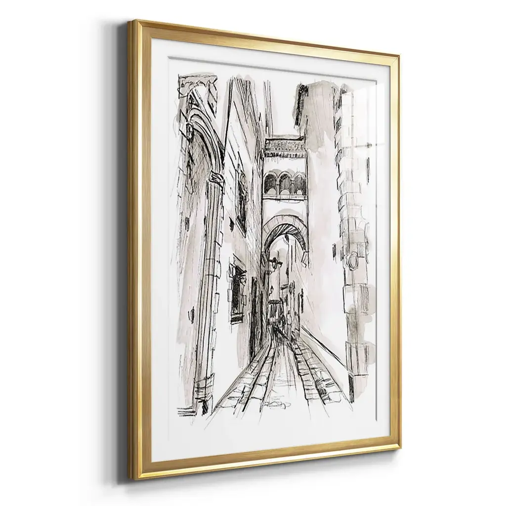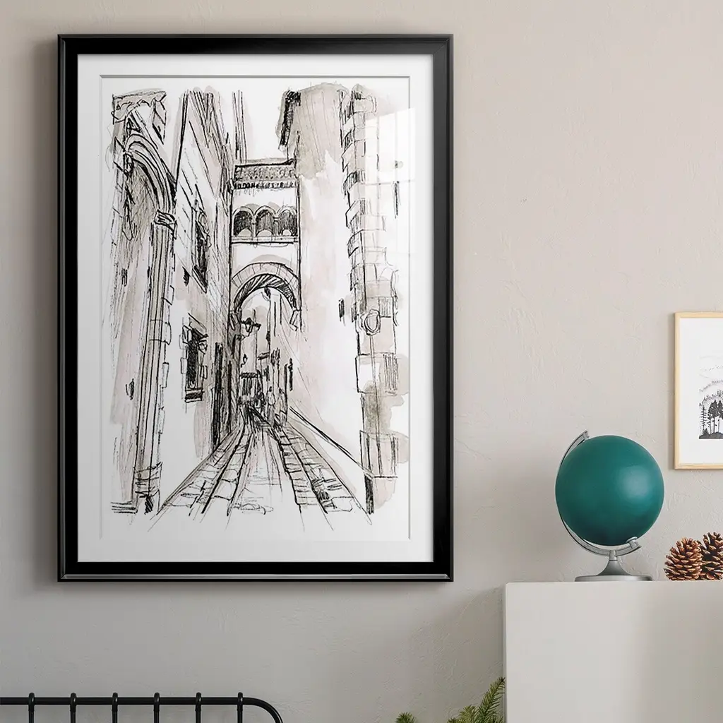 Europe Street Sketches II Premium Framed Print - Ready to Hang A Premium Framed Print created to last. Framed in distressed wood and available in an array of sizes and colors Featuring a beveled a solid wood stretcher bar, each piece comes ready to hand 4 SIZES AVAILABLE 30.5''X42.5'' - Overall Size 26.5'X36.5'' - Overall Size 22.5''x30.5'' - Overall Size 18.5''x24.5'' - Overall Size Each piece is made to order. Each piece comes with hanging hardware. Made in the USA Ready to Hang Giclee Paper Print Acrylic Glass Beveled Matt Board