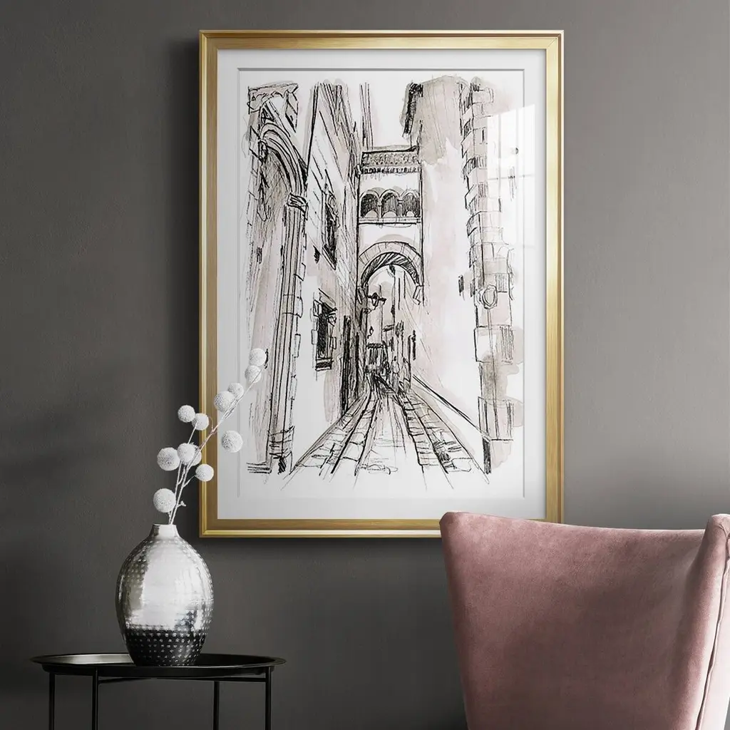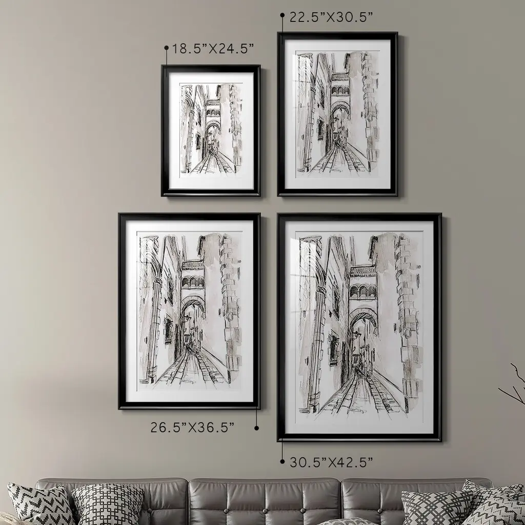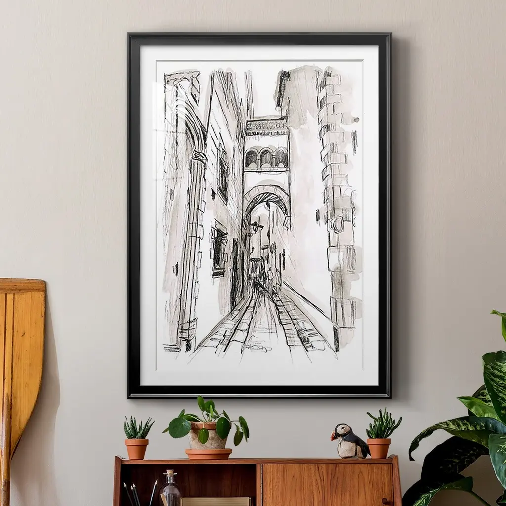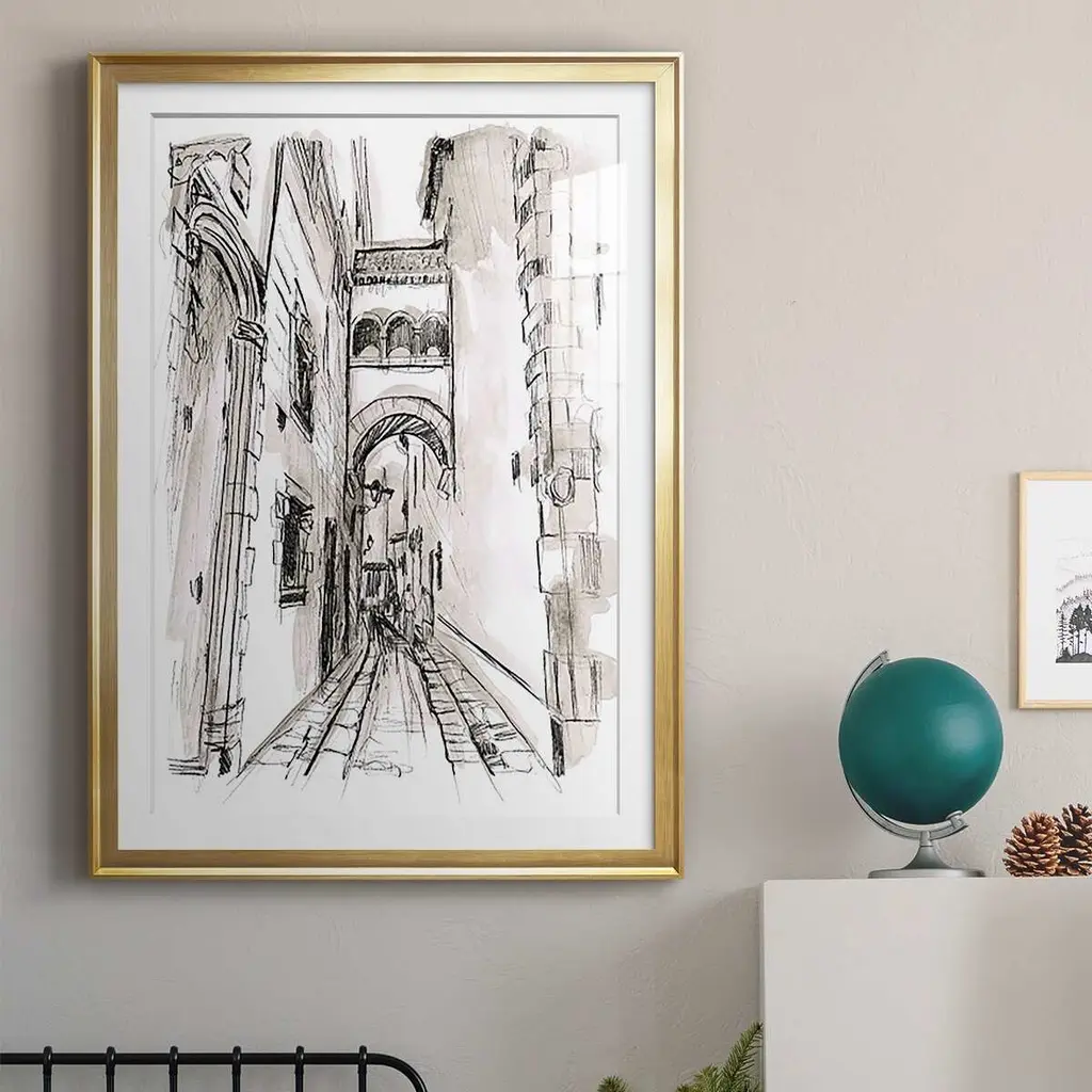 Europe Street Sketches II Premium Framed Print - Ready to Hang A Premium Framed Print created to last. Framed in distressed wood and available in an array of sizes and colors Featuring a beveled a solid wood stretcher bar, each piece comes ready to hand 4 SIZES AVAILABLE 30.5''X42.5'' - Overall Size 26.5'X36.5'' - Overall Size 22.5''x30.5'' - Overall Size 18.5''x24.5'' - Overall Size Each piece is made to order. Each piece comes with hanging hardware. Made in the USA Ready to Hang Giclee Paper Print Acrylic Glass Beveled Matt Board