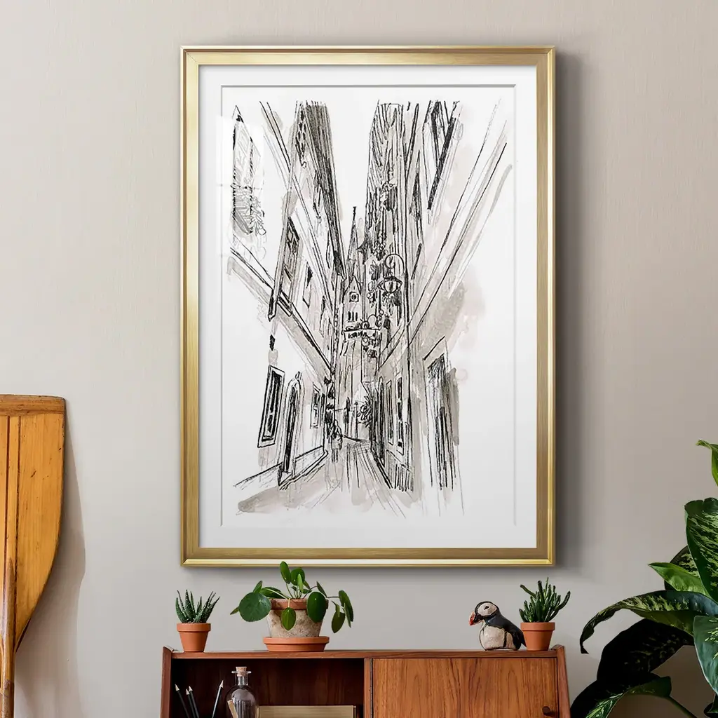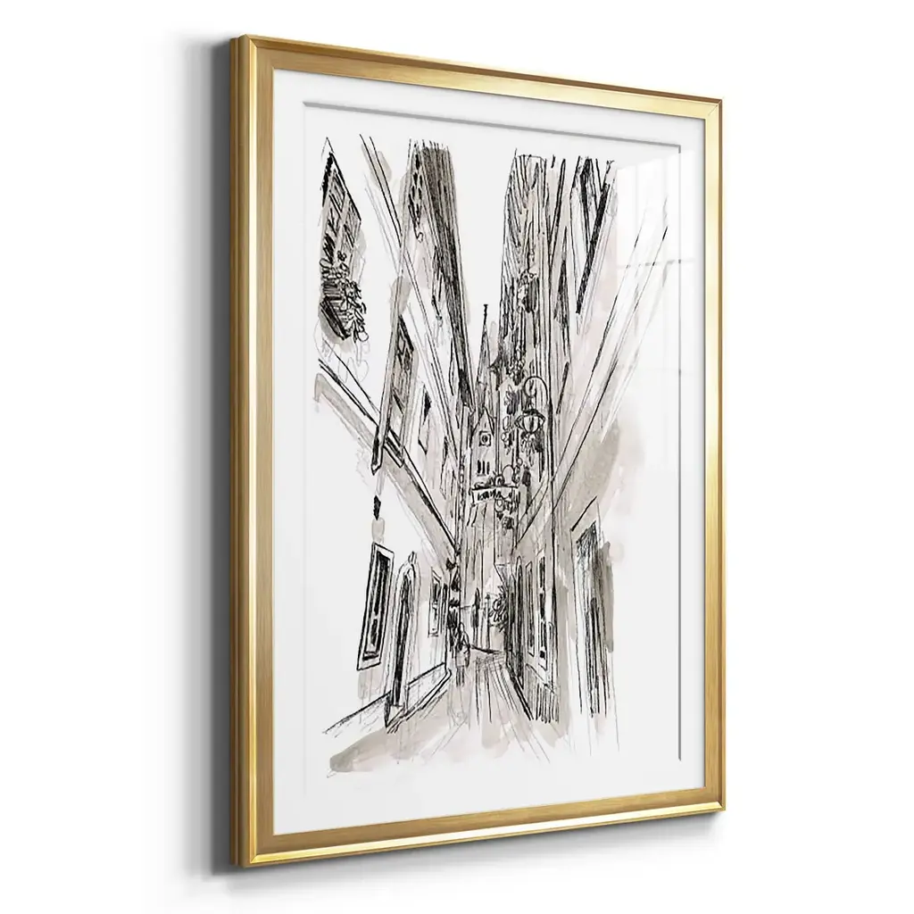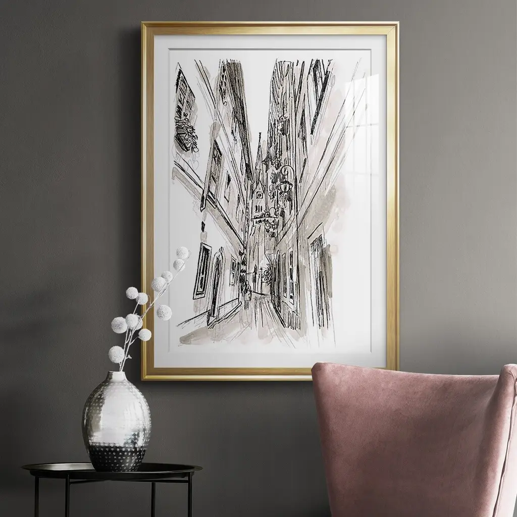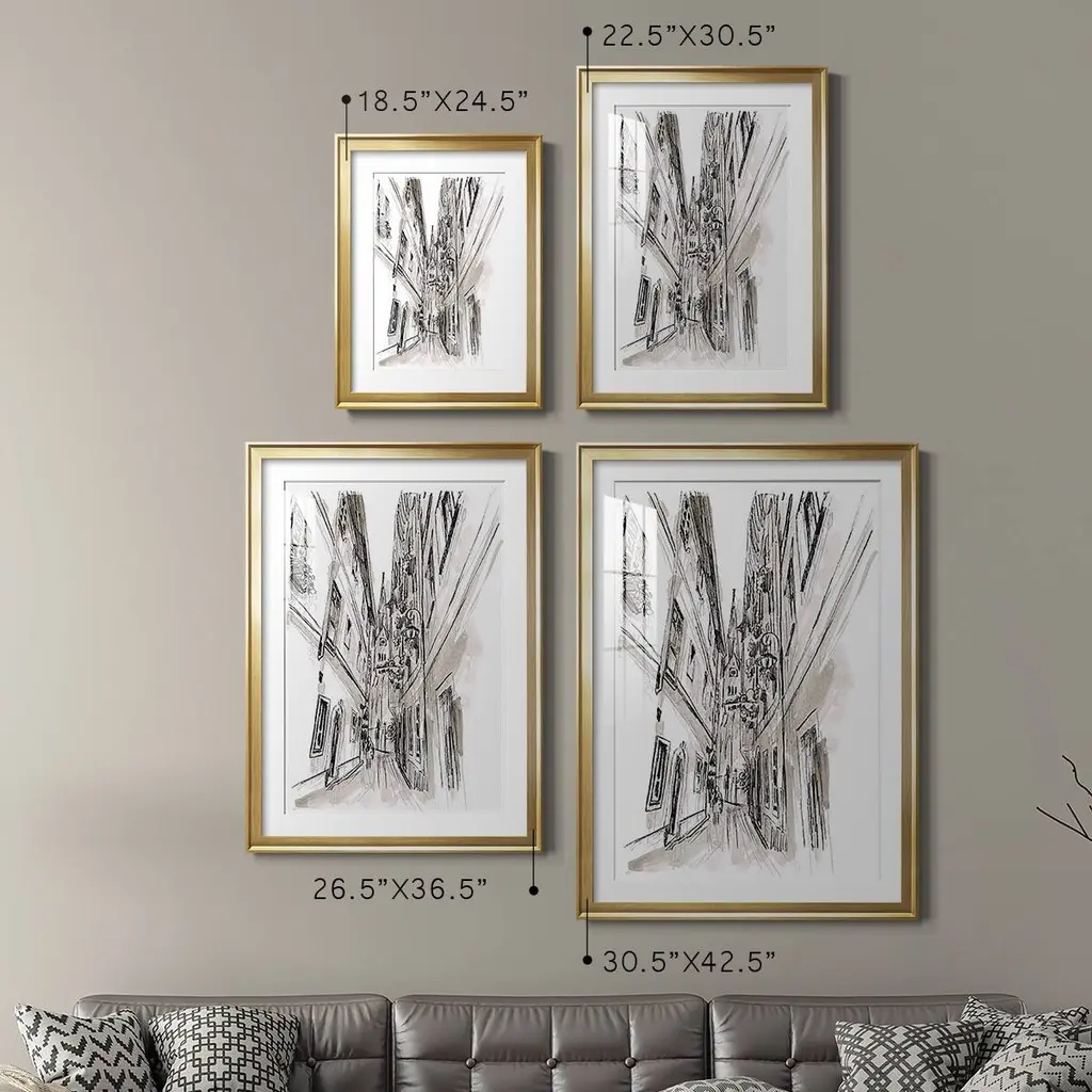 Europe Street Sketches III Premium Framed Print - Ready to Hang A Premium Framed Print created to last. Framed in distressed wood and available in an array of sizes and colors Featuring a beveled a solid wood stretcher bar, each piece comes ready to hand 4 SIZES AVAILABLE 30.5''X42.5'' - Overall Size 26.5'X36.5'' - Overall Size 22.5''x30.5'' - Overall Size 18.5''x24.5'' - Overall Size Each piece is made to order. Each piece comes with hanging hardware. Made in the USA Ready to Hang Giclee Paper Print Acrylic Glass Beveled Matt Board