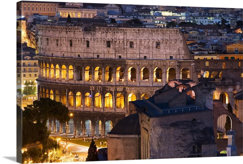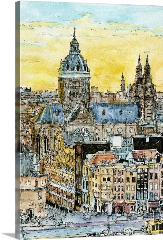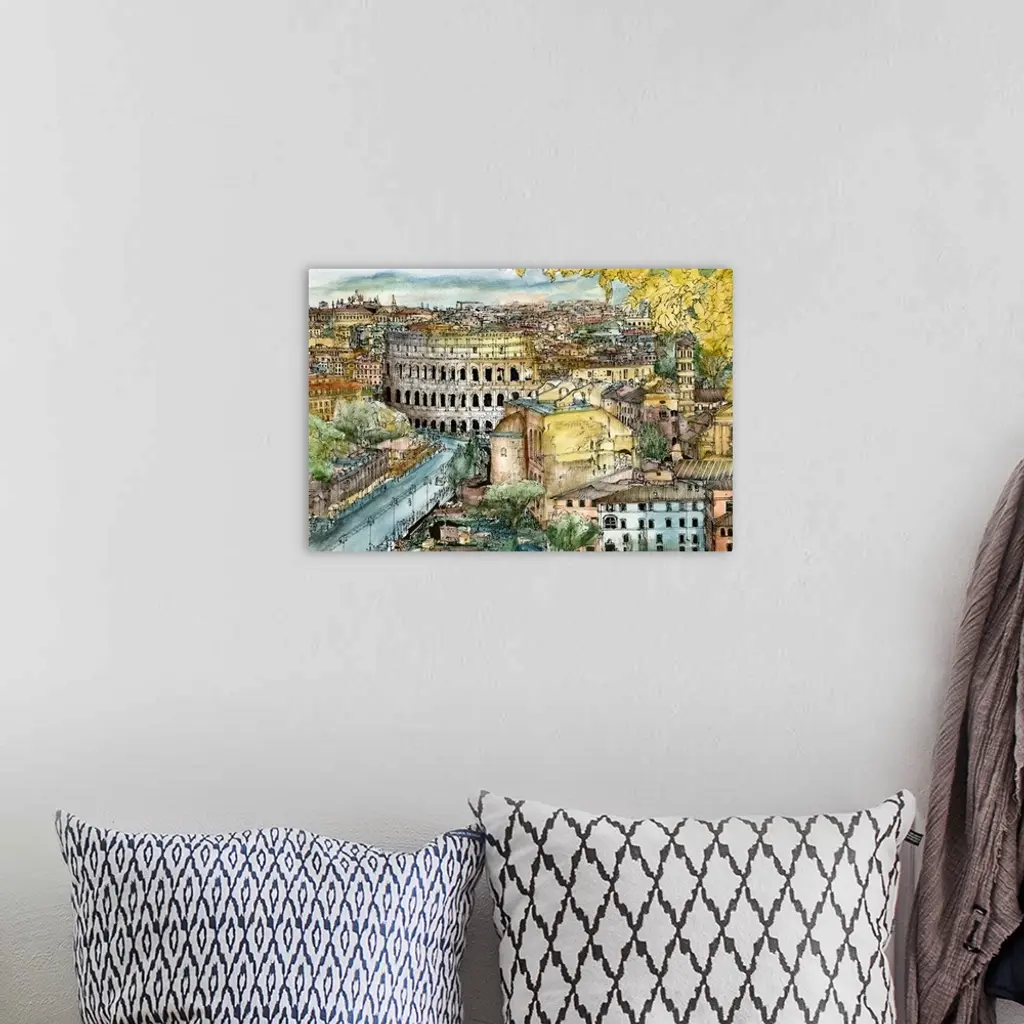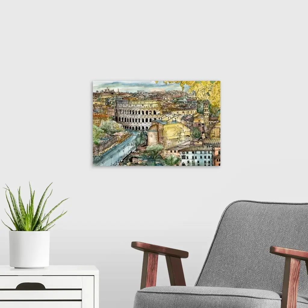 Contemporary sketch with filled in color of a Rome, Italy cityscape with the Colosseum prominently in the middle.