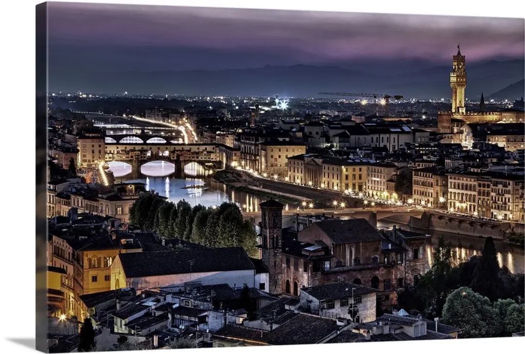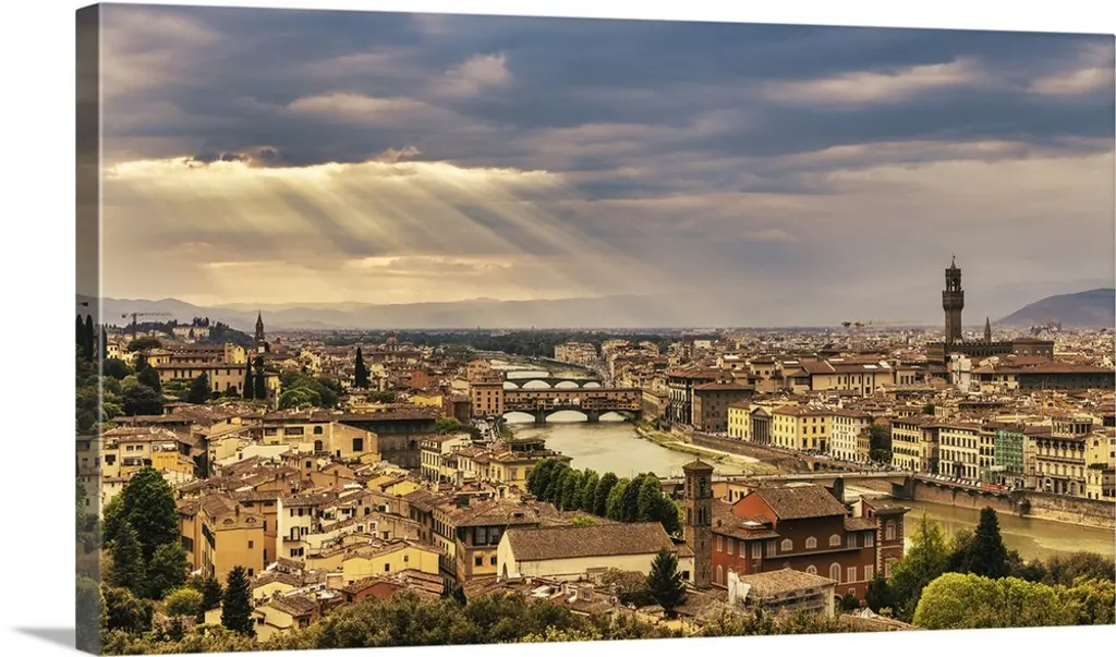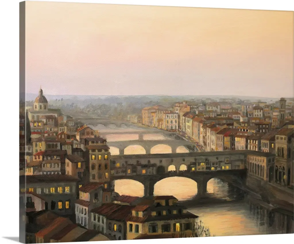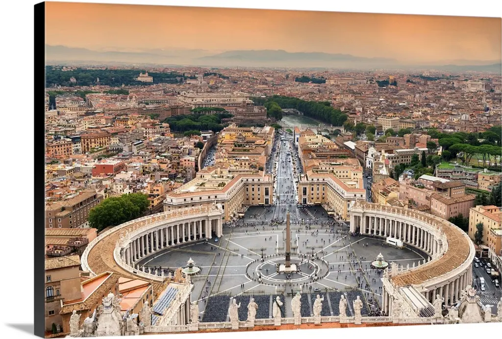 Contemporary sketch with filled in color of a Rome, Italy cityscape with the Colosseum prominently in the middle.