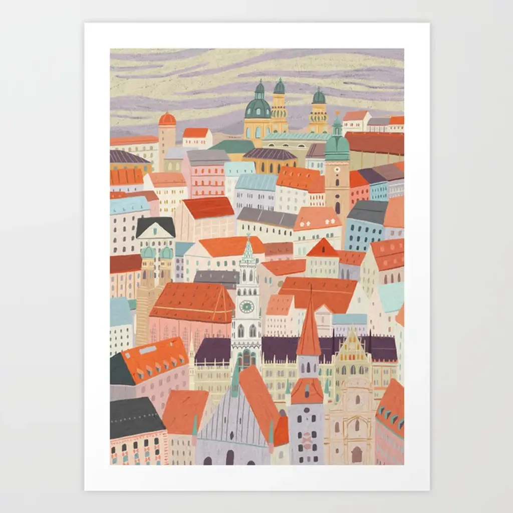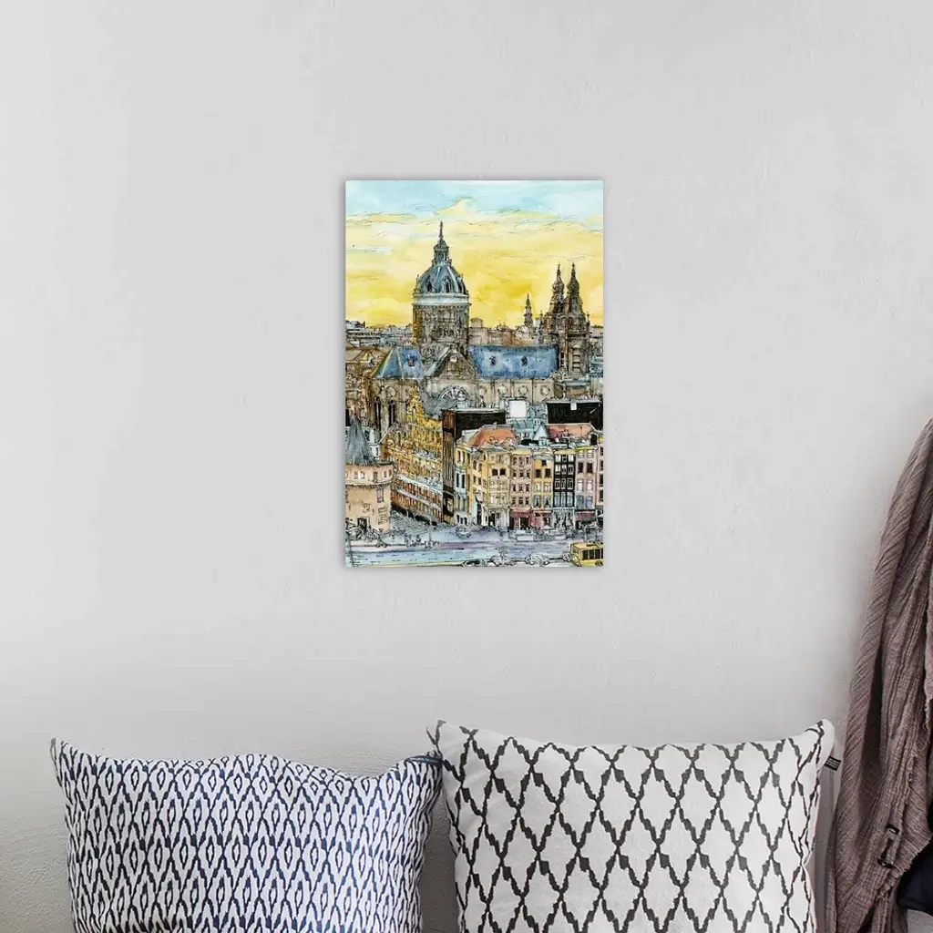 Sketch filled in with color of a European cityscape at sunset.