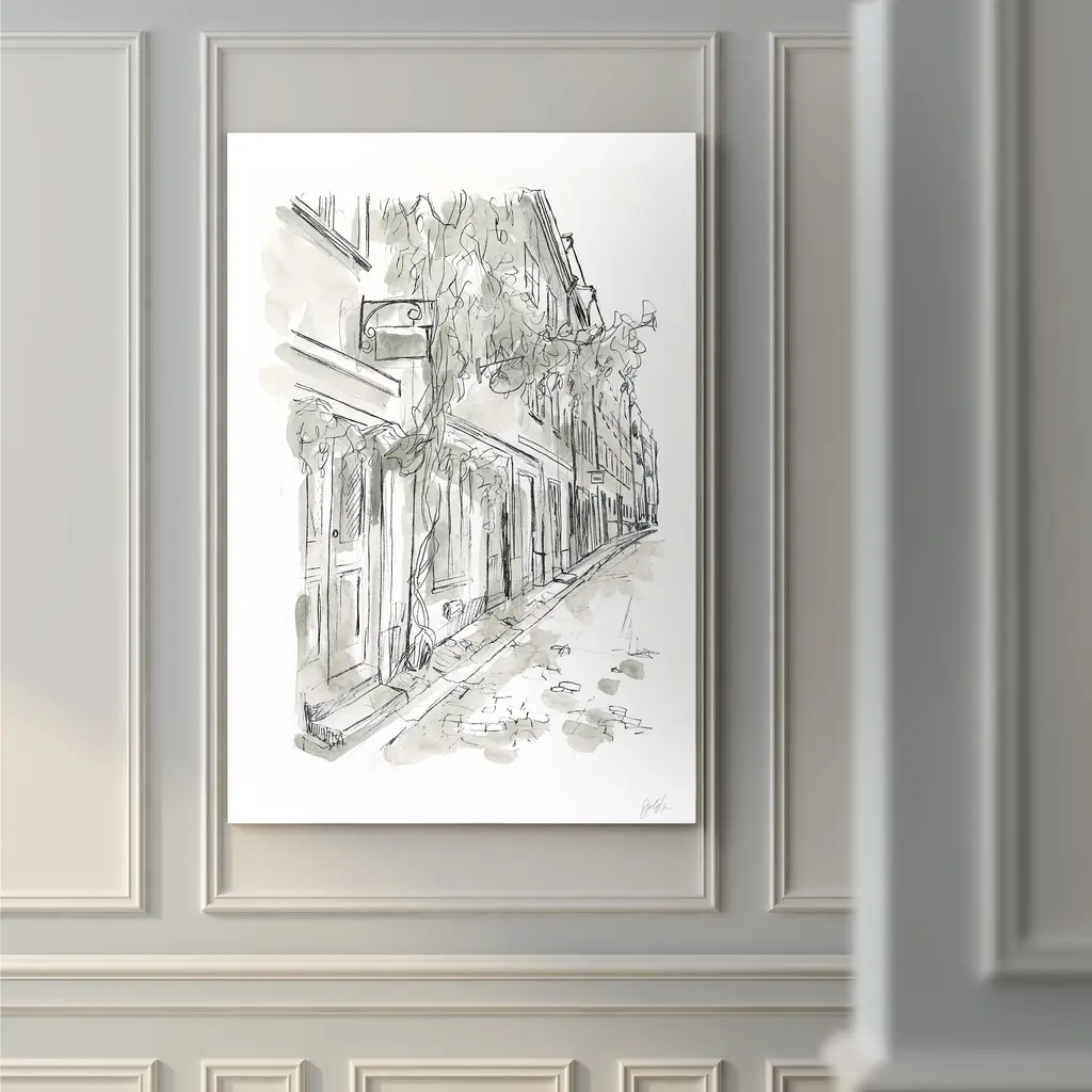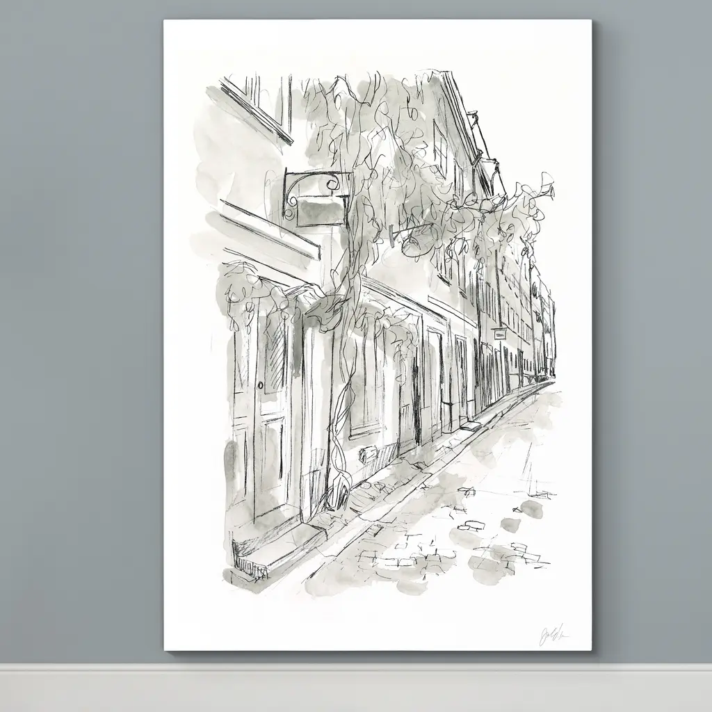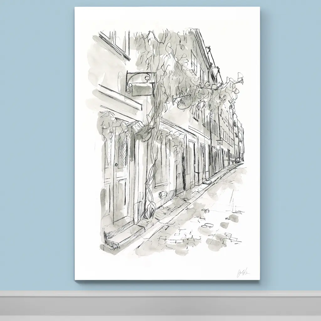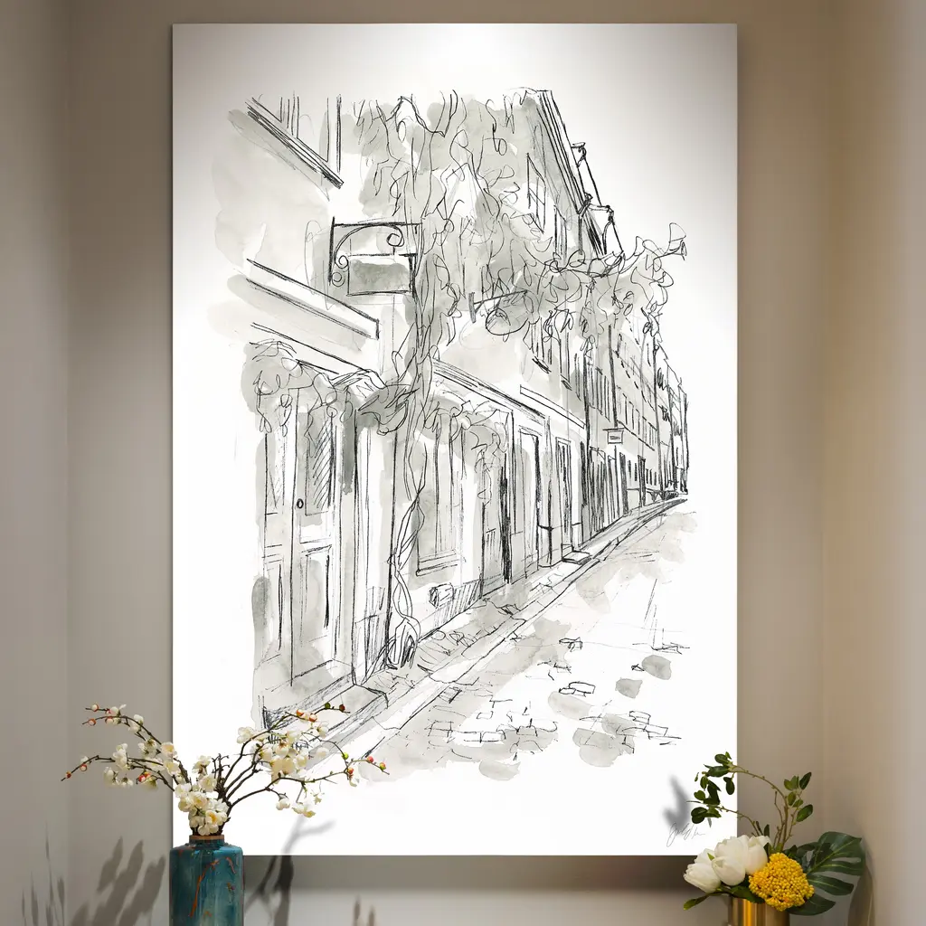 European City Sketch V -Premium Gallery Wrapped Canvas - Ready to Hang A premium hand stretched gallery wrapped canvas print created to last. Featuring a beveled a solid wood stretcher bar, each piece comes ready to hand 5 SIZES AVAILABLE 8''X12'' - Overall Size 16''x20'' - Overall Size 18''x27'' - Overall Size 24''x36'' - Overall Size 32''x48'' - Overall Size Each piece is made to order. Built to Last Each piece comes ready to hang Solid wood stretcher Fade and Water resistant Made domestically