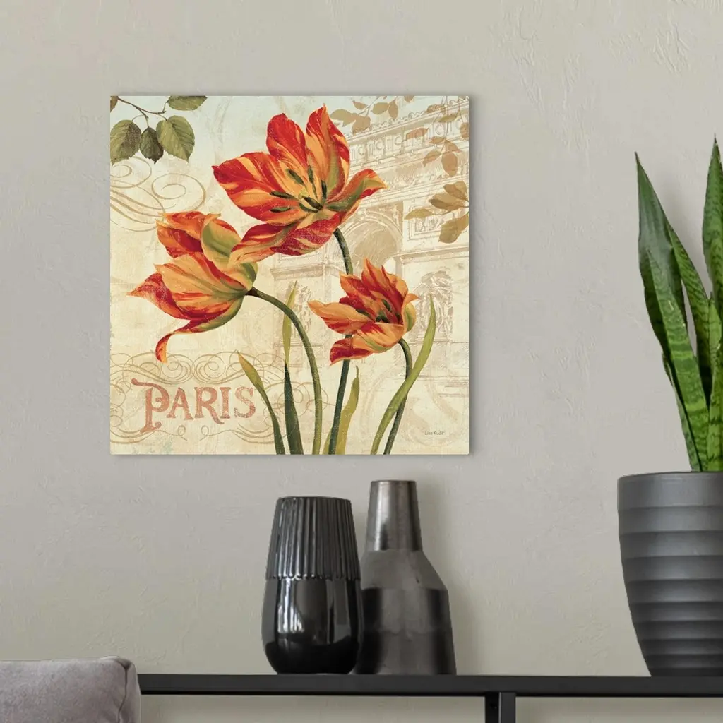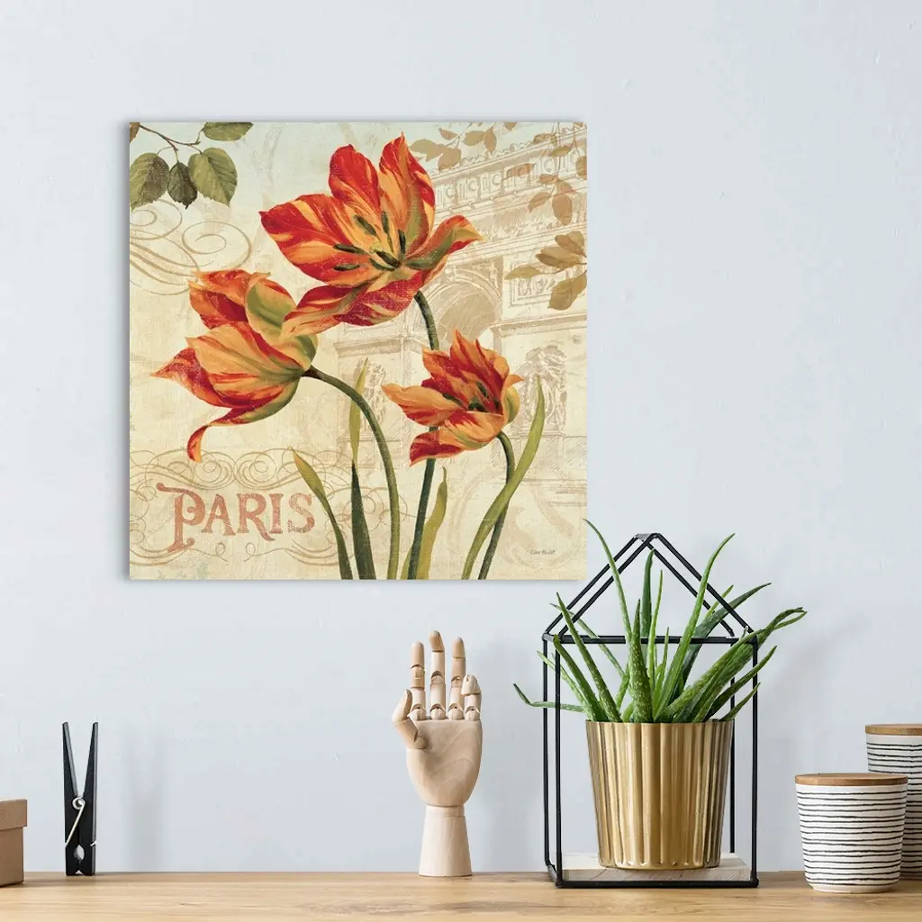 Contemporary painting of flowers with a background of the Arc de Triomphe.