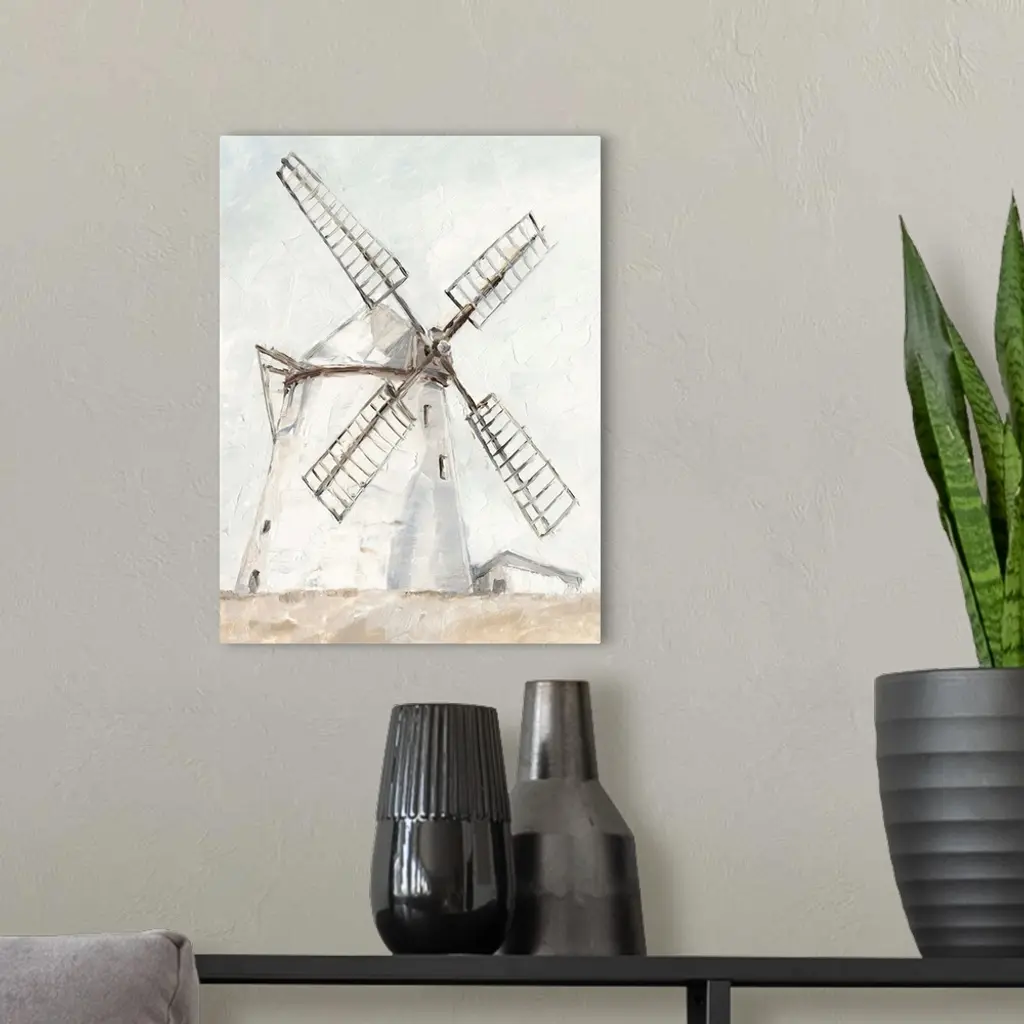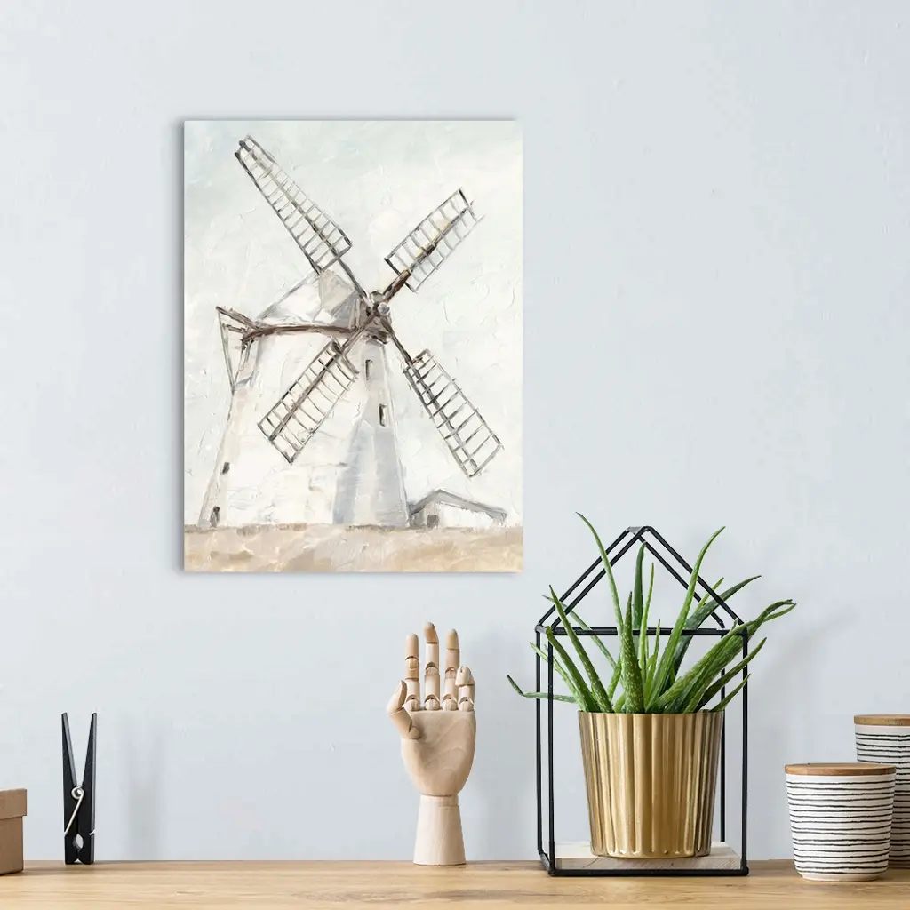 A painting of a windmill in a simple, neutral rustic style. Would be a perfect fit in a cottage or farmhouse decor scheme.