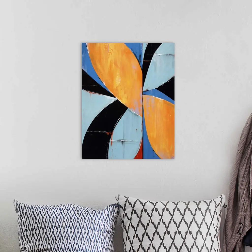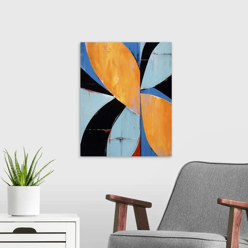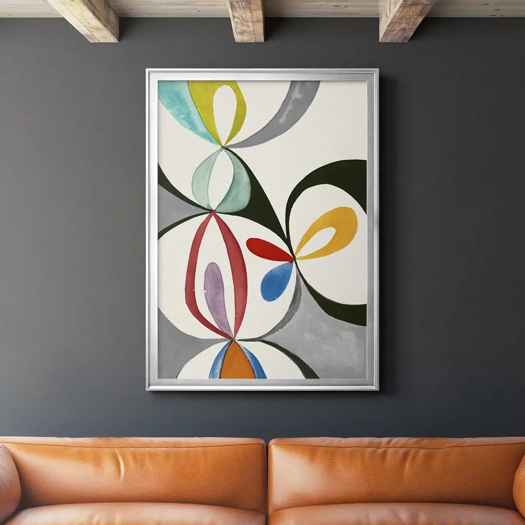 Abstract painting with a mid-century feel using organic shapes in different colors to create obscure patterns.