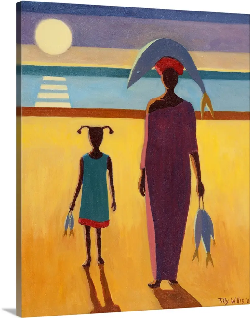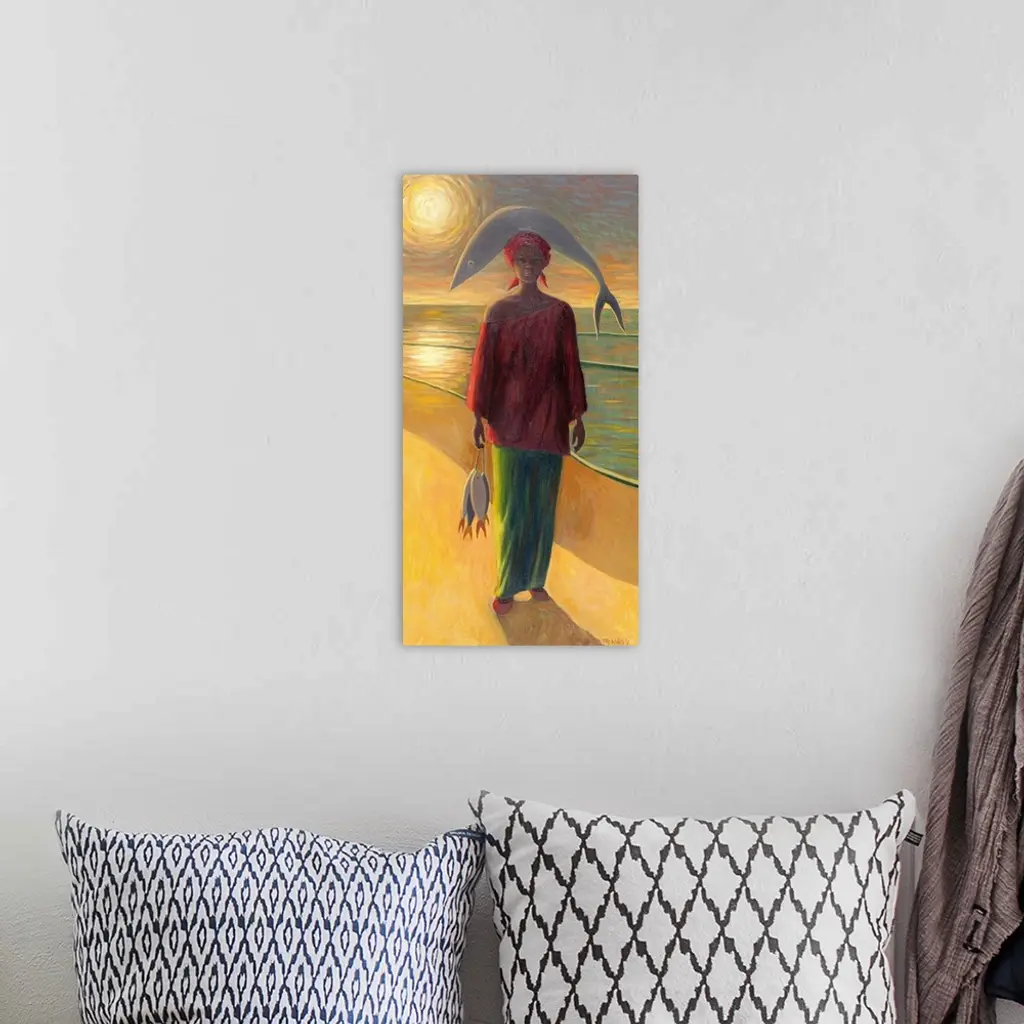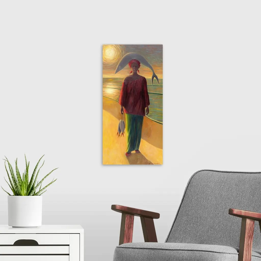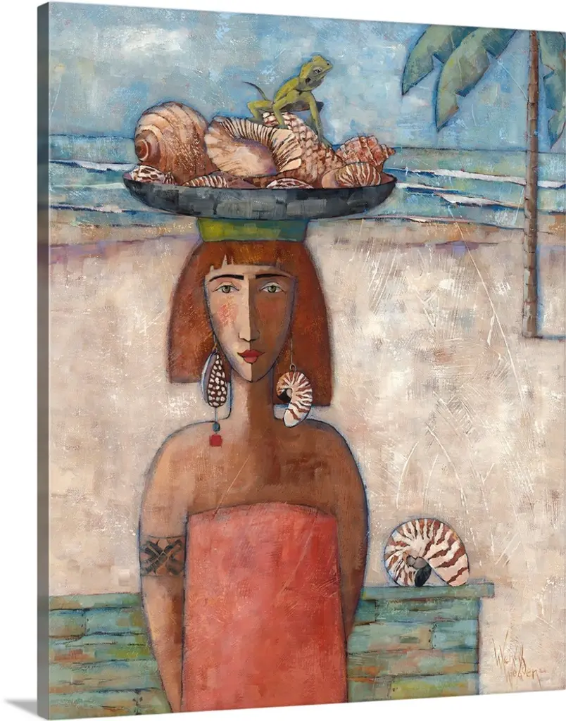 Oil painting of woman standing on beach balancing a fish on her head with a string of dead fish in her hand. The ocean is in the background and the sun is shinning bright in the sky.