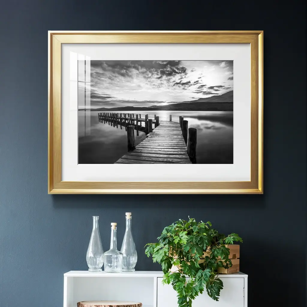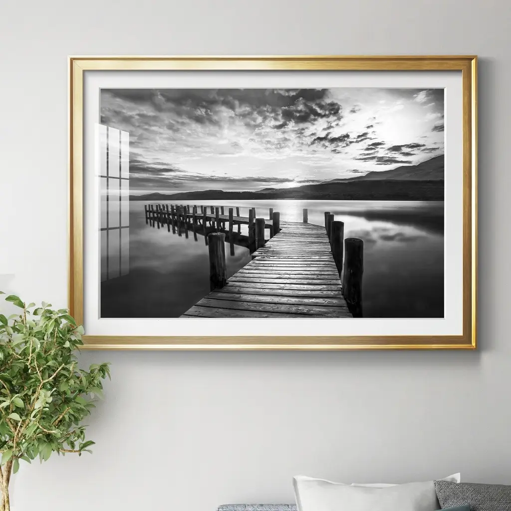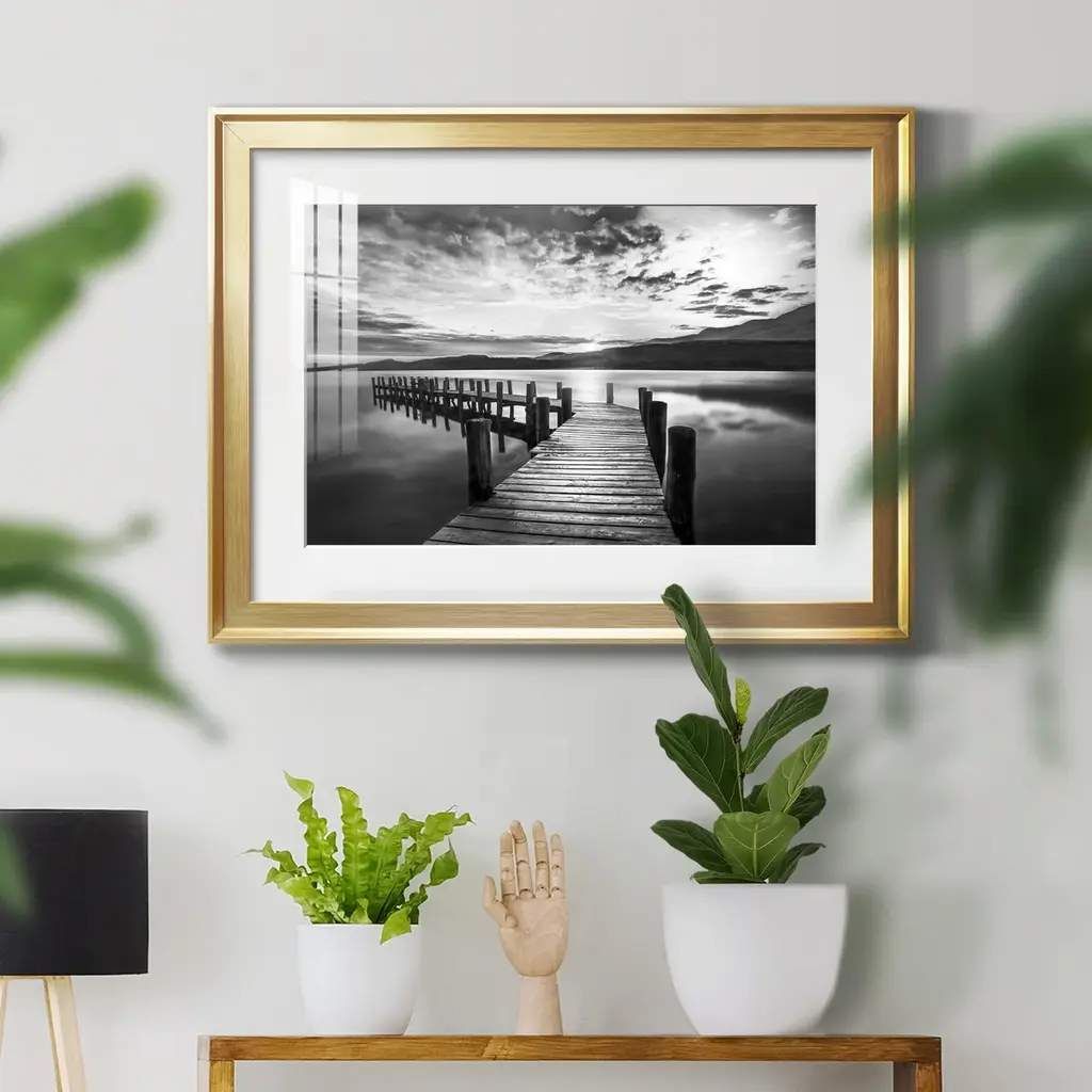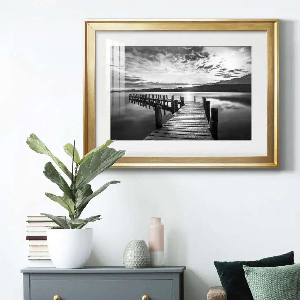 Evening Dock Premium Framed Print - Ready to Hang A Premium Framed Print created to last. Framed in distressed wood and available in an array of sizes and colors Featuring a beveled a solid wood stretcher bar, each piece comes ready to hand 4 SIZES AVAILABLE 30.5''X42.5'' - Overall Size 26.5'X36.5'' - Overall Size 22''x30'' - Overall Size 18''x24'' - Overall Size Each piece is made to order. Each piece comes with hanging hardware. Made in the USA Ready to Hang Giclee Paper Print Acrylic Glass Beveled Matt Board