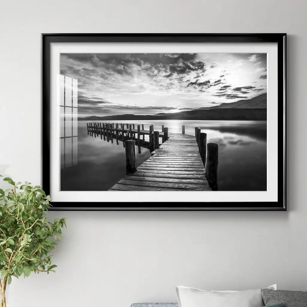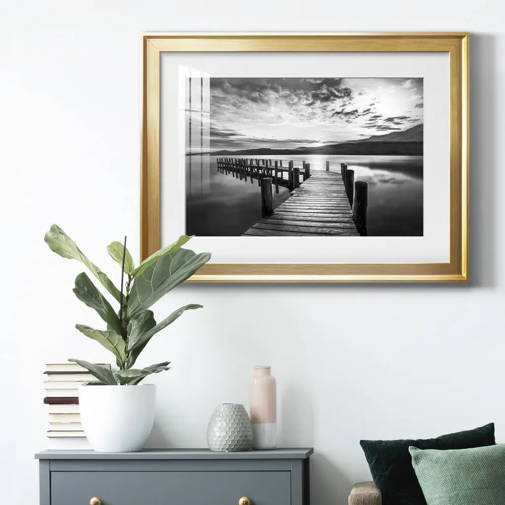 Evening Dock Premium Framed Print - Ready to Hang A Premium Framed Print created to last. Framed in distressed wood and available in an array of sizes and colors Featuring a beveled a solid wood stretcher bar, each piece comes ready to hand 4 SIZES AVAILABLE 30.5''X42.5'' - Overall Size 26.5'X36.5'' - Overall Size 22''x30'' - Overall Size 18''x24'' - Overall Size Each piece is made to order. Each piece comes with hanging hardware. Made in the USA Ready to Hang Giclee Paper Print Acrylic Glass Beveled Matt Board