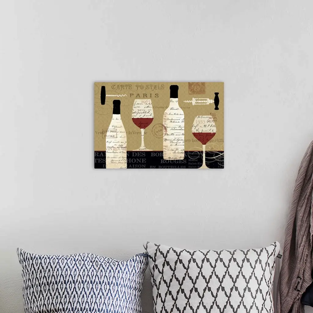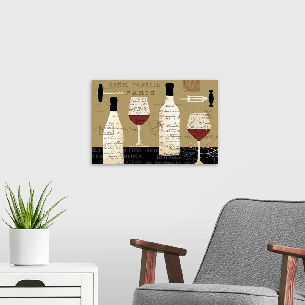Artwork perfect for the home of cork screws, wine bottles and wine glasses that has decorative text written over the piece.