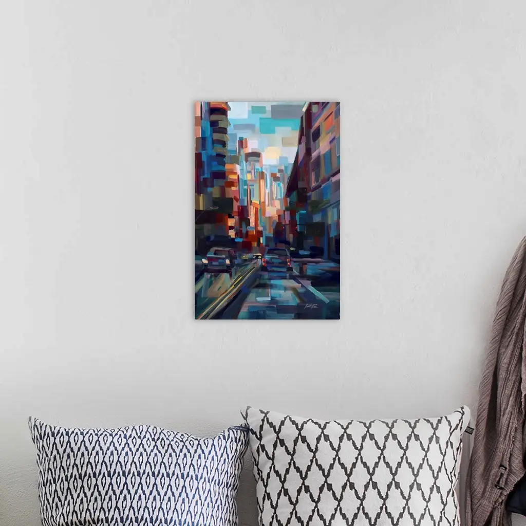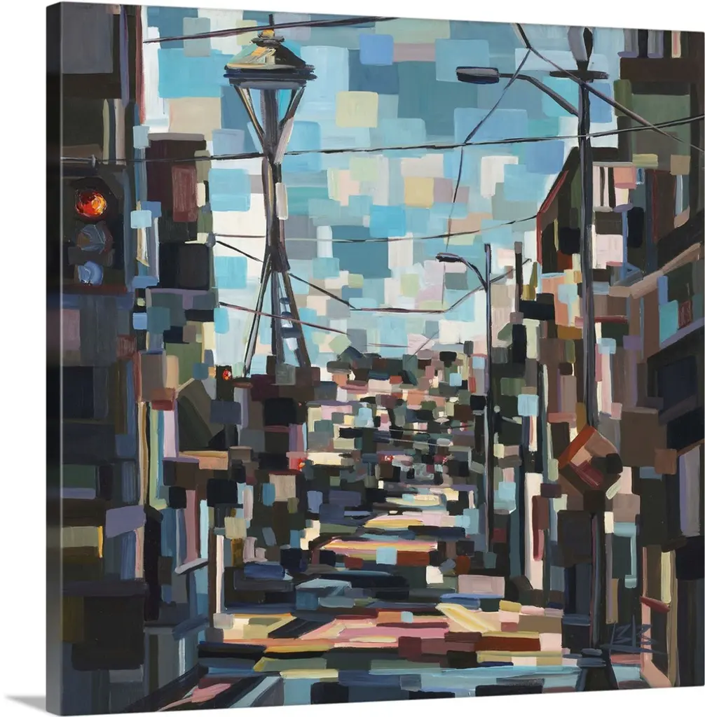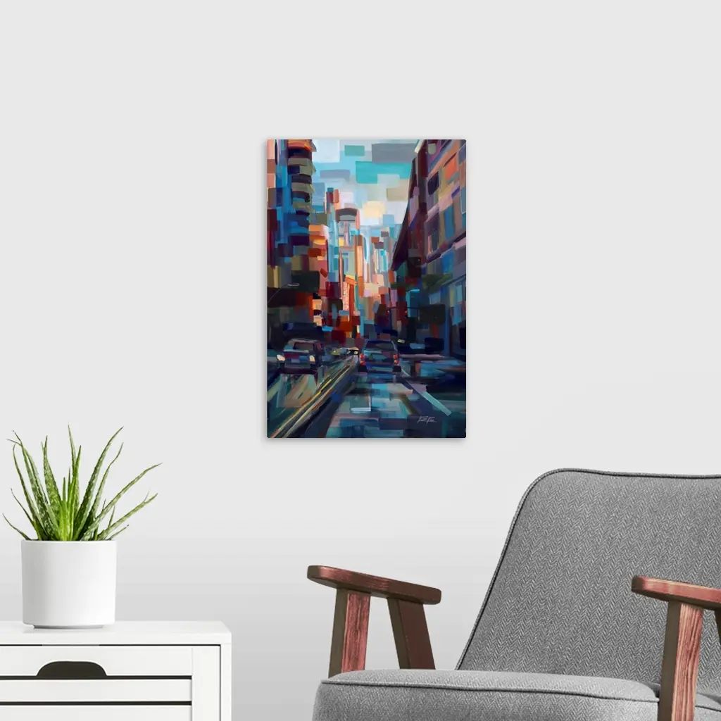 Contemporary abstract painting of an urban environment deconstructed into geometric shapes.