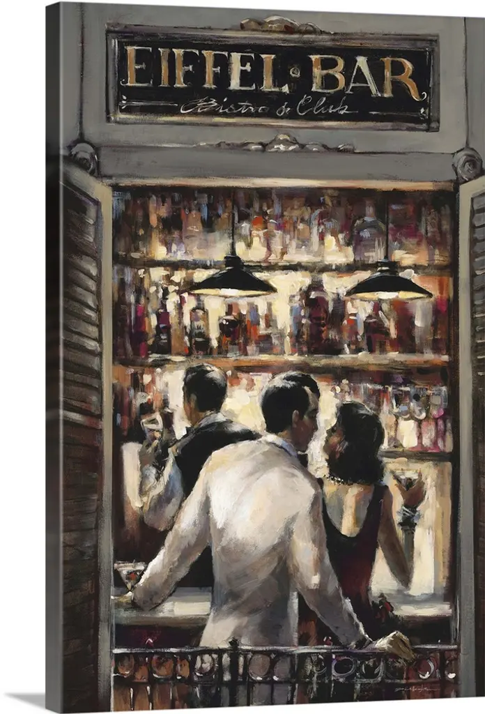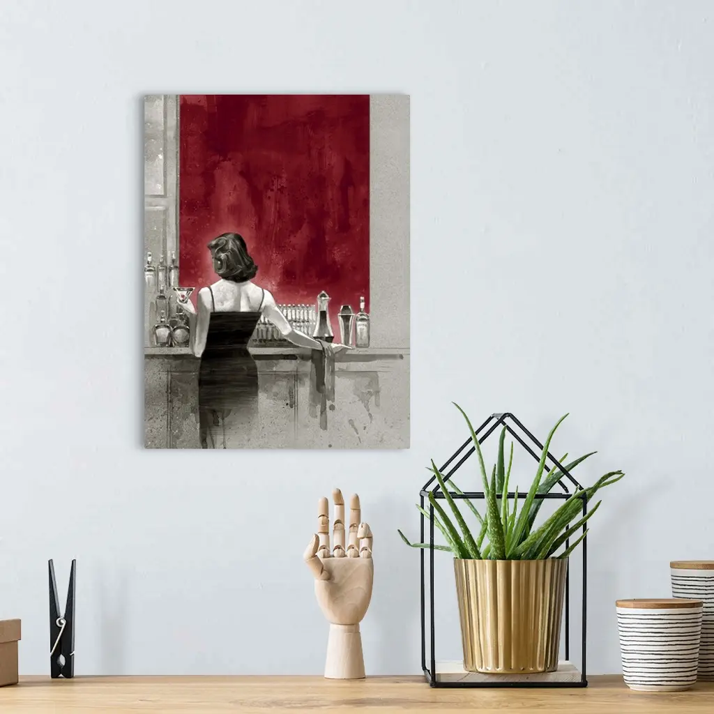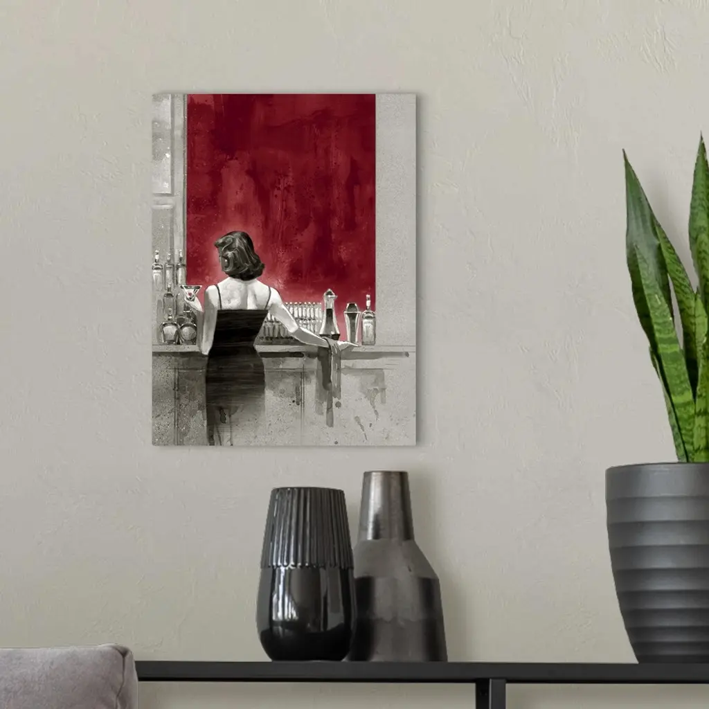 A painting of a woman in a dress standing at a bar with a vibrant red wall, with a drink in her hand.