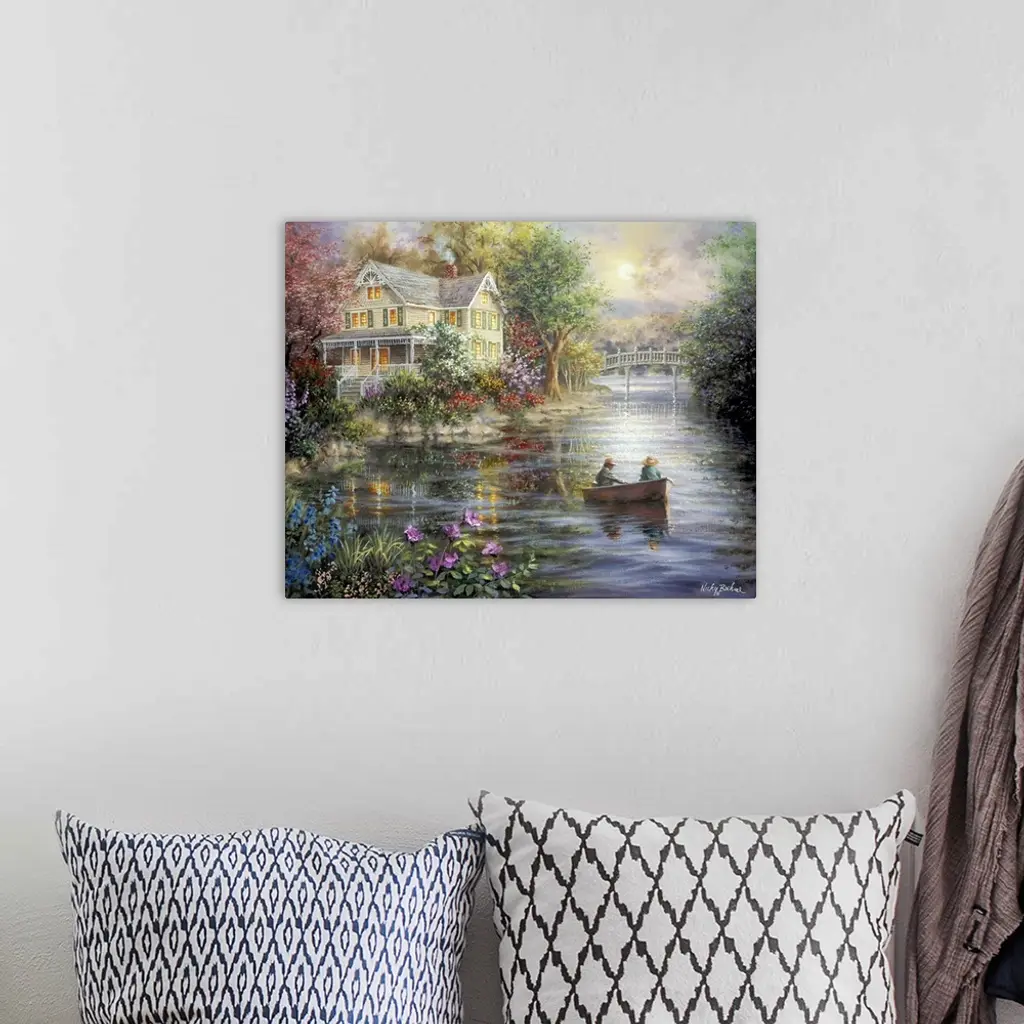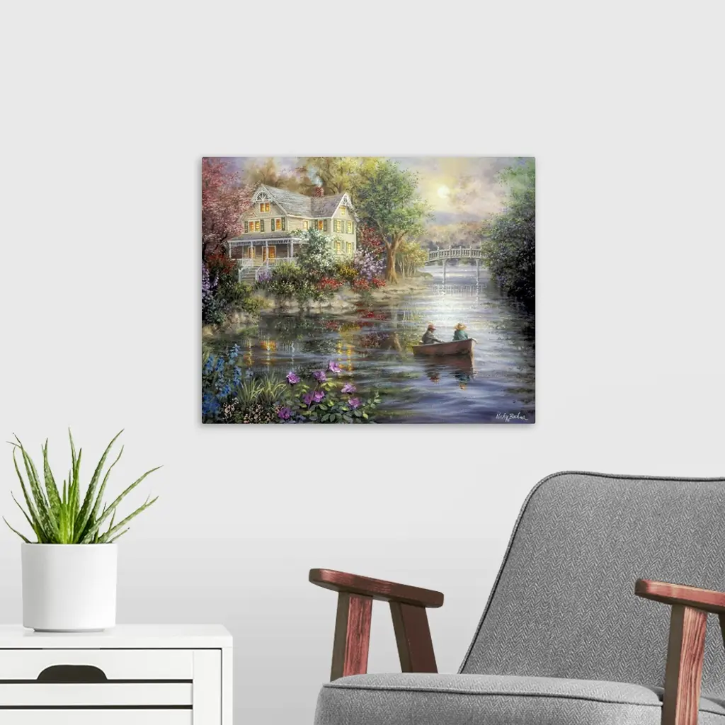 Painting of riverside scene featuring houses with glowing windows. Product is a painting reproduction only, and does not contain actual lights.
