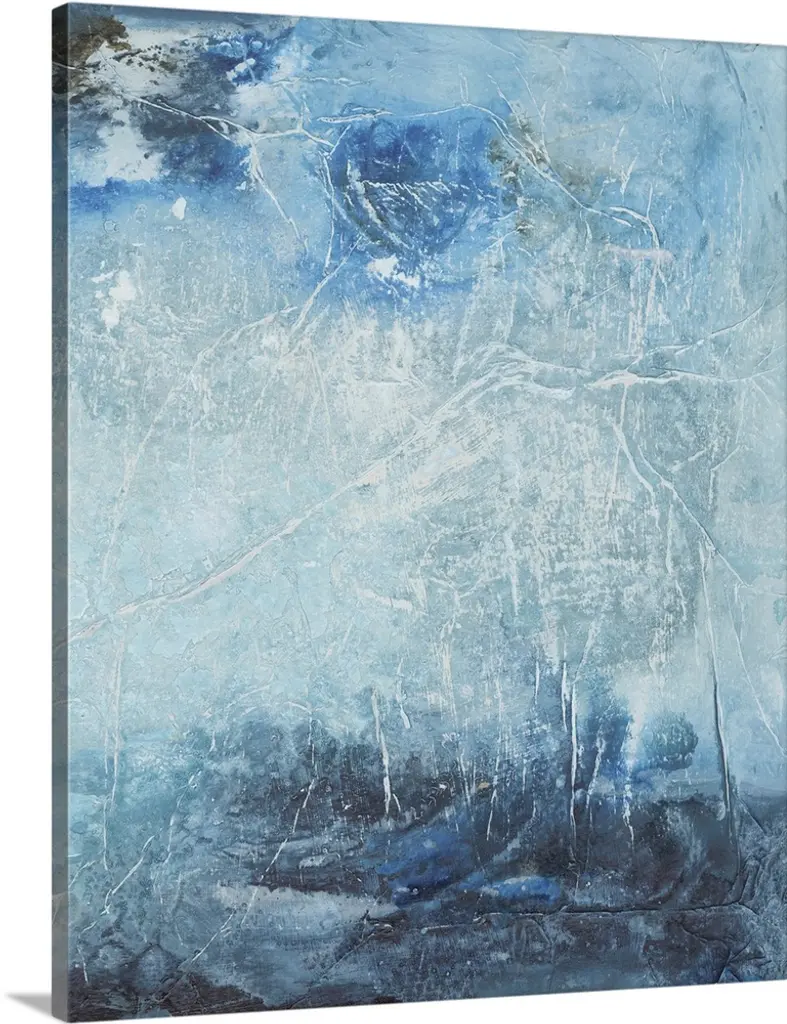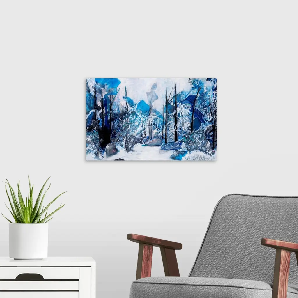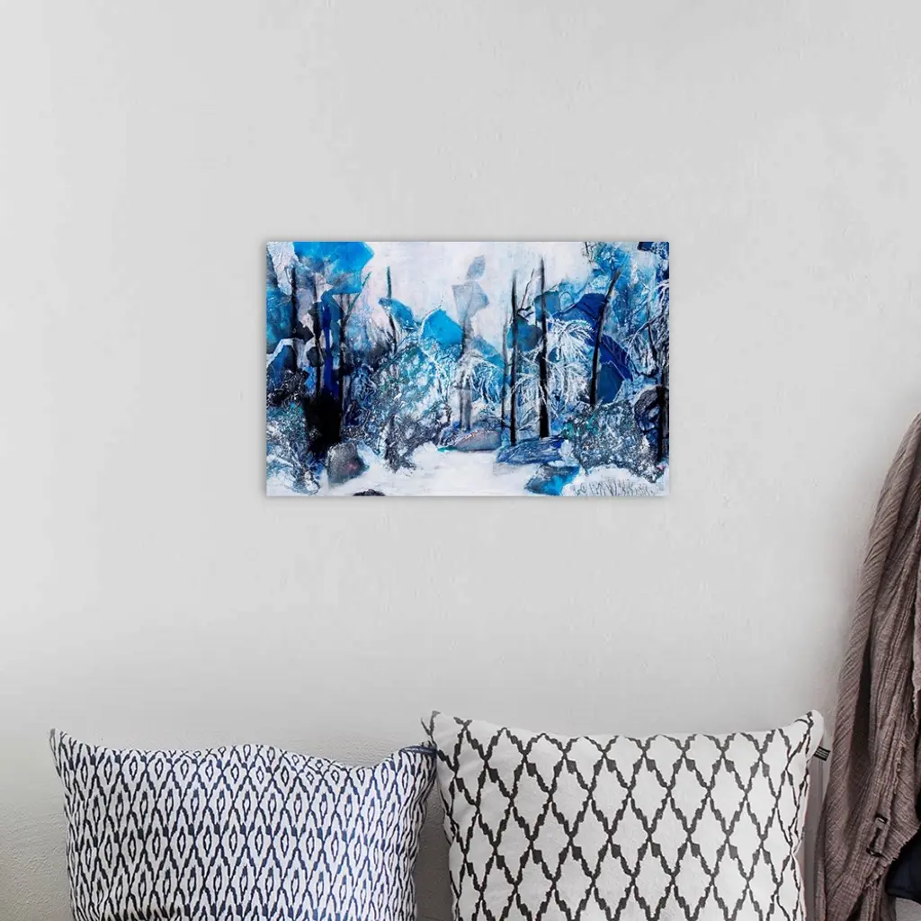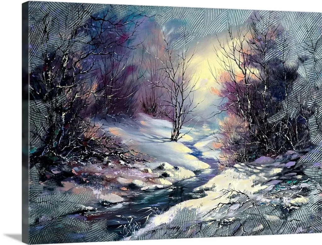 Painting of a winter landscape with the naked trees lurking in blue shadows amidst the heaps of snow shimmering with silver.