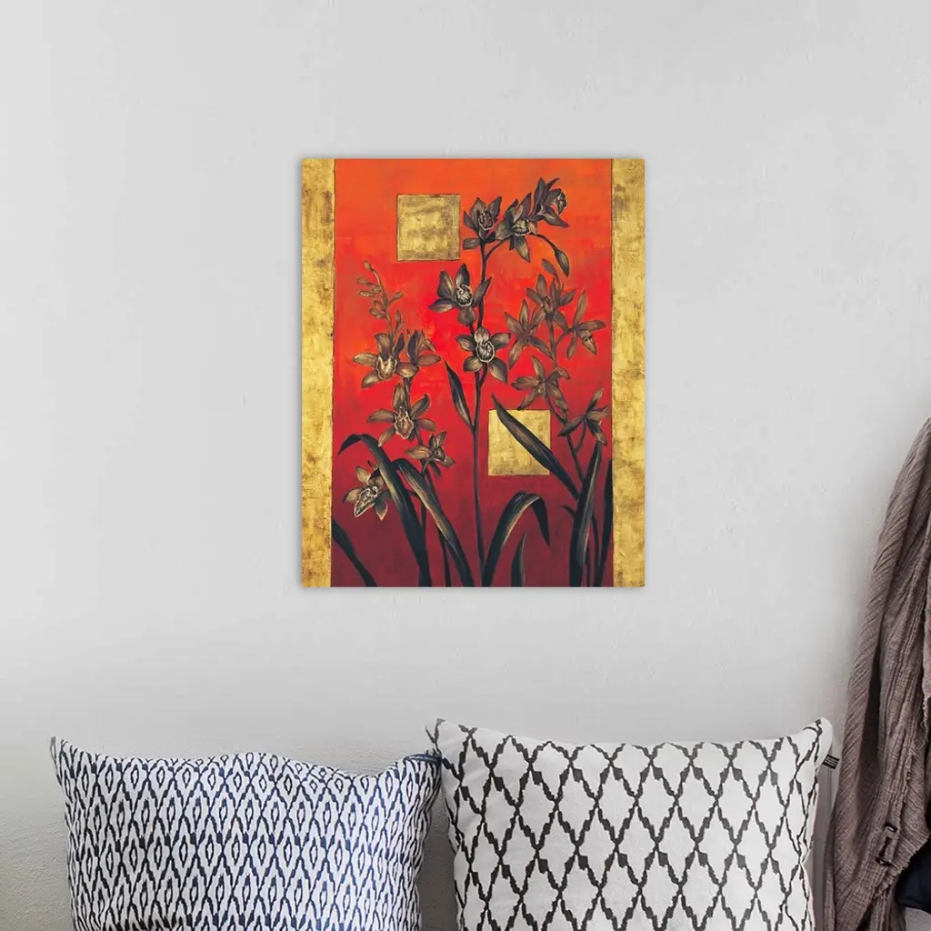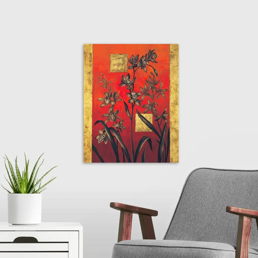 Contemporary painting of lilies on a bold red background with two golden squares and a vertical gold line on each side.