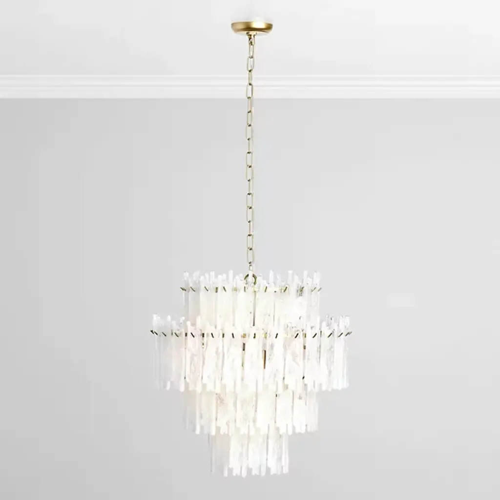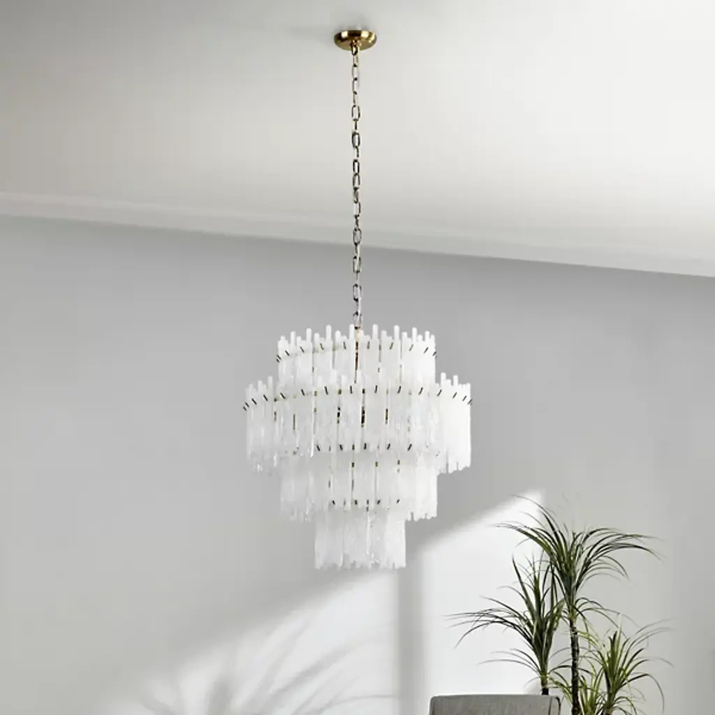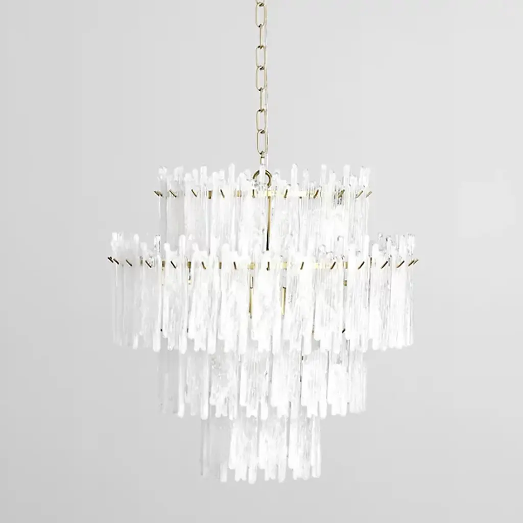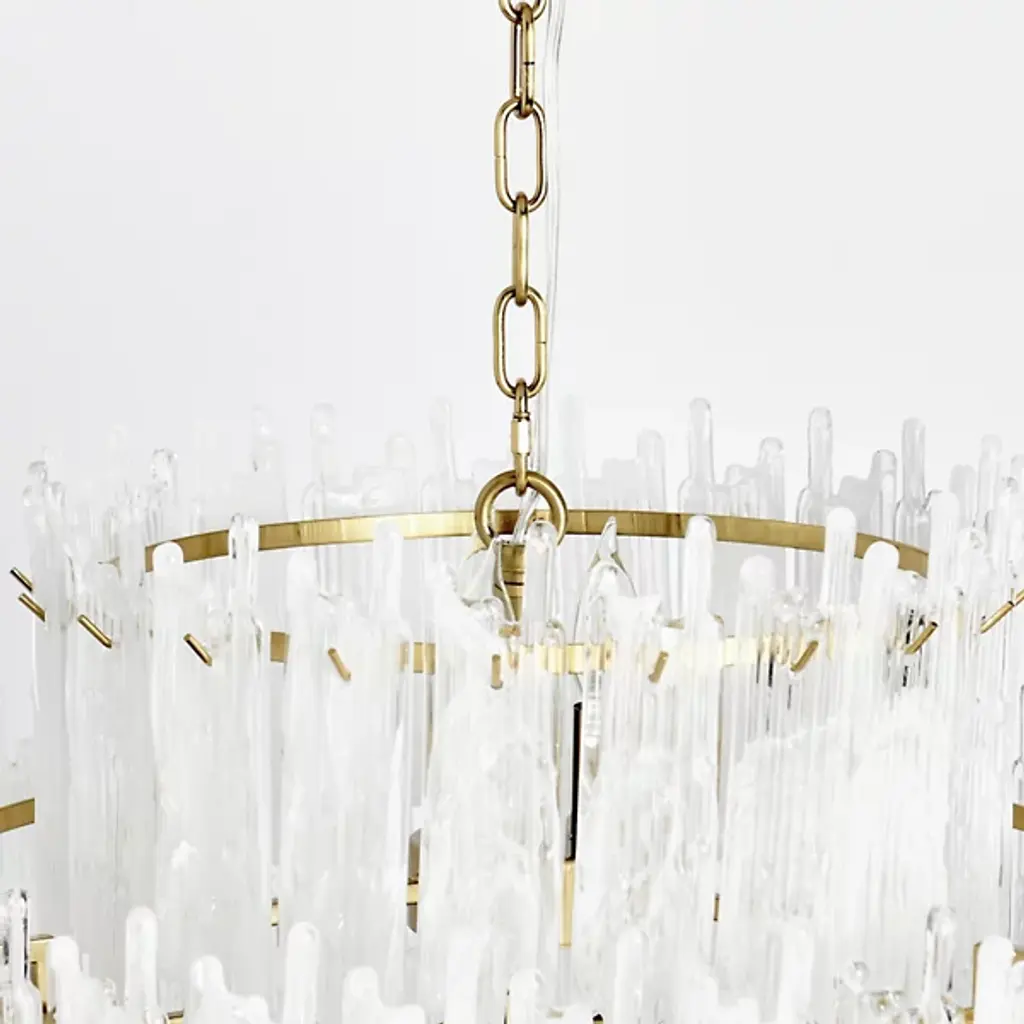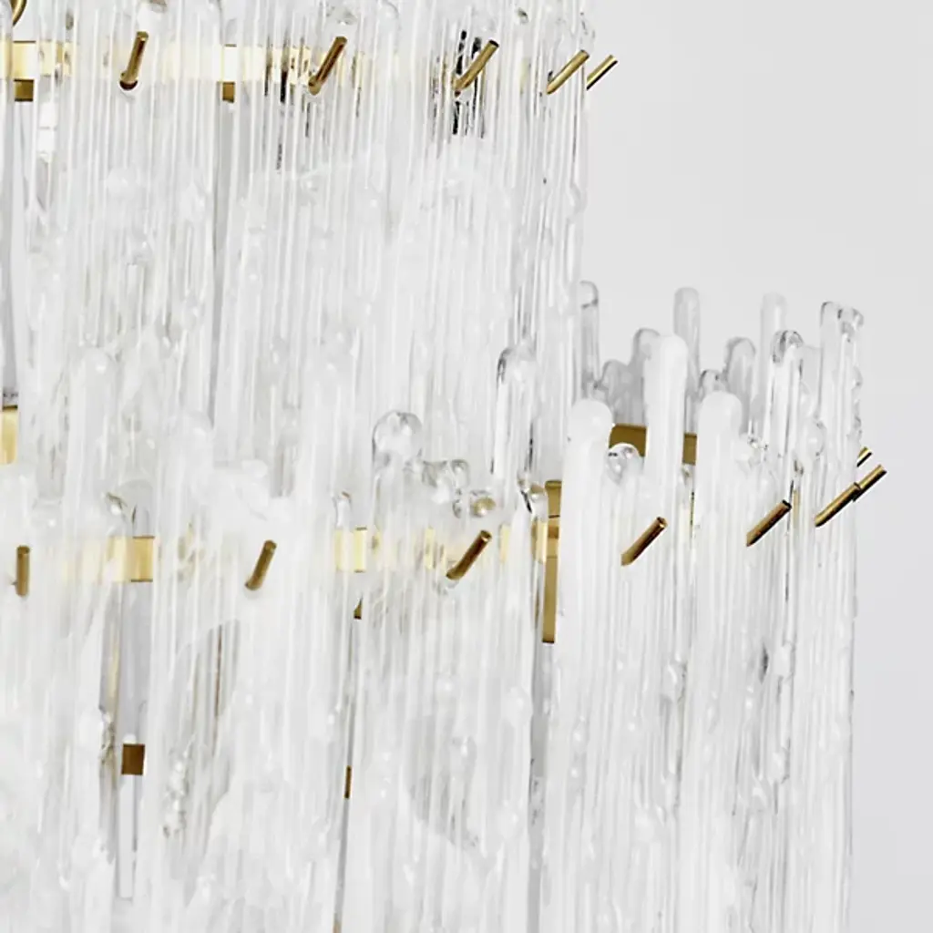 The Everly Chandelier by Classic Home transforms conventional illumination into an individual artistic expression of light and texture. Wax-drop glass cascades through four dramatic tiers, creating a mesmerizing dance of sparkling radiance. Each wax-drop glass plate is a unique art piece, suspended from a slender hook around the outer rim of each ring. The tall structure matches intricate Art Deco design with contemporary clarity, casting a mix of glittering brilliance and strong downlight that gloriously accents its surroundings.