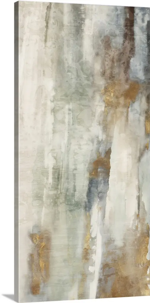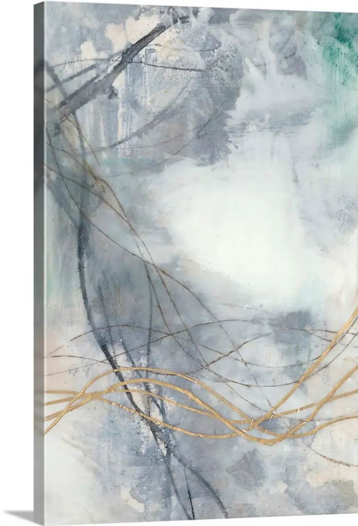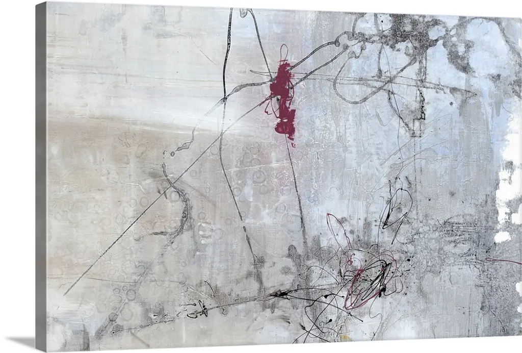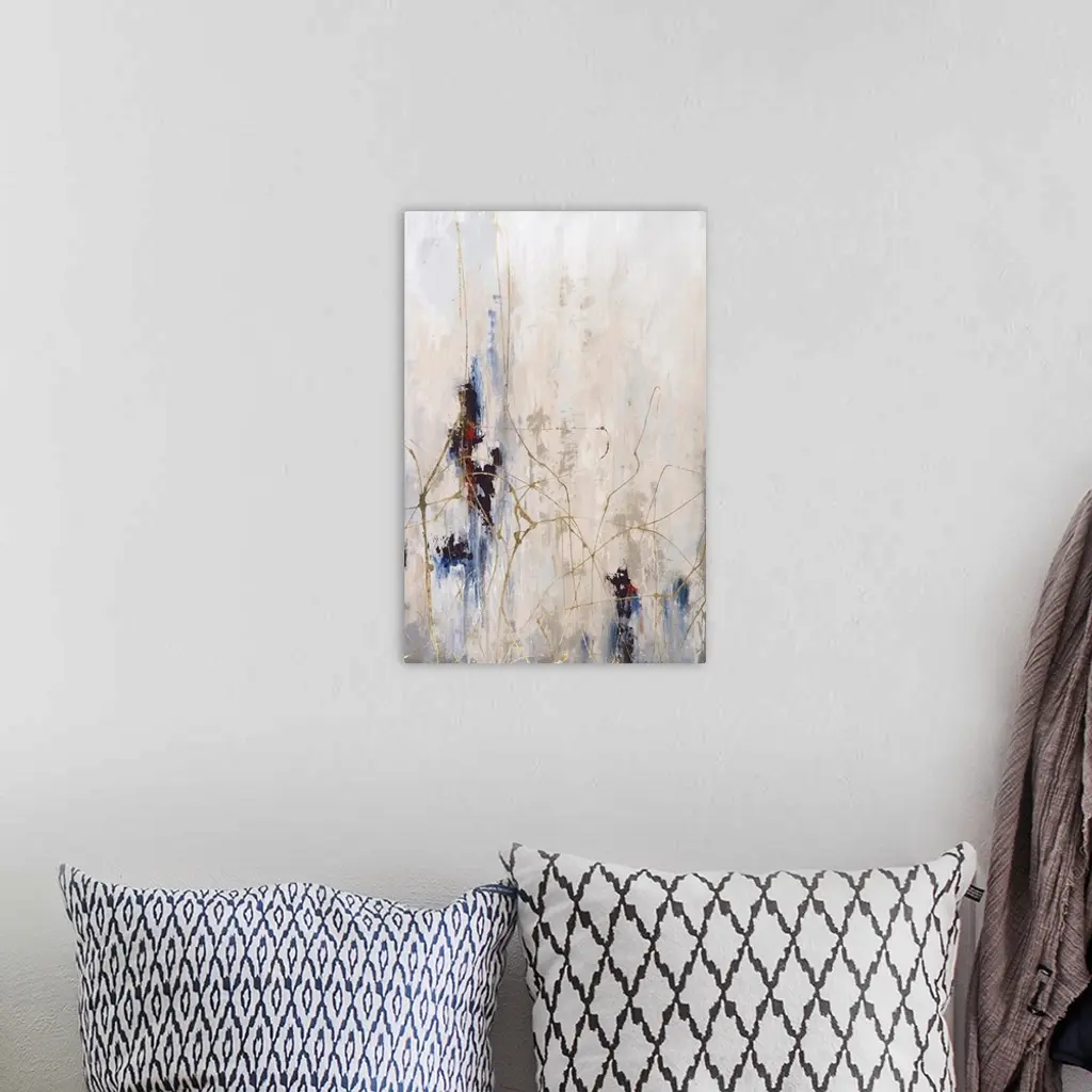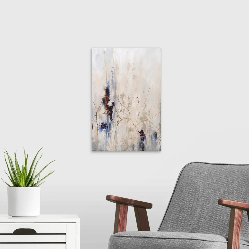 Large abstract painting with a neutral colored background and streaks of red, blue, and dark purple towards the bottom half and thin gold lines all over.