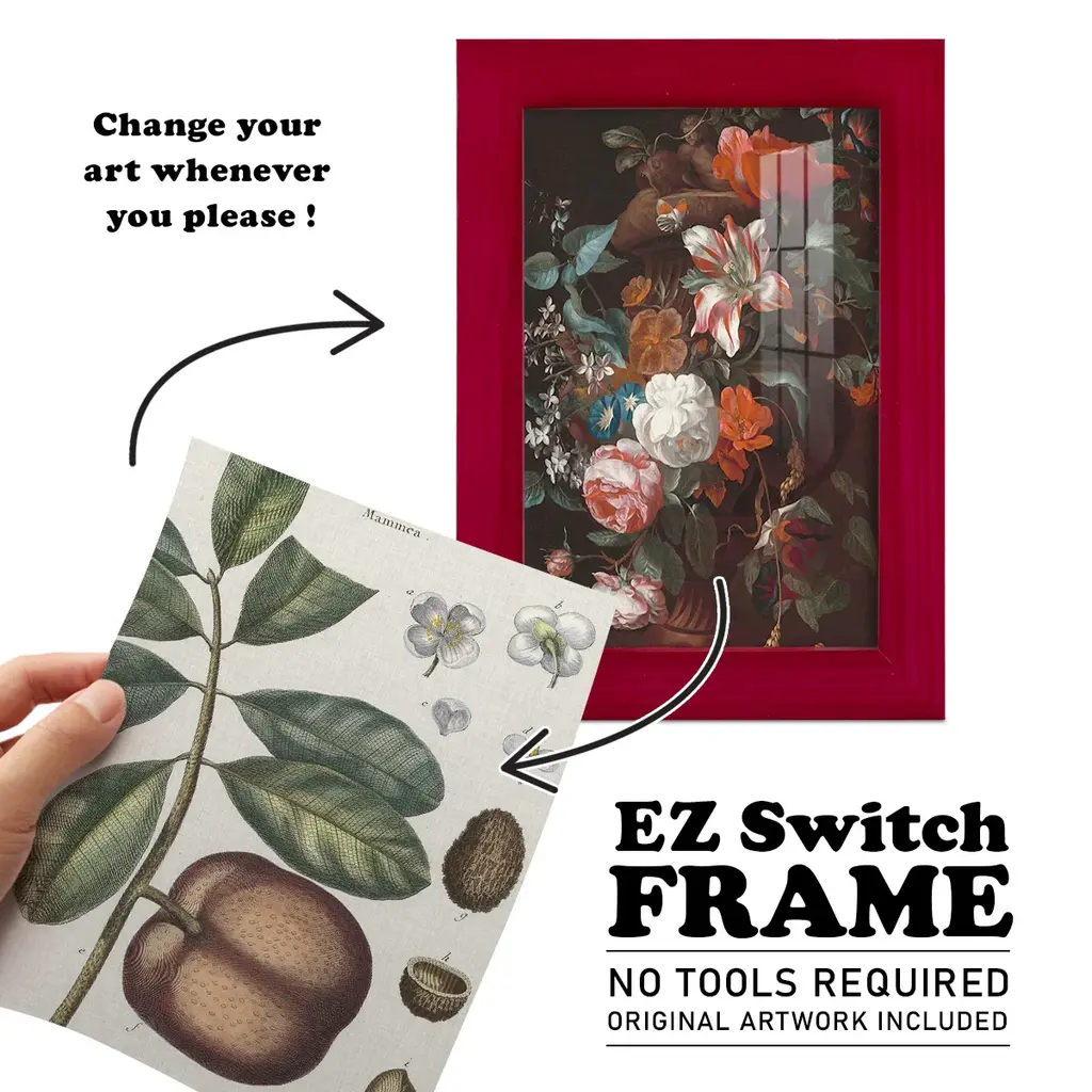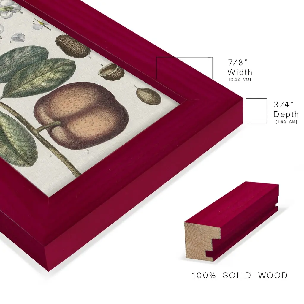 Exotic Botanique IV -EZ SWITCH Framed Print w/glass-Cherry Red A delightful, framed print. Featuring a solid wood frame with real wood glass. This premium print is giclee quality. In addition, every frame features a removable back and table top stand. This allows you to change your art in the future or to just stand the art on a table for a new look. We are sure you'll enjoy our new series of EZ SWITCH Framed Art. Solid Wood Frame Real Glass Removable / Replaceable Art Built in Tabletop Stand Sizes range from 4x6 up to 12x15 - buy just one or pair them up as sets as you see fit.