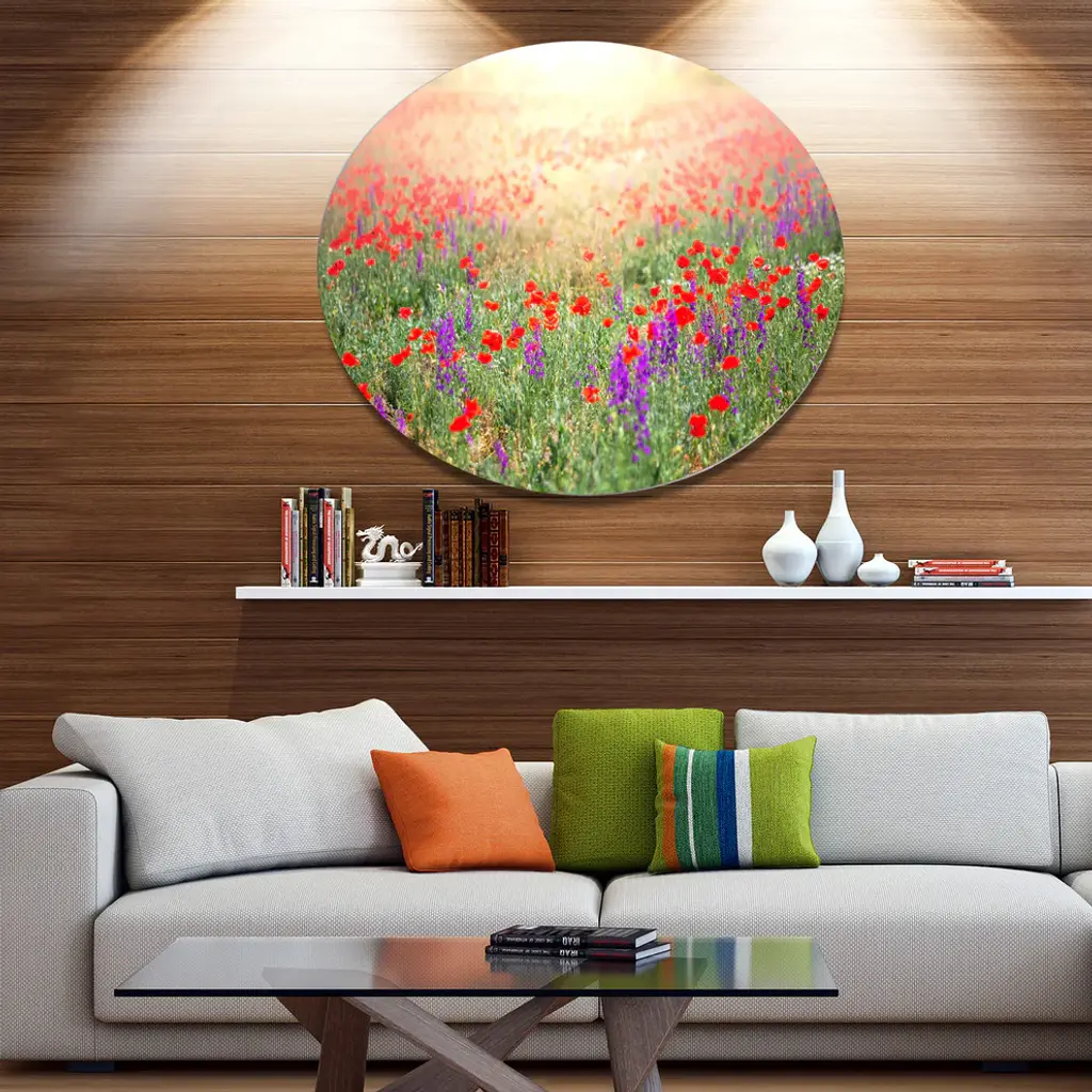Expansive Poppy Field At Sunset, Flower Round Metal Wall Art, 36"