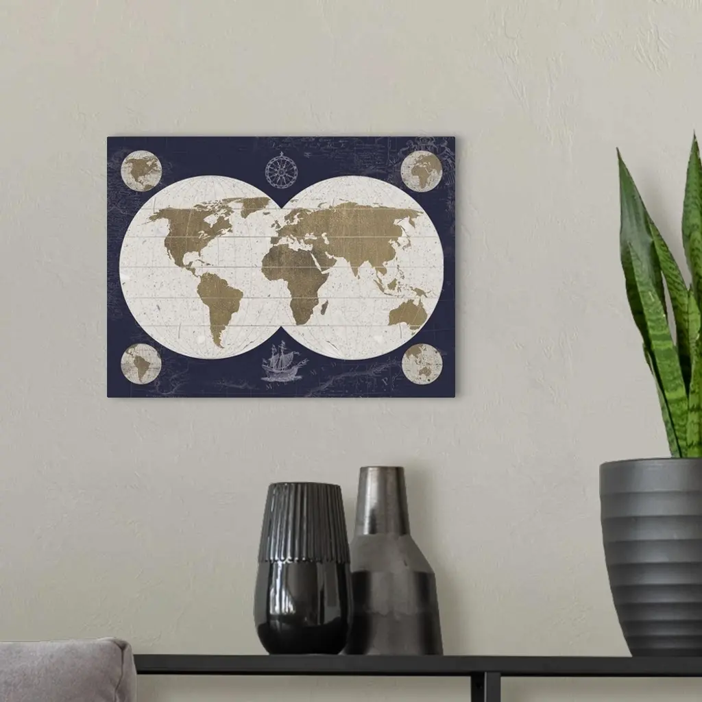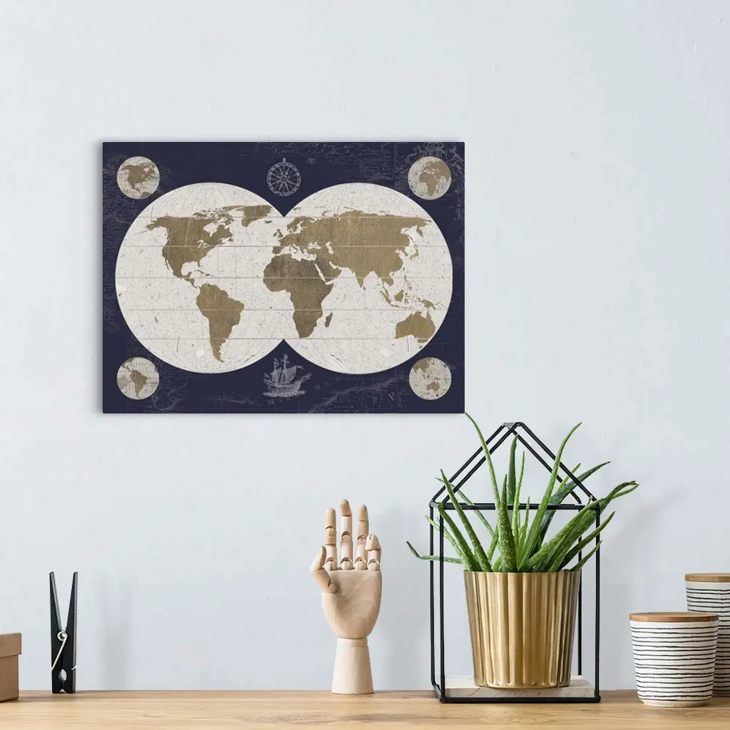 Artwork of an antique old world explorer's map, against a dark blue background.