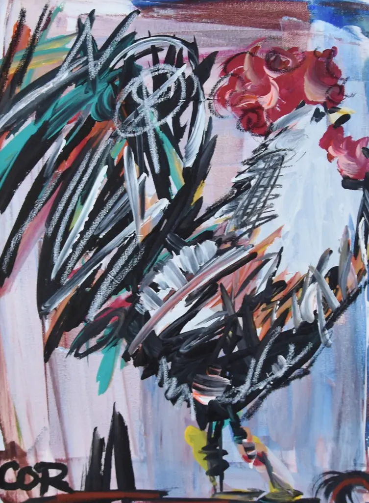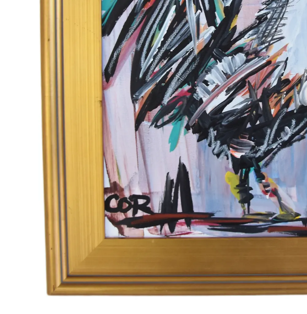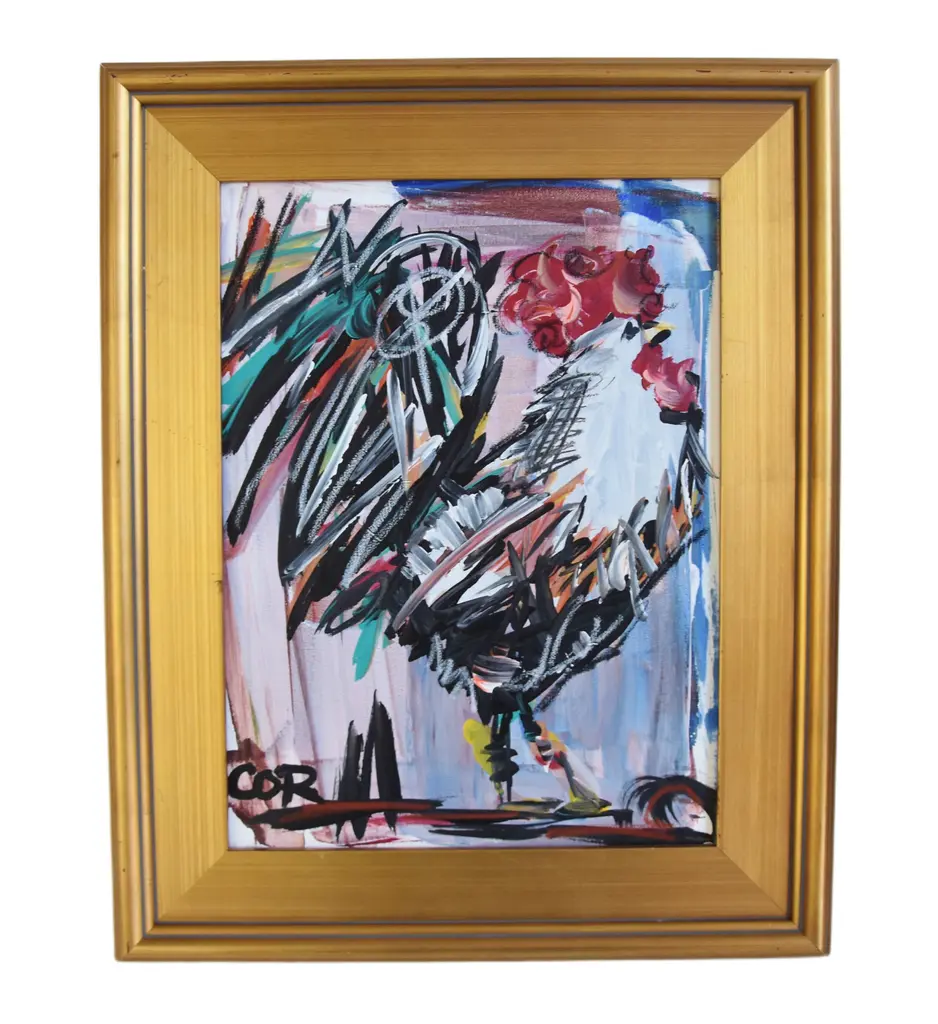 Contemporary, modern expressionism original one-of-a-kind chicken hen rooster portrait oil painting on stretched artist's canvas. The artwork is by the talented artist ���Corbellic” and includes a certificate of authenticity on the reverse. The artist initialed the painting on the lower left corner and reverse. Included are the antiqued gold wood frame and hanging hardware/wire. Dimensions: Artwork, 12"L x 16��H; overall, including the frame, 17�������L x 21"H. Excellent, beautiful condition!!!!
